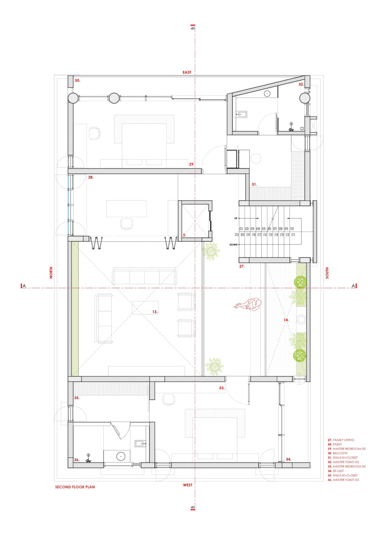 On the  Second floor, the layout shifts to a more private tone, with two large master bedrooms, family living, and a study with library space. Each space is extended with balconies facing the garden, offering shade and transitional zones between indoor and outdoor. These spaces allow for leisure and contemplation while maintaining visual continuity with the exterior.