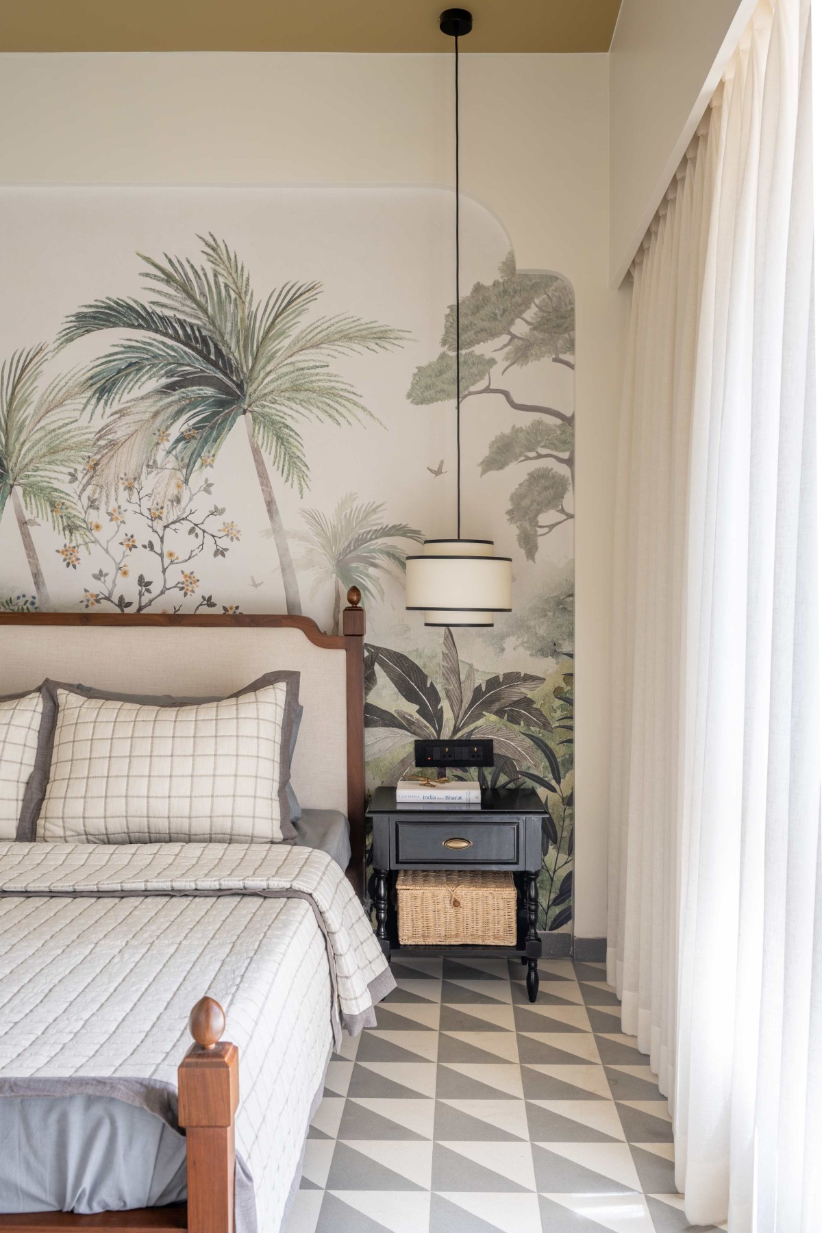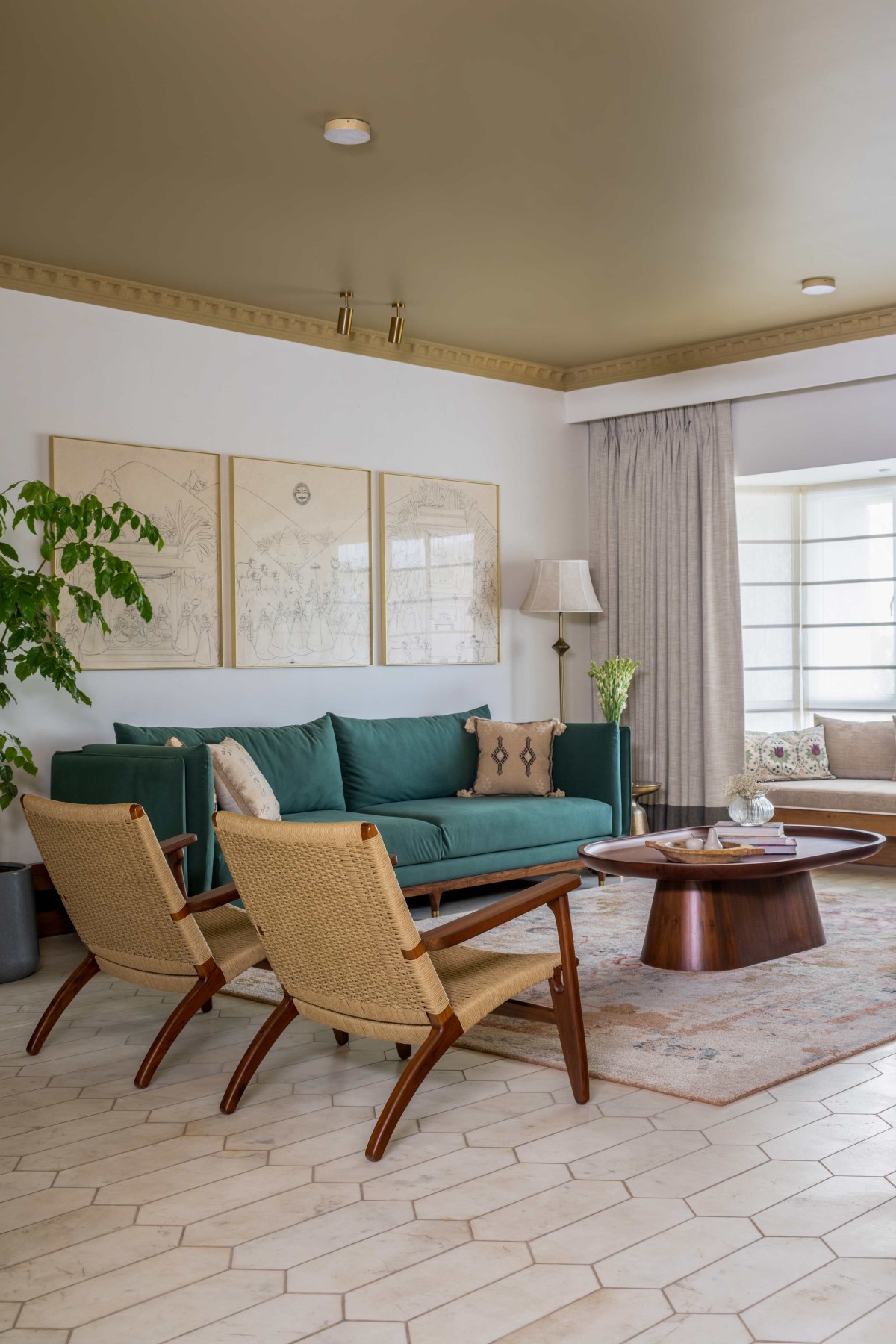 To be honest, there are multiple elements in this house which adds to the space without competing with the other elements. May it be a long hexagonal flooring in the living room, flooring in the media room inspired by the works of Raza, ceiling cornice running around the living room, pale mustard colored ceiling in the living/dining or Indian arches for the openings.