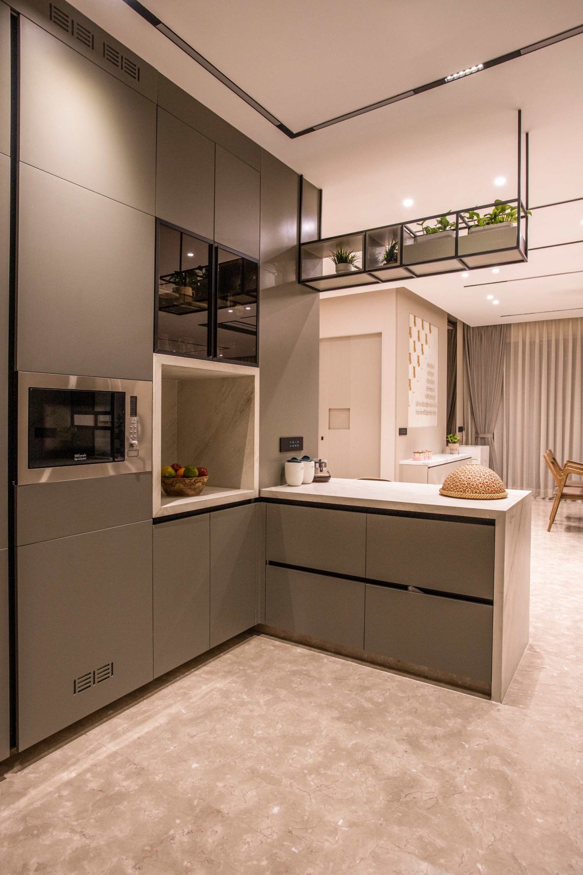 The kitchen flows directly into the dining area, making the whole space feel large and perfect for family time. The modular cabinets are designed with clean lines and no clutter, giving the kitchen a very sophisticated and high-end look.