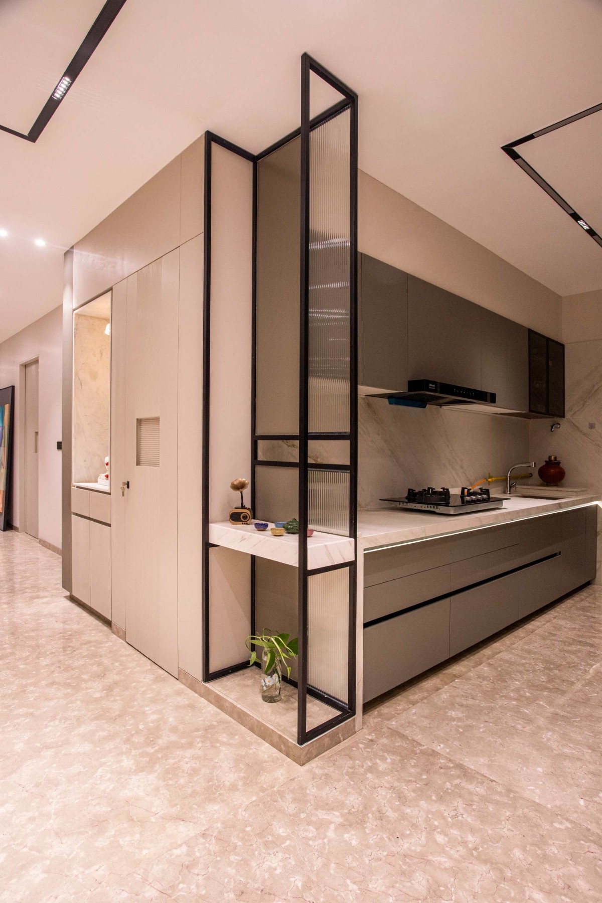 Everything is tucked away in sleek, hidden cabinets to keep the countertops clear and the room looking tidy. The kitchen uses the same marble and wood tones as the living room, so the whole home feels perfectly coordinated.