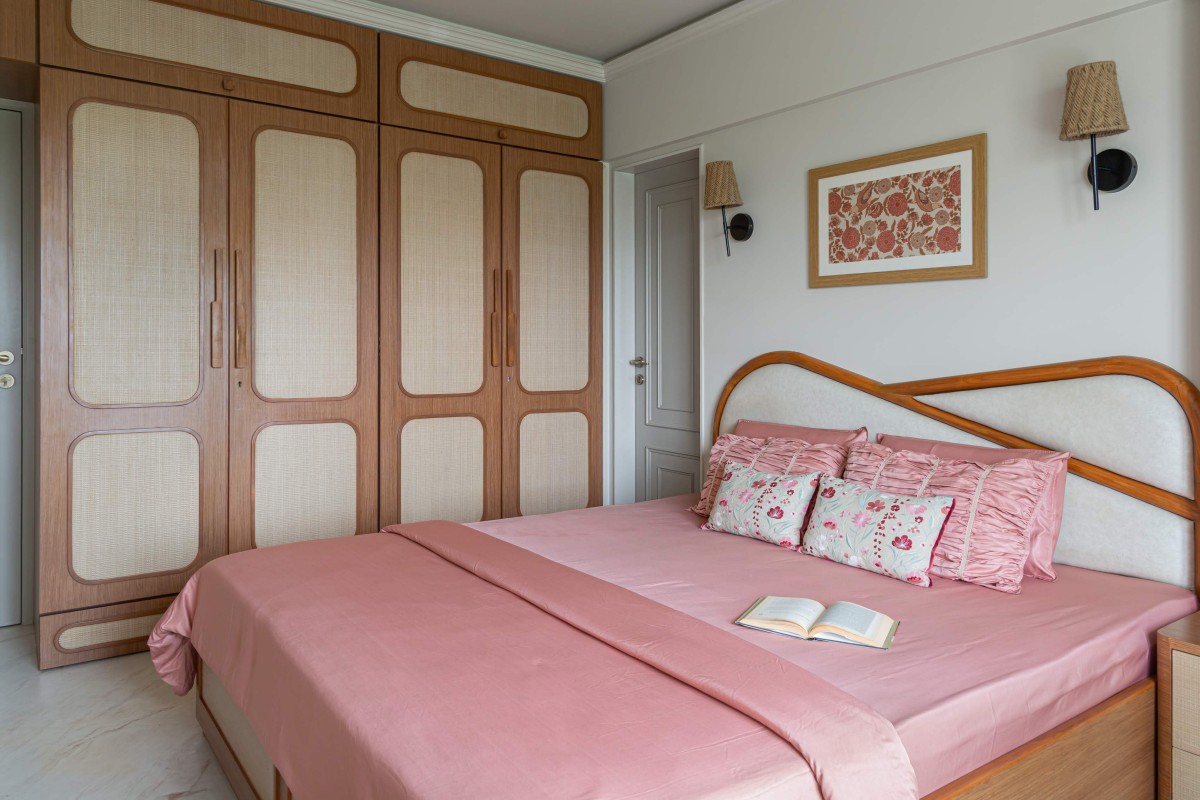 Each bedroom has its own character yet remains cohesive through cane accents, light woods, and discreet storage. Bathrooms vary in tone terrazzo boldness, playful decals, or calm whites while the mandir and refurbished cane furniture echo restraint and care.