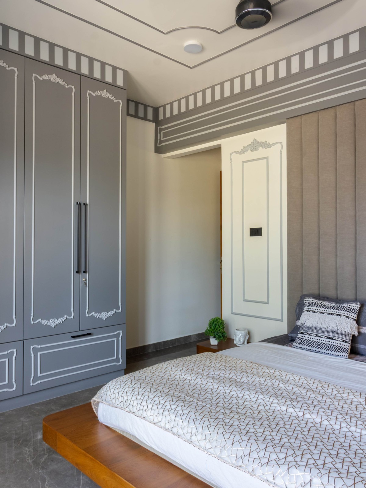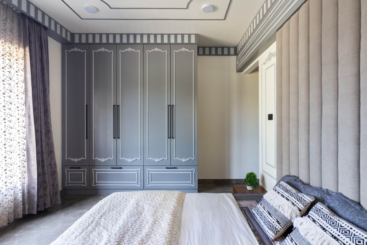 The first master bedroom follows a European aesthetic, where elegant mouldings, soft grey hues, and a restrained palette come together. The second master bedroom, defined by its sloping roof and generous ceiling height, is a more dramatic yet intimate space, enriched with intricate wooden detailing that adds character.