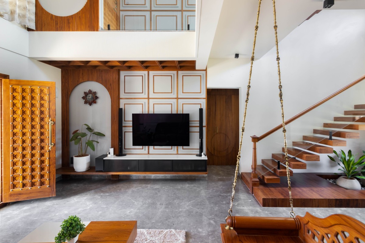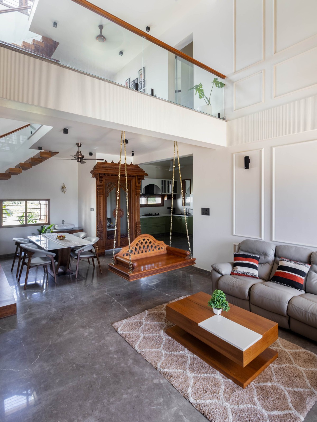 The living room is conceived as the heart of the home, where traditional aesthetics seamlessly blend with European design elements. Intricately carved natural wood elements—most prominently in the puja unit and the main entrance door—root the space in cultural depth. Soft daylight filters in through the skylight, creating ever-changing patterns of light and shadow that enliven the interiors throughout the day. A sculptural staircase with floating wooden treads adds a sense of fluid movement and continuity. The open kitchen integrates with the living and dining area, adding a sense of openness.