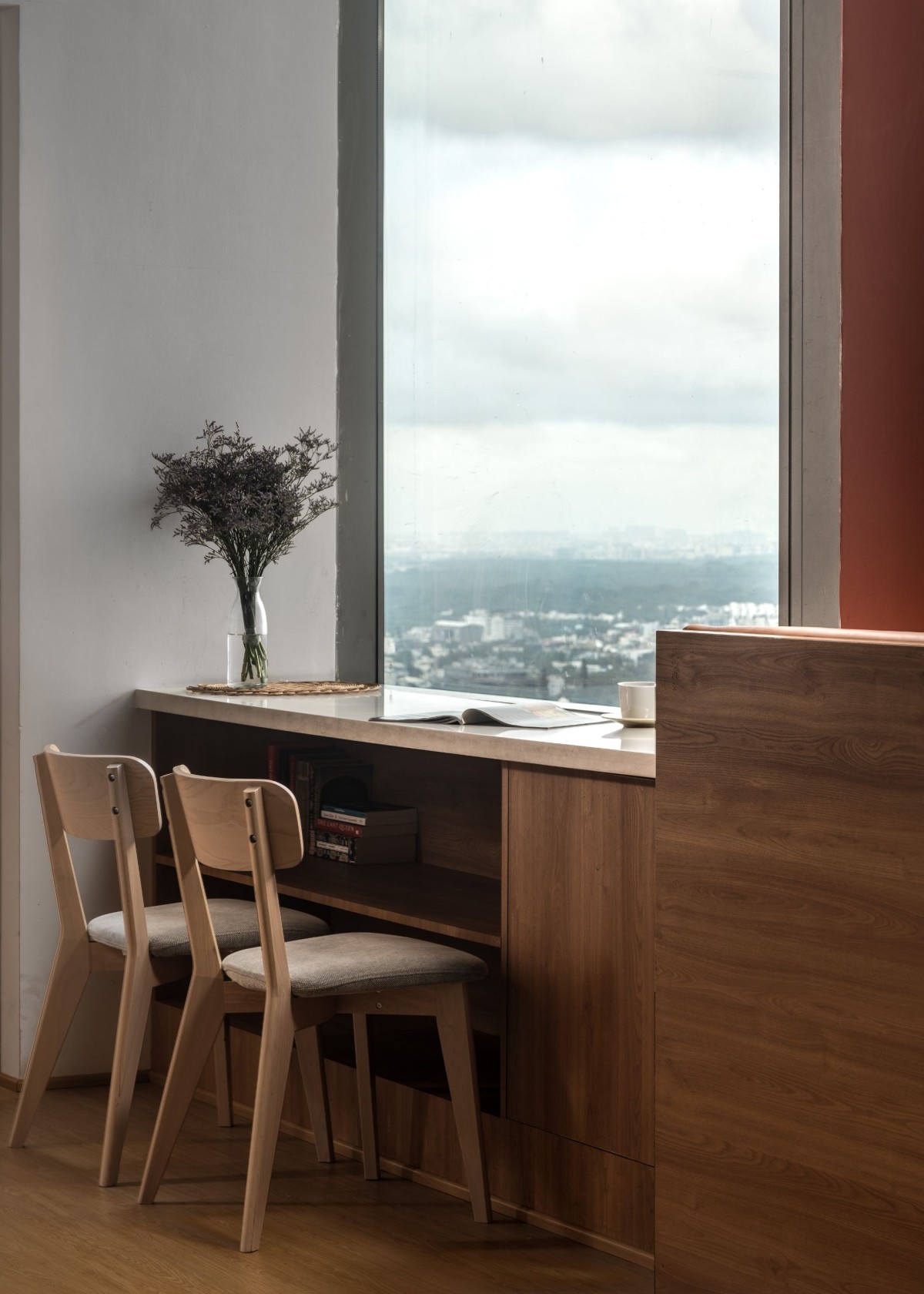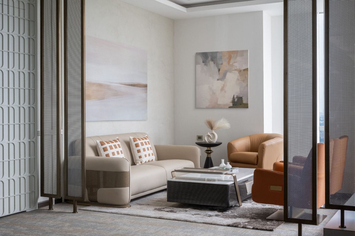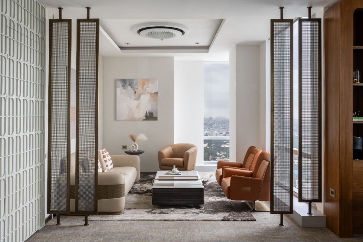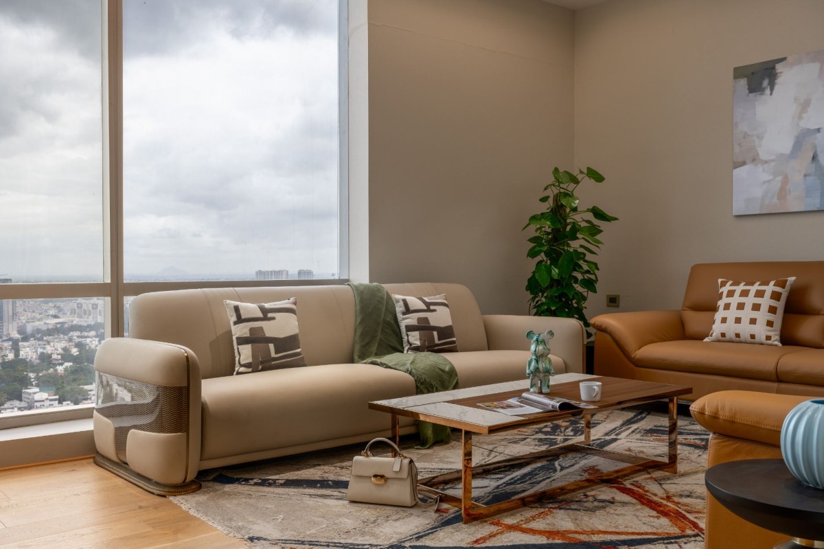 “A Serene Urban Retreat” The living space blends comfort and elegance, with plush seating that invites conversation. Neutral tones are lifted by patterned cushions, a textured rug, and curated decor that adds character without clutter. Large windows flood the room with natural light, offering expansive city views and connecting the indoors with the outdoors.
