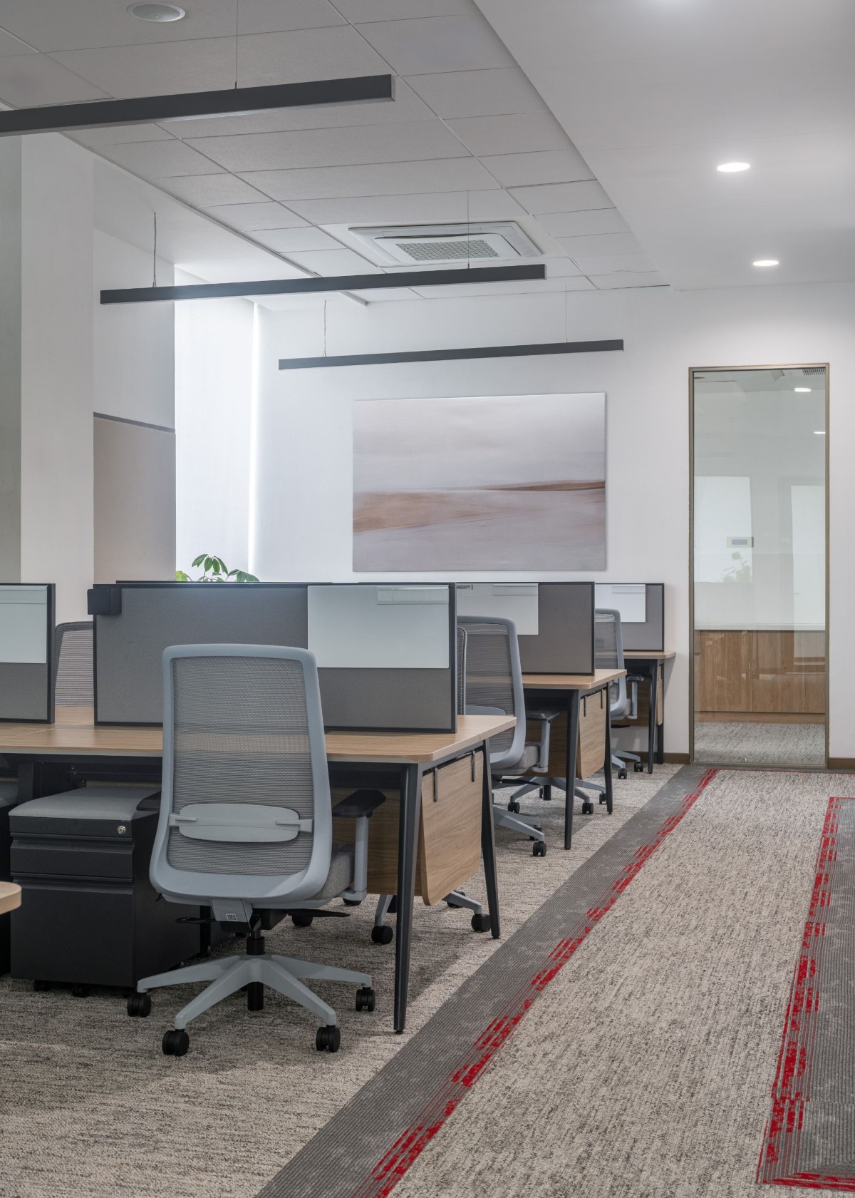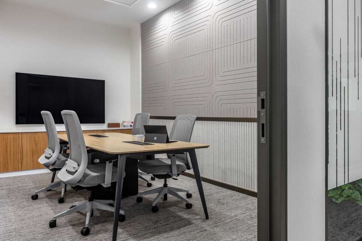 Tucked into a far corner past the design team of turnkey 5.0, a surreal artwork sets a tone of creativity and quiet escapism. This mood extends into the adjoining CXO cabin, where a contemporary work table and storage in rich veneer the room with a sense of refined authority. A transparent partition wall subtly defines the space, offering privacy without closing off natural light. Every element from the muted walls to the elegant storage solutions is intentionally restrained, offering clarity without coldness. This is where minimalism meets comfort, and functionality is wrapped in sophistication
