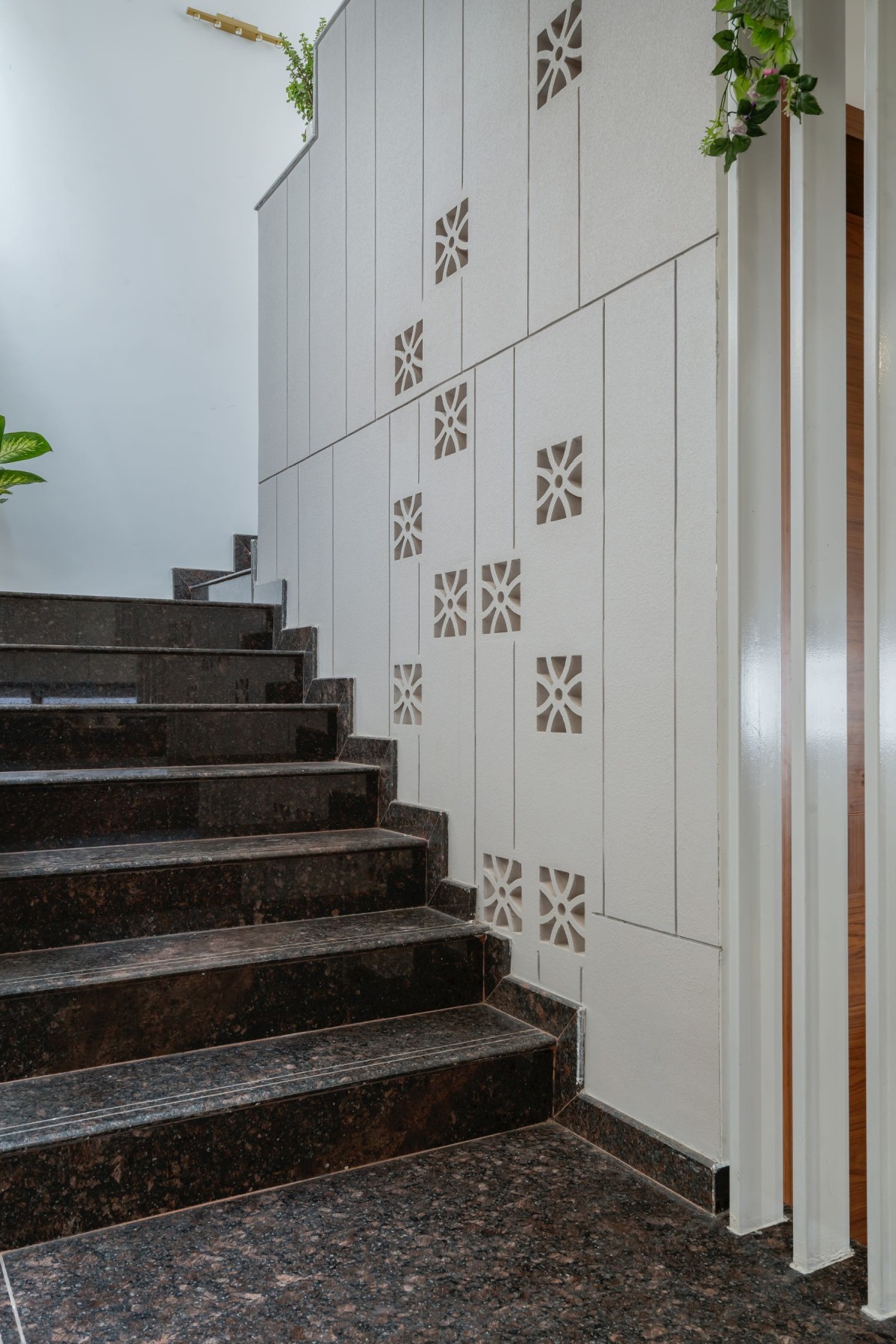Material selection remains restrained and purposeful. Kota stone flooring was chosen for its durability, thermal comfort, and understated character, lending continuity across spaces. Granite is used for copings and framing elements, providing robustness at points of contact and exposure. Glass railings maintain visual lightness, reinforcing vertical connectivity around the courtyard. The façade incorporates brick cladding, grounding the exterior expression and introducing material depth without excess ornamentation.
