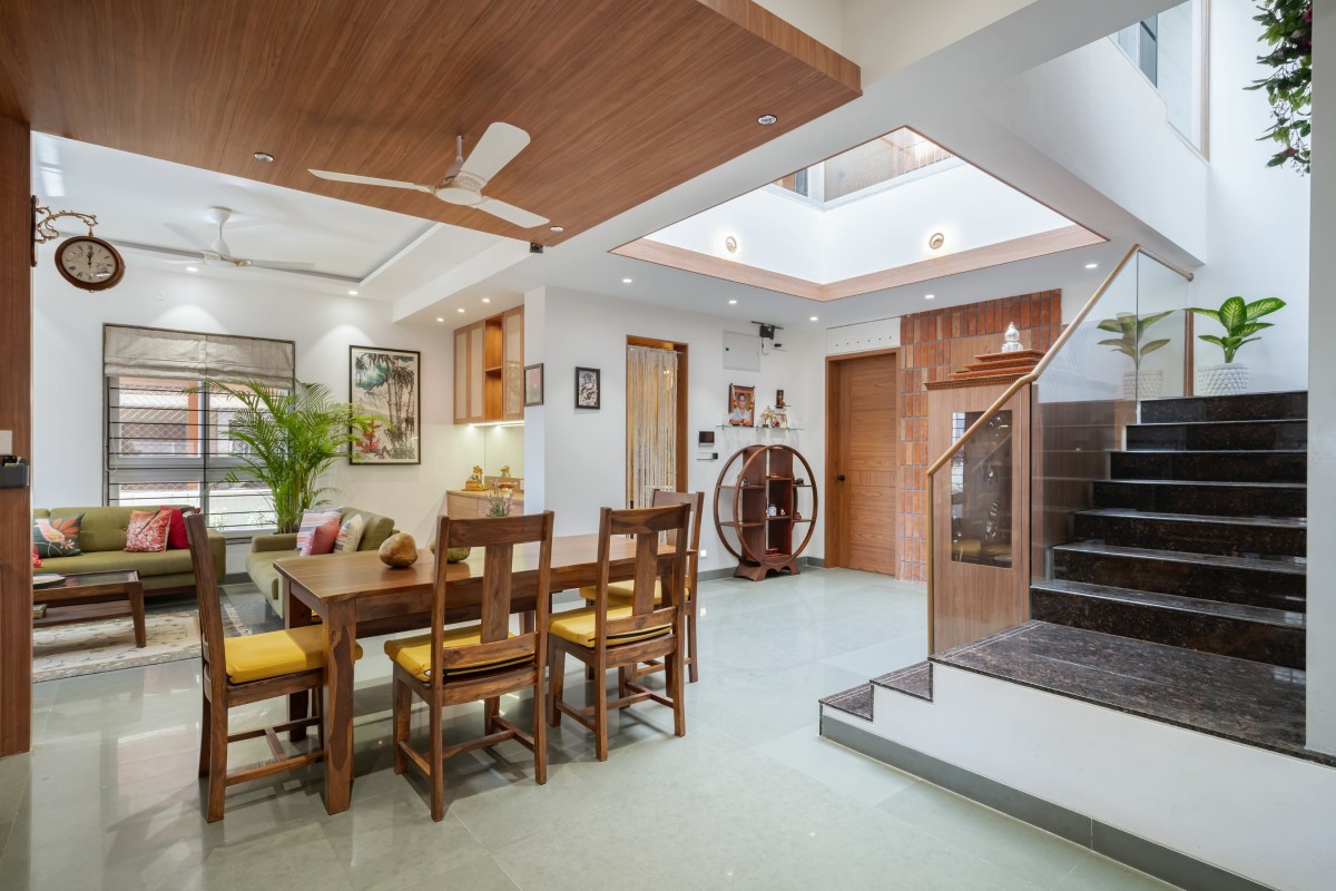 The spatial configuration follows a disciplined inward-looking strategy. The ground floor is largely open, allowing the living, dining, and circulation spaces to flow seamlessly into one another. Only bedrooms and essential private spaces are enclosed. This arrangement reflects both vernacular influence and contemporary flexibility, enabling the house to expand during gatherings or contract for intimate daily living.