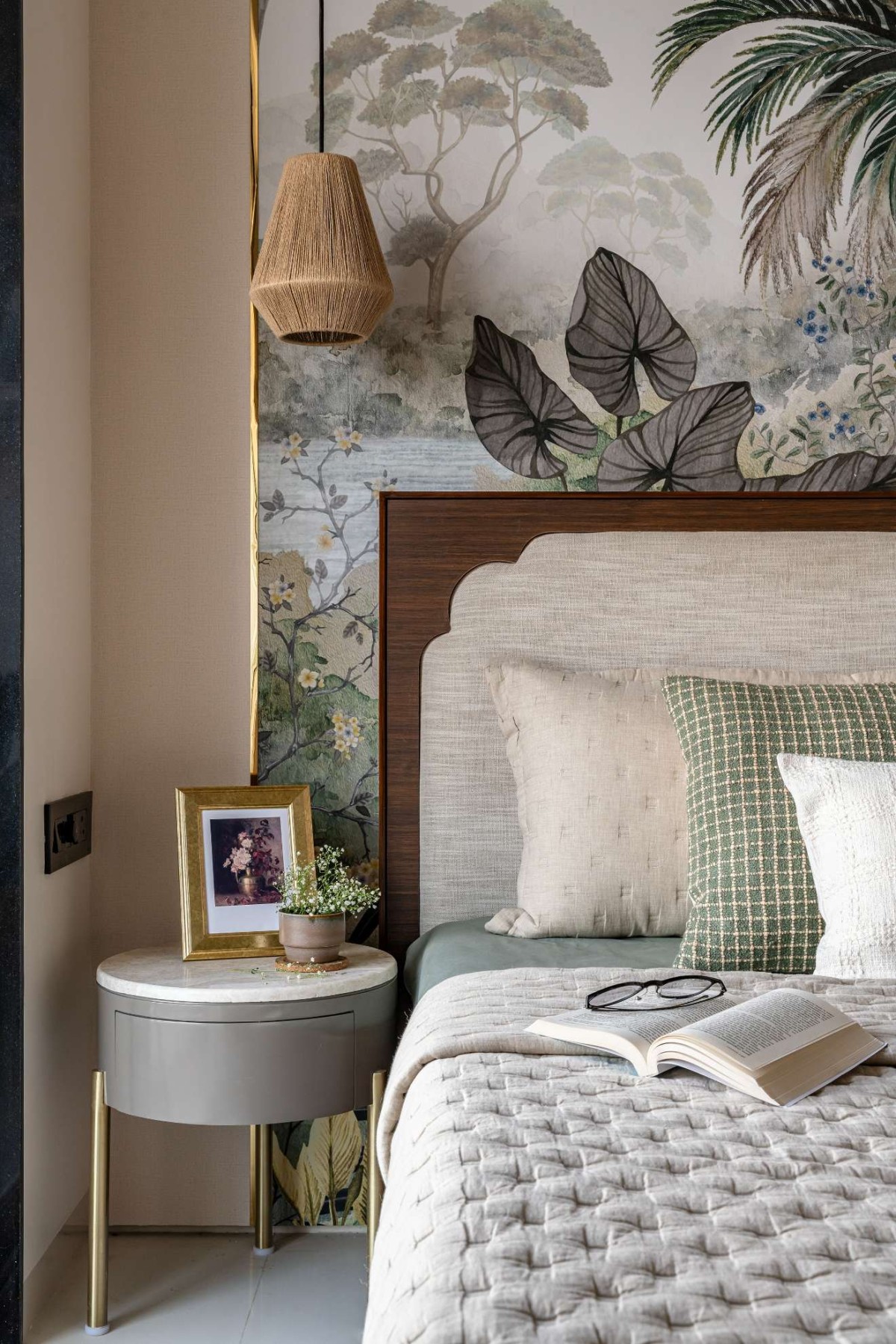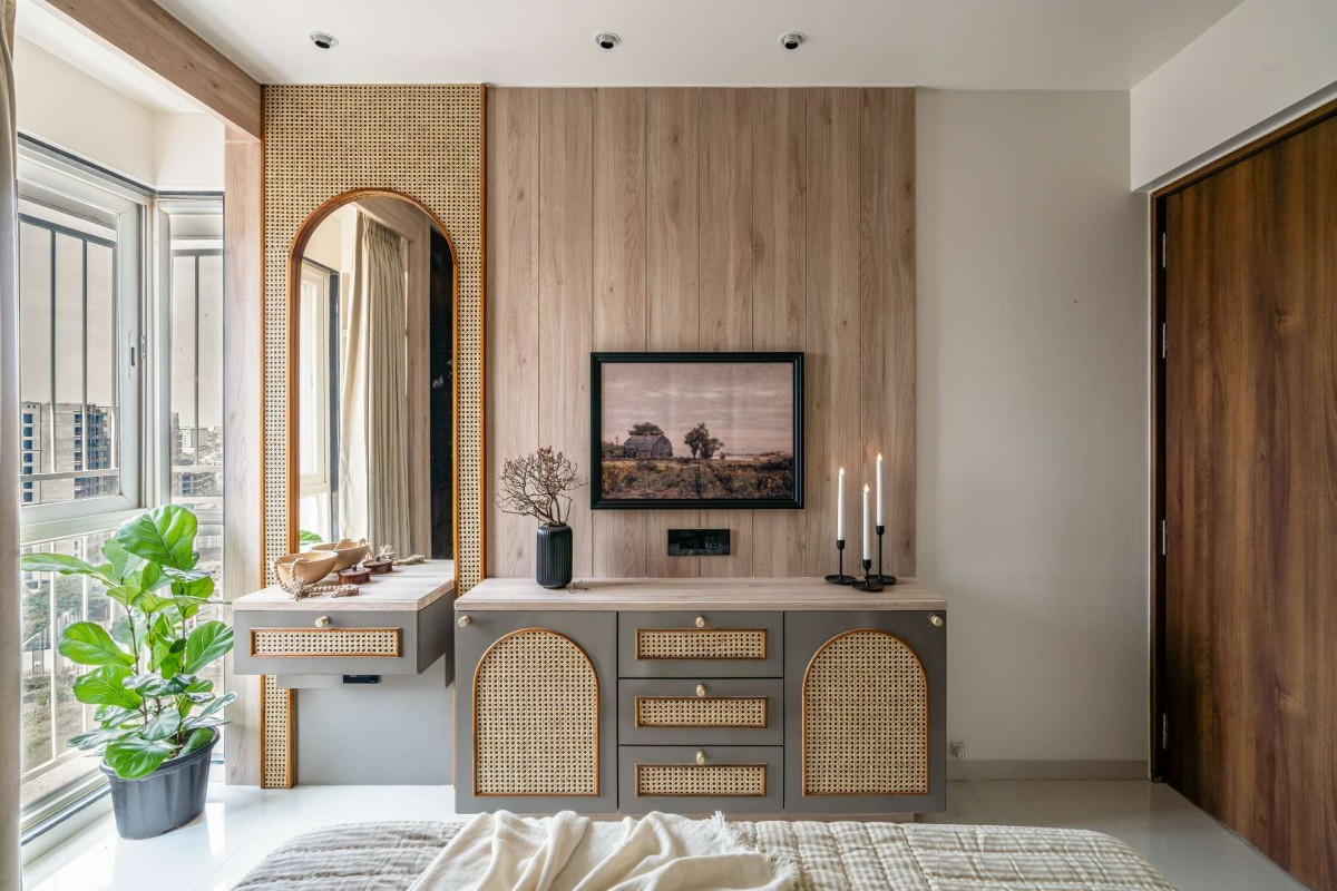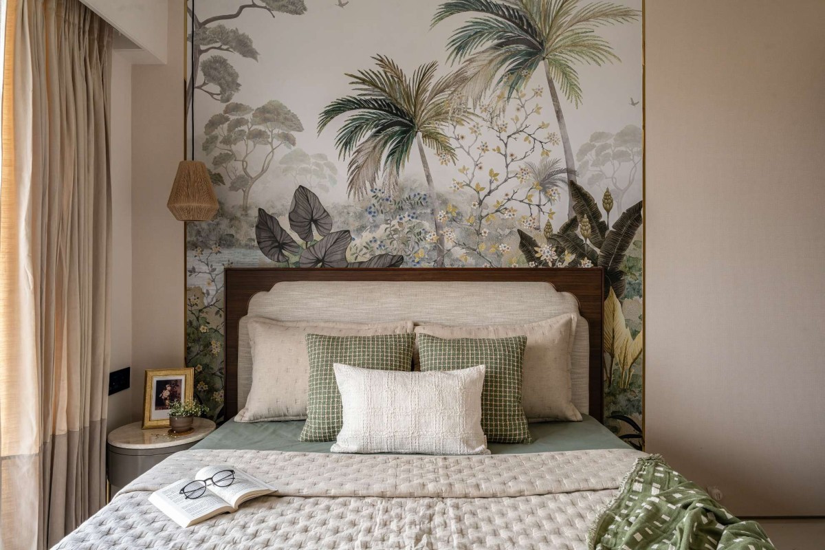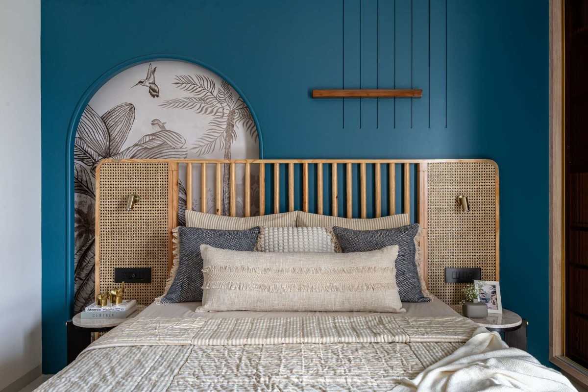 The master bedroom is designed to radiate serene grandeur. A bold teal arch frames the bed’s backdrop, contrasted by subtle greyscale tropical wallpaper that adds depth without overpowering the space. Natural rattan accents in the bed’s headboard and TV unit introduce a vernacular warmth, while a refined beige monochromatic palette enhances tranquillity and allows the teal feature to stand out as a statement of character.