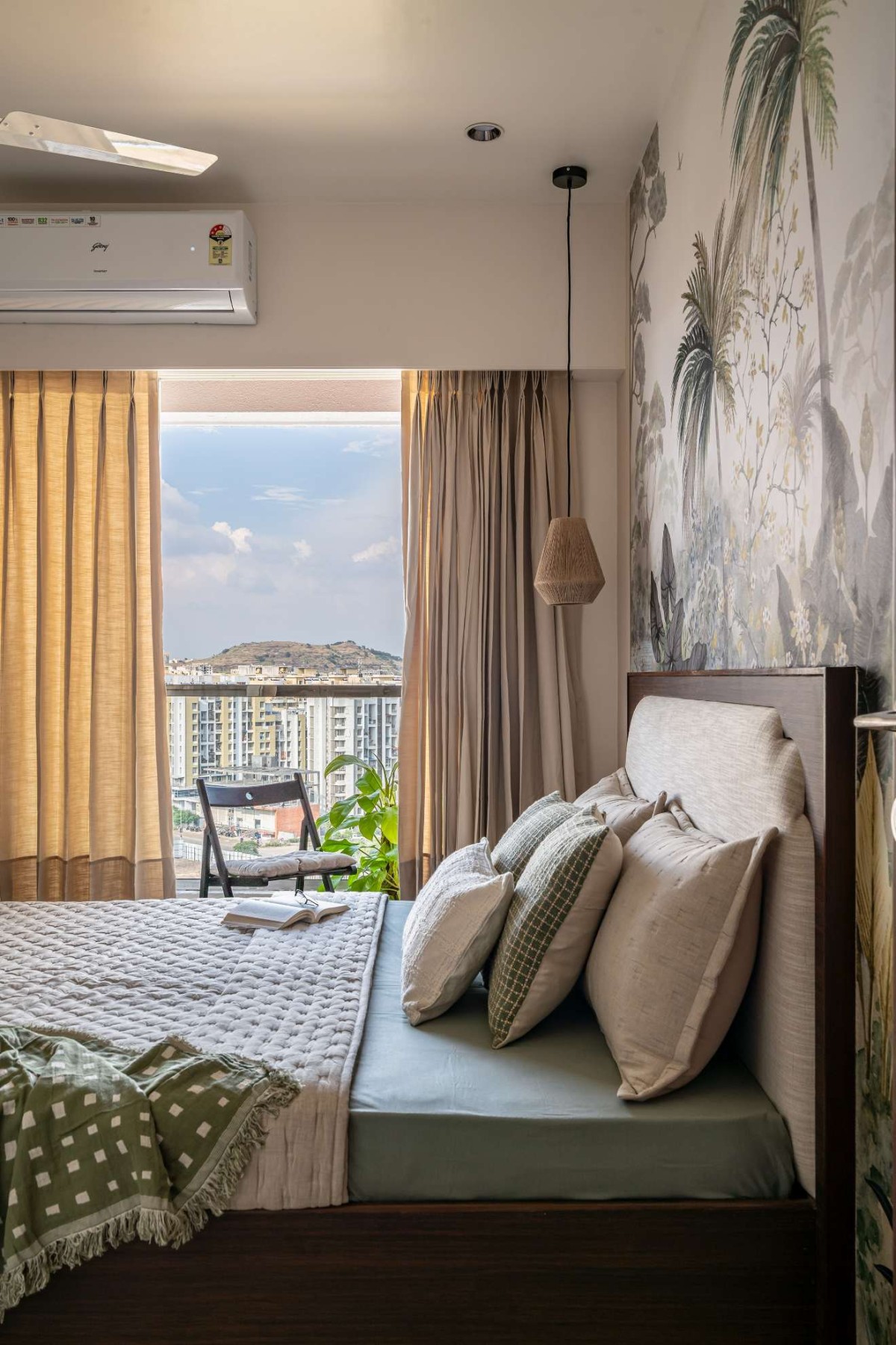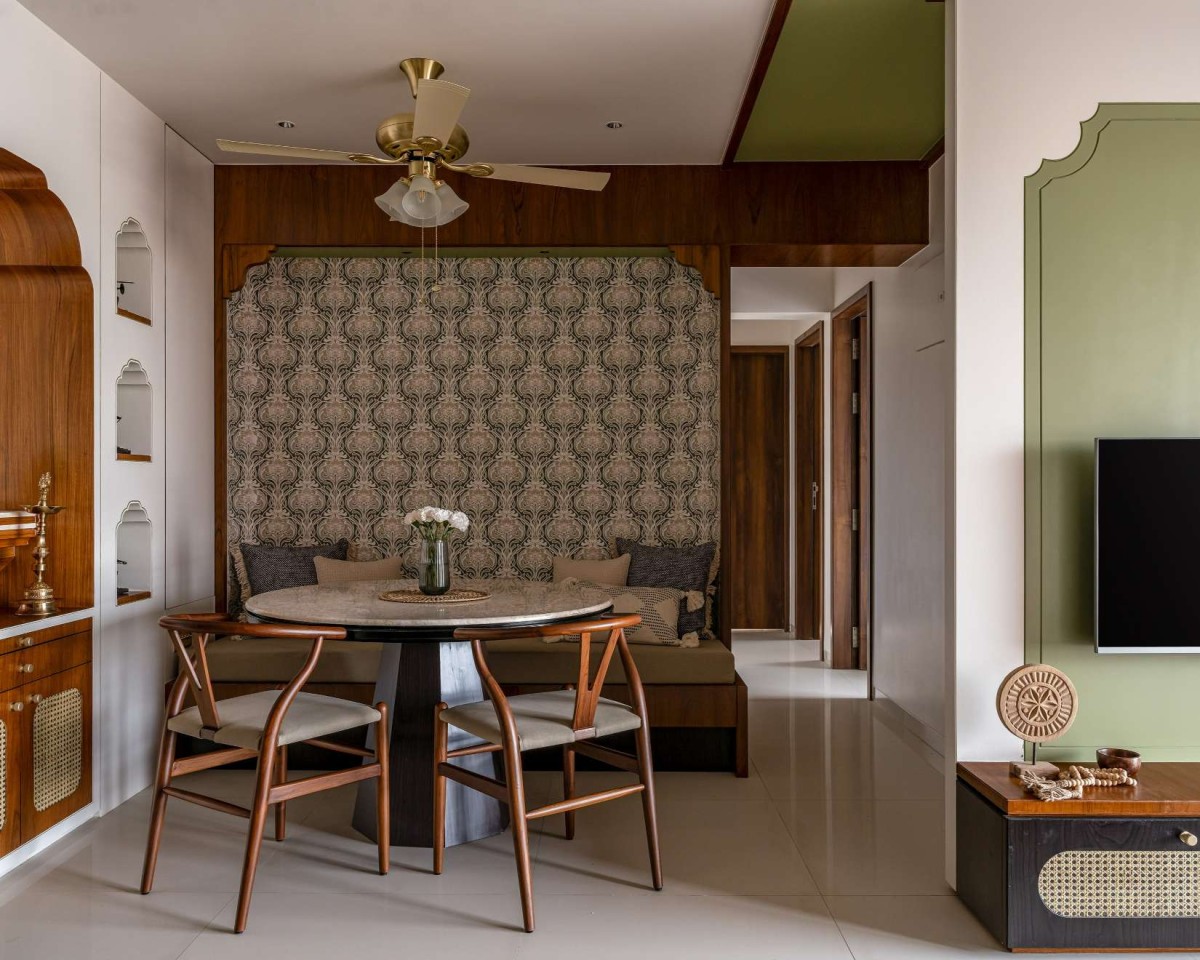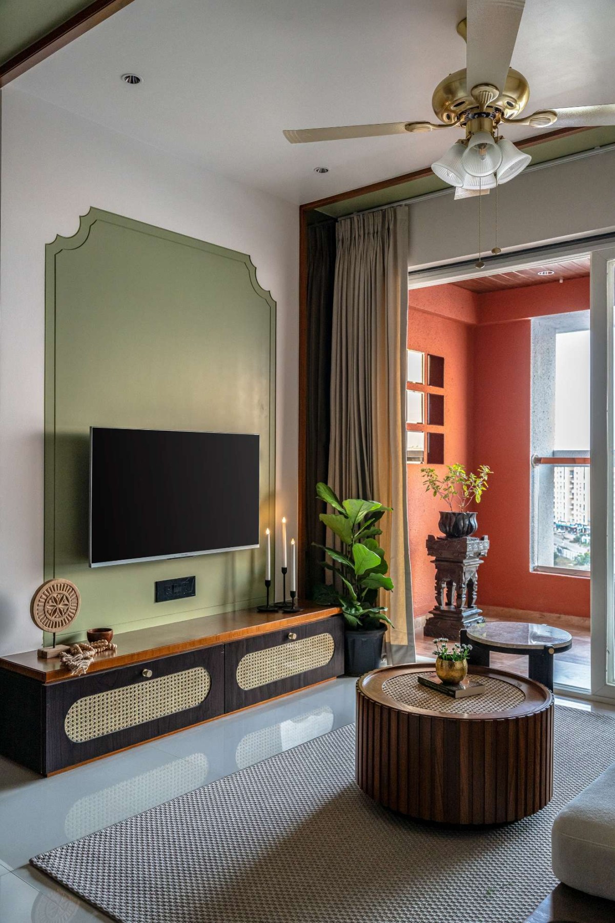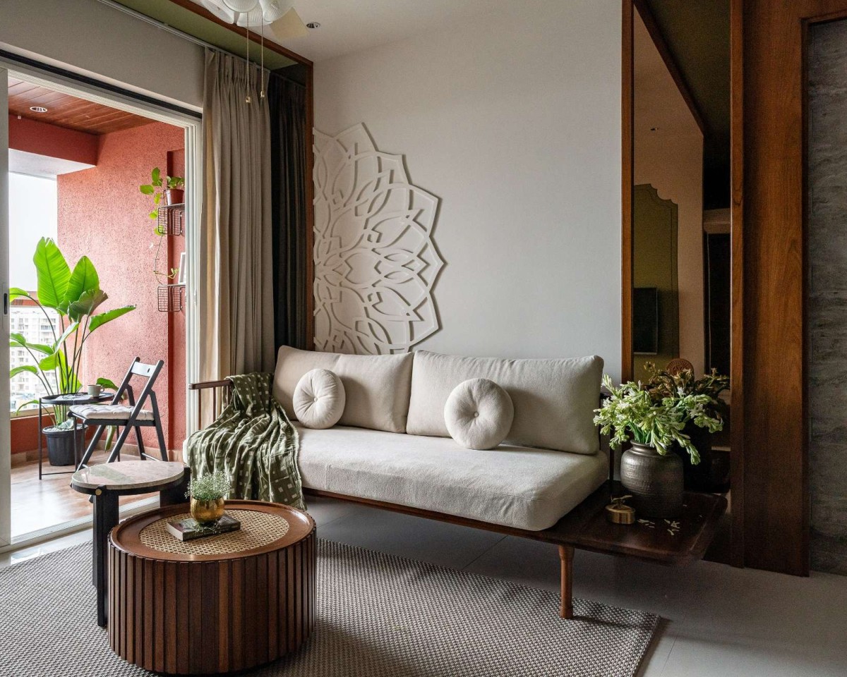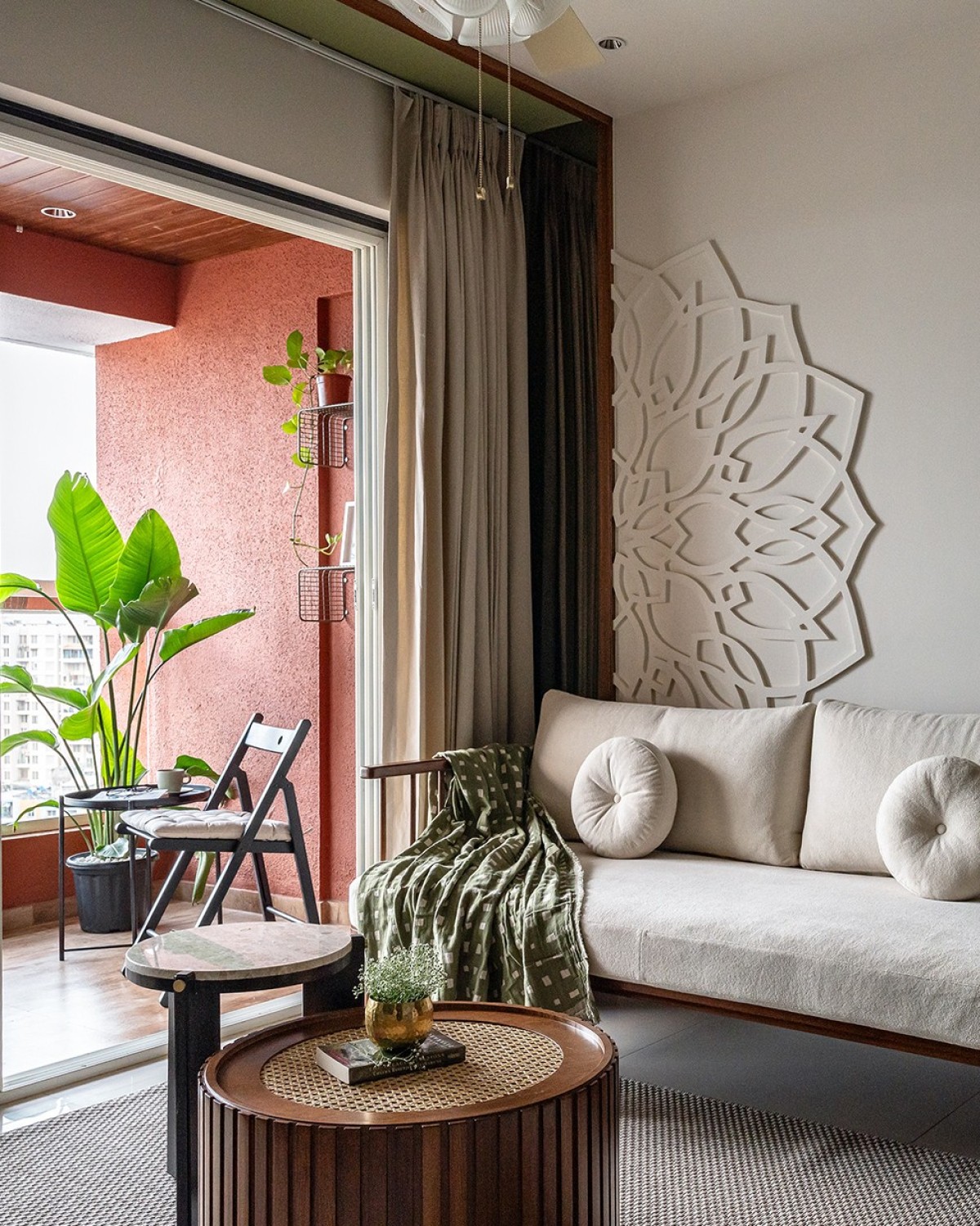 The balcony adjoining the living area becomes a contemporary extension of the traditional aangan, featuring a beautifully crafted stone Tulsi Vrindavan in warm terracotta tones—reminiscent of old Maharashtrian courtyards. This space gently bridges indoor comfort with outdoor serenity, echoing the essence of rooted living within a modern setting.