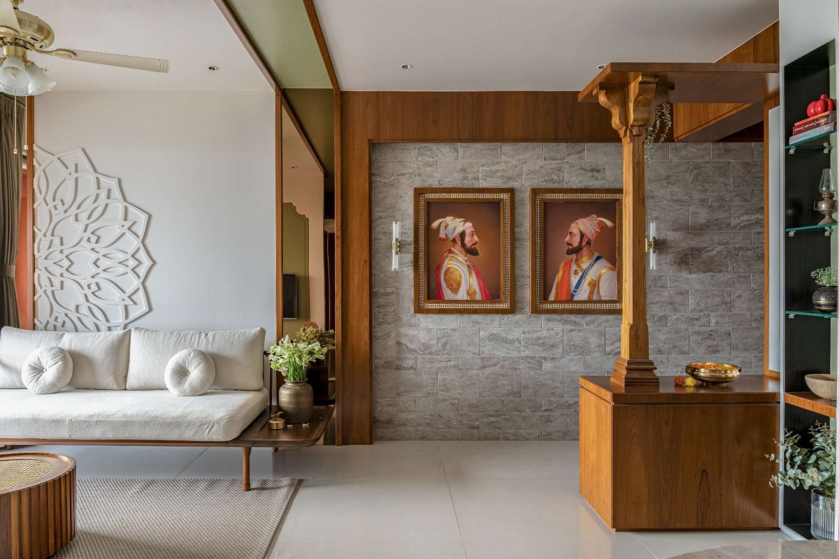 The entrance is a thoughtful homage to Maharashtrian tradition, adorned with intricate detailing and a custom nameplate crafted in the symbolic form of the Raj Mudra. Stepping inside, the living room unfolds as a heartfelt tribute to classic Wada aesthetics, where tradition and warmth set the tone for the home. A striking stone-clad feature wall anchors the space, adorned with hand-painted portraits of Chhatrapati Shivaji Maharaj and Chhatrapati Sambhaji Maharaj. Behind the sofa, a monochromatic backdrop is delicately detailed with intricate mandala art, adding depth and quiet elegance to the living area.