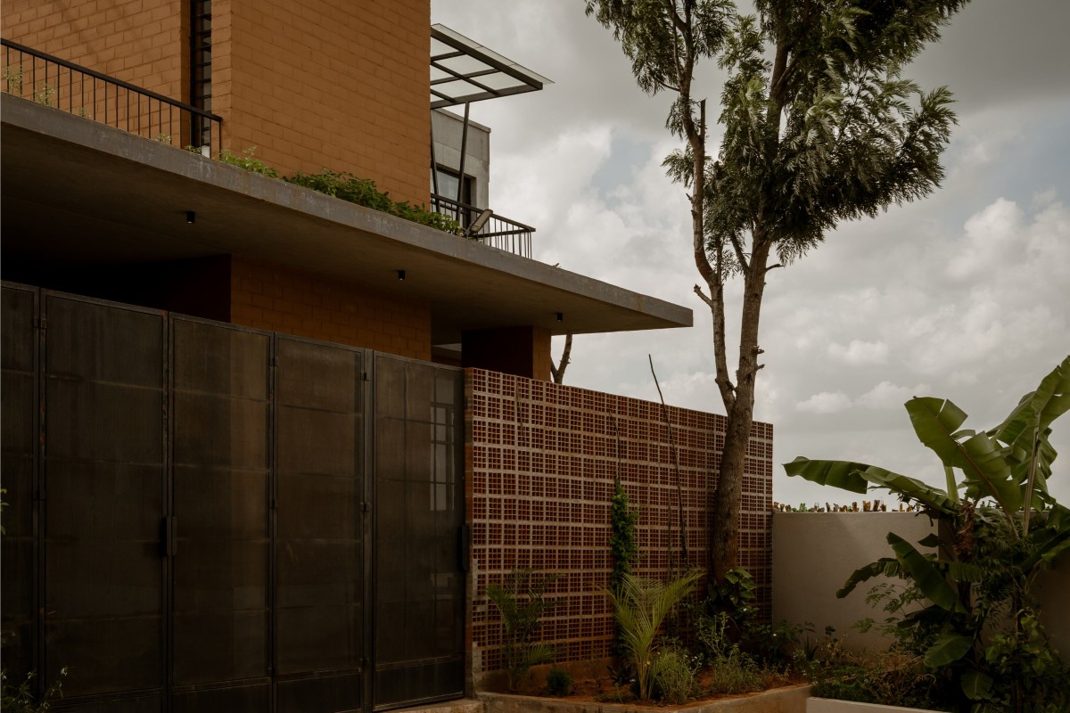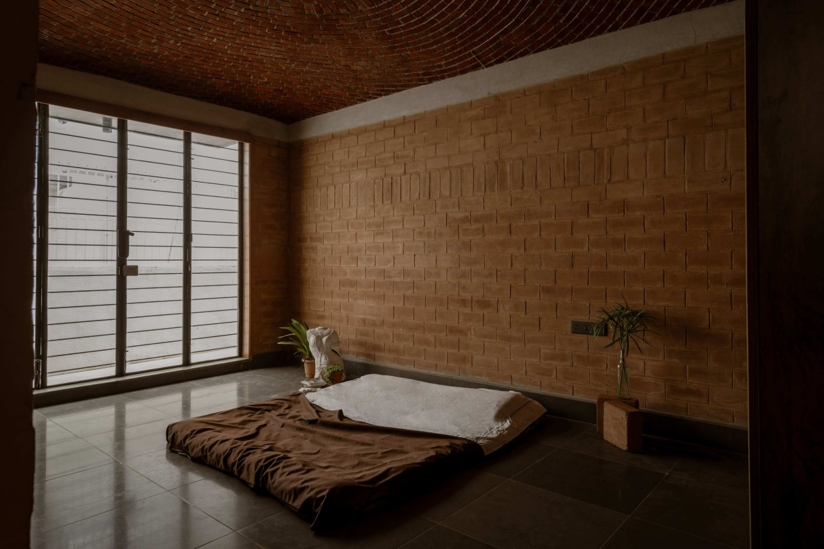 The spatial organization is inward-looking, creating a series of layered thresholds that mediate between public and private realms. A perforated brick jaali wall along the street edge filters light, air, and views while establishing a porous boundary. Landscaped pockets are integrated into the built form, improving the microclimate and softening the transition between interior and exterior spaces.