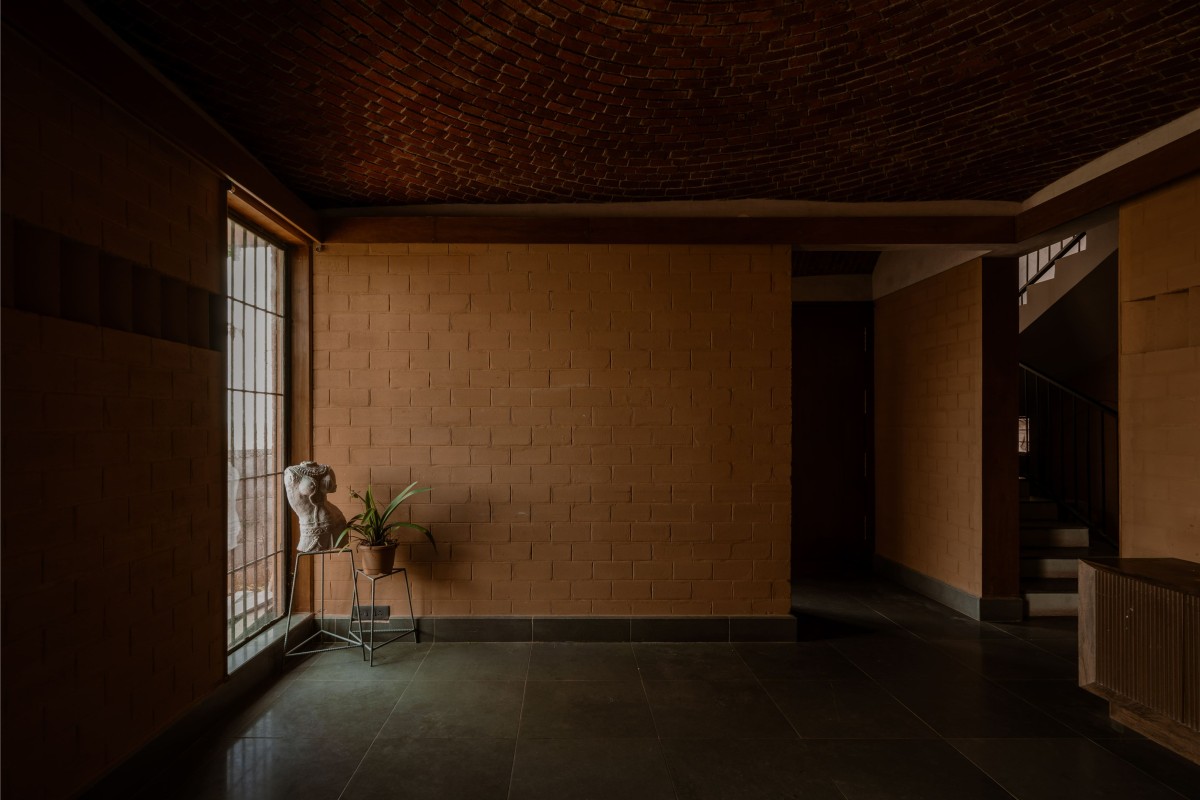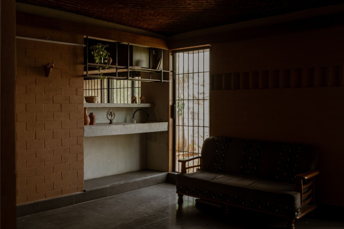 Random rubble masonry foundations ground the building to its context, while mild steel windows ensure controlled daylight and cross-ventilation. Kotta stone flooring complements the material palette, reinforcing durability and thermal comfort. The project demonstrates how sustainable construction and restrained detailing can result in a timeless and climate-responsive domestic architecture.