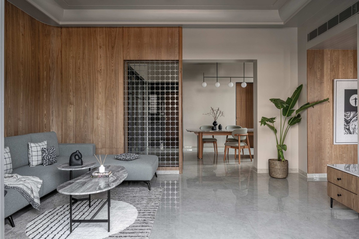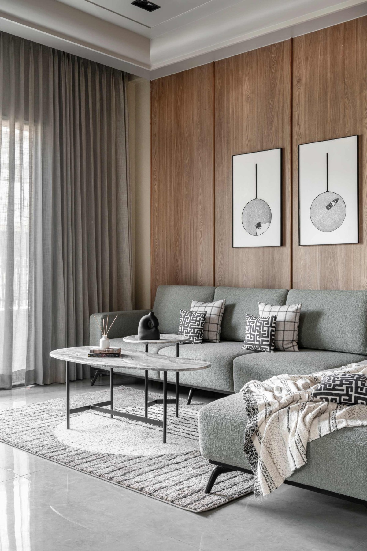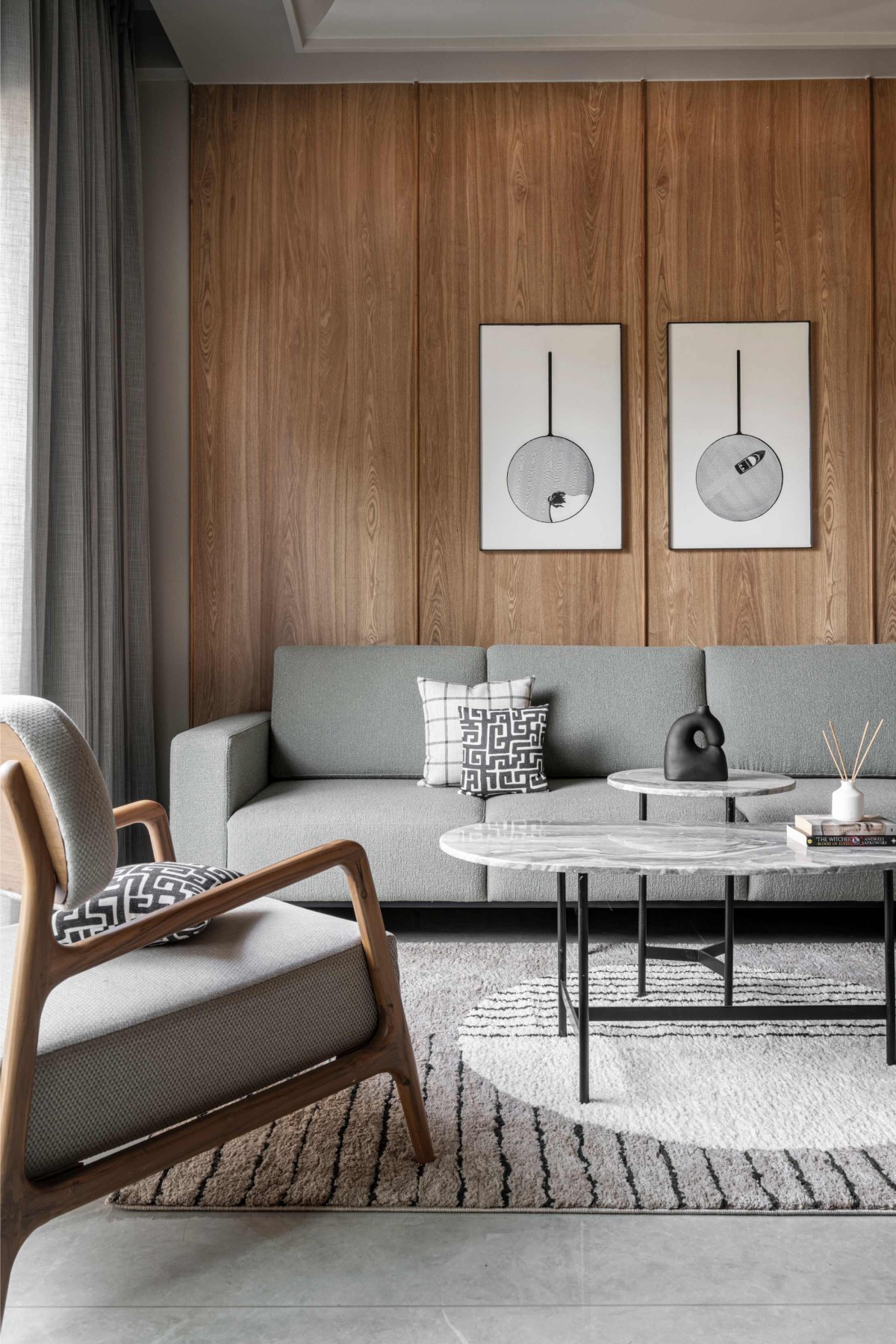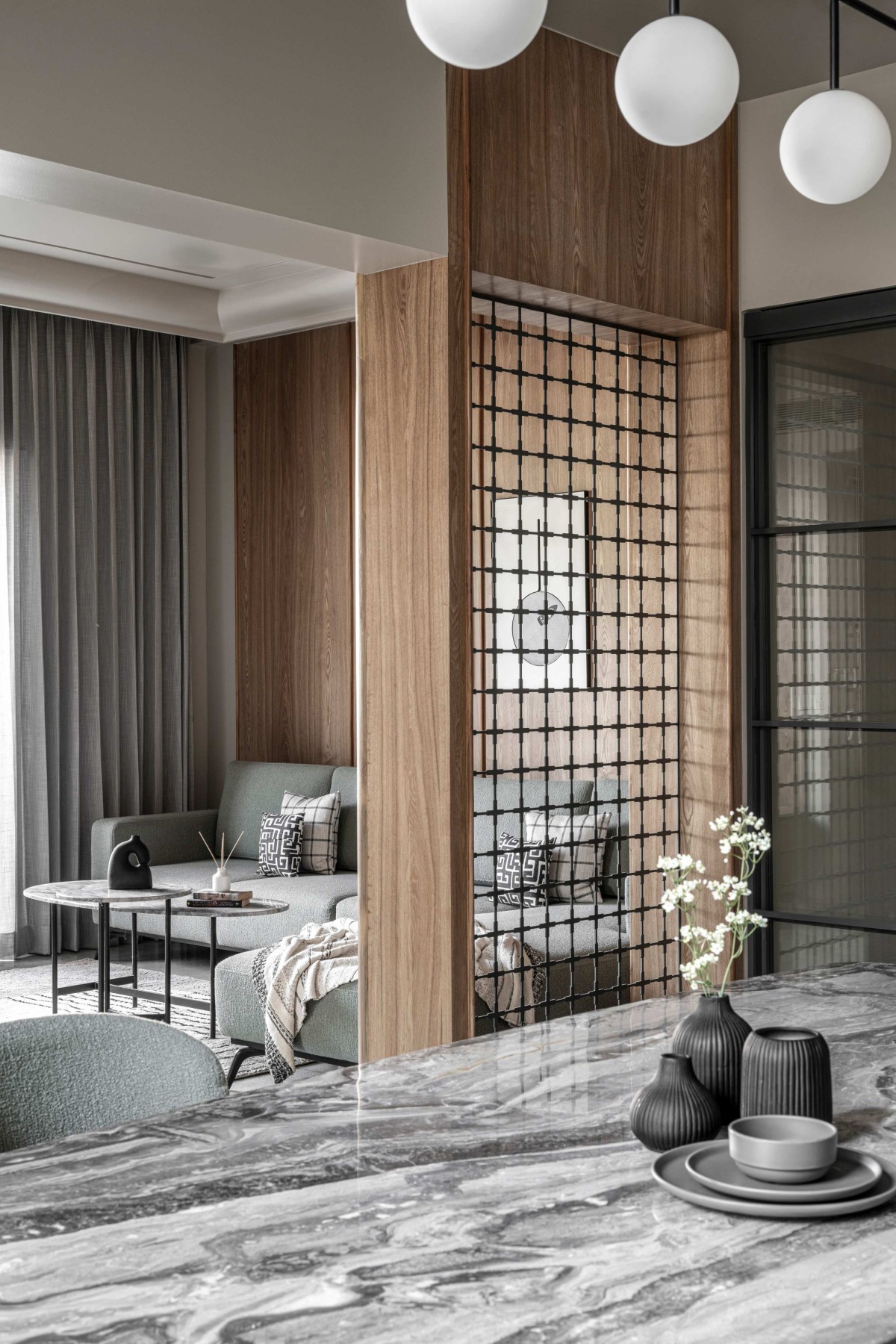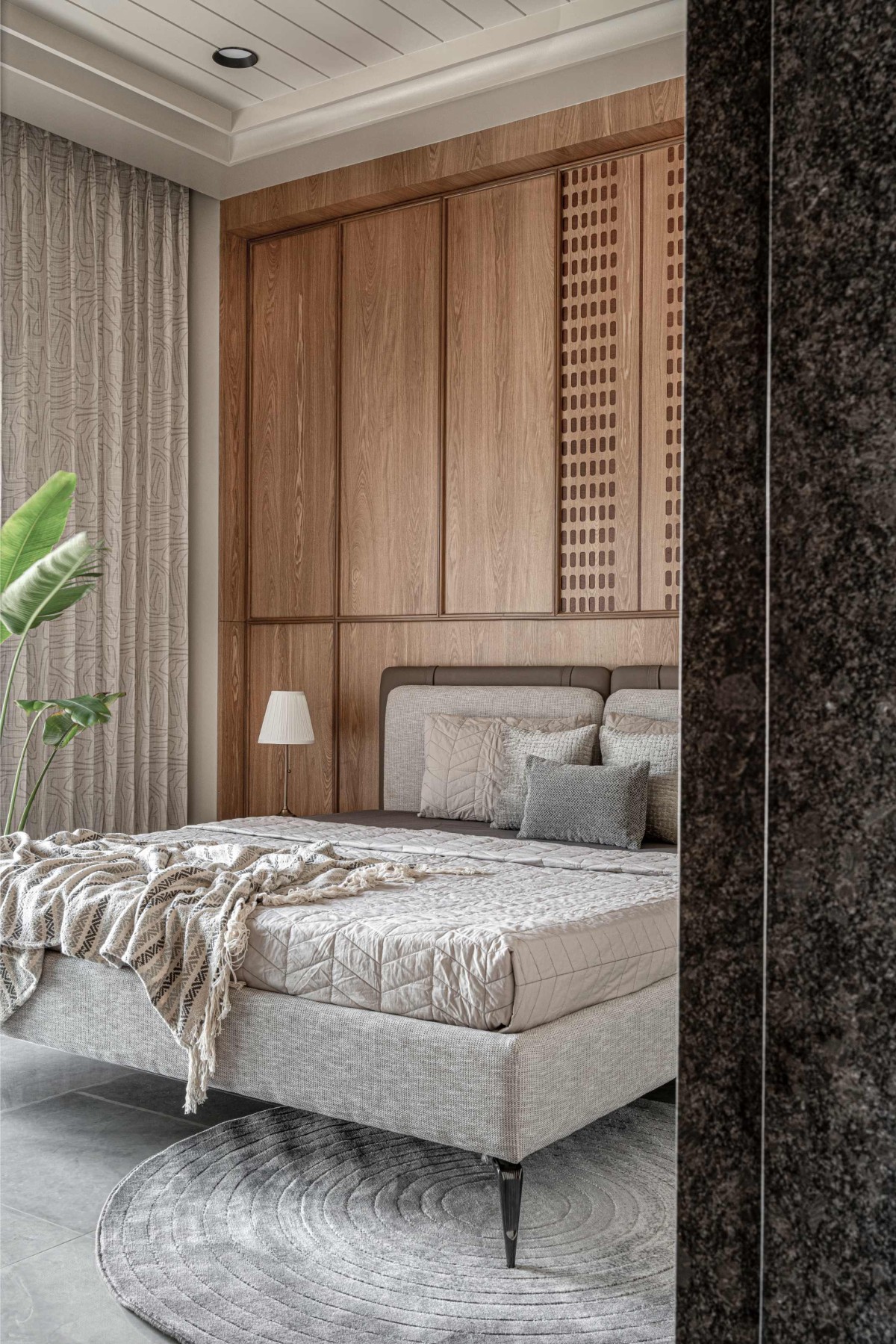 The second master bedroom has a warm interior design with a prominent focus on wood elements. The feature wall behind the bed is a striking combination of vertical wood paneling and an intricate latticework design in the center. The use of rich, dark wood tones creates a sense of depth and sophistication. The bed itself is a simple, modern design with a low platform frame and upholstered headboard. The two bedside tables and lamps complement the wood tones of the feature wall, adding a touch of warmth and functionality to the space. The overall design strikes a balance between contemporary and rustic styles, creating a harmonious and relaxing ambiance.