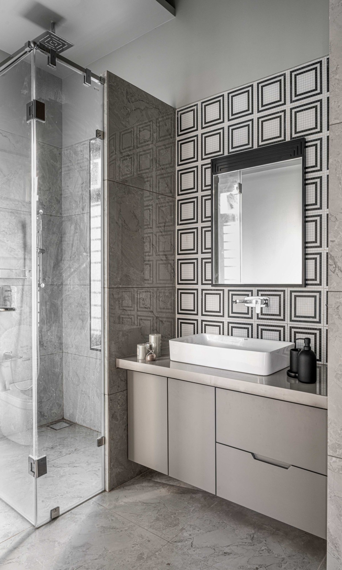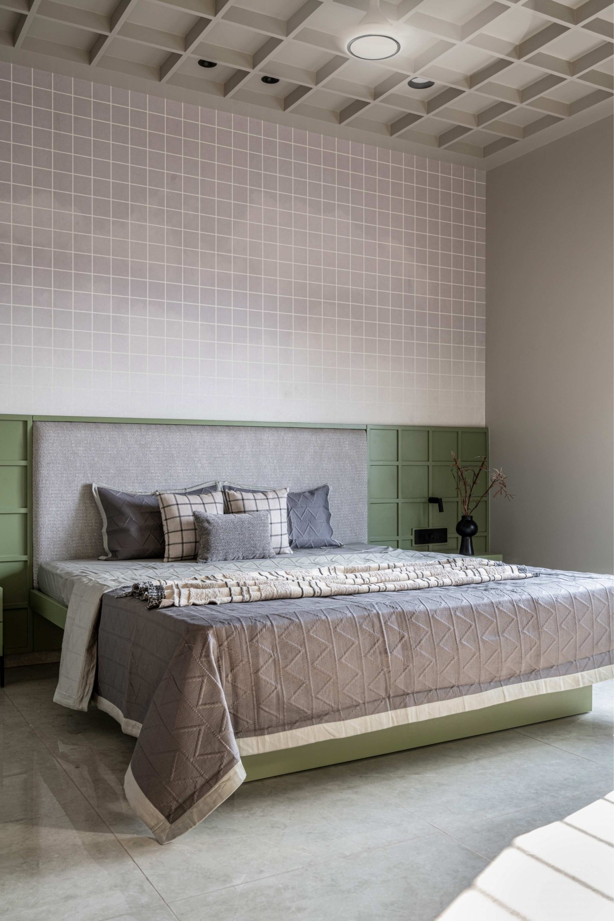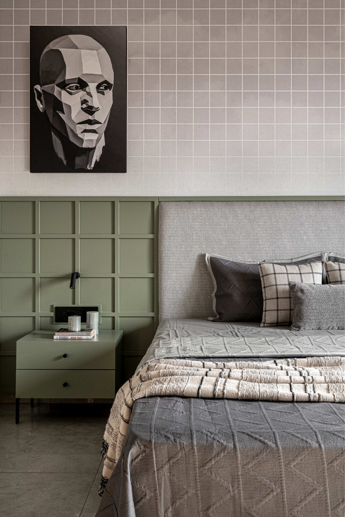 In the master bedroom, symmetry and geometric repetition reign supreme, with a bed side wall adorned in olive-colored square grid paneling juxtaposed against shades of grey that flow seamlessly into the ceiling. Sleek black fixtures and monochrome abstract wall art add a touch of modern flair, creating a space that is at once contemporary and inviting.