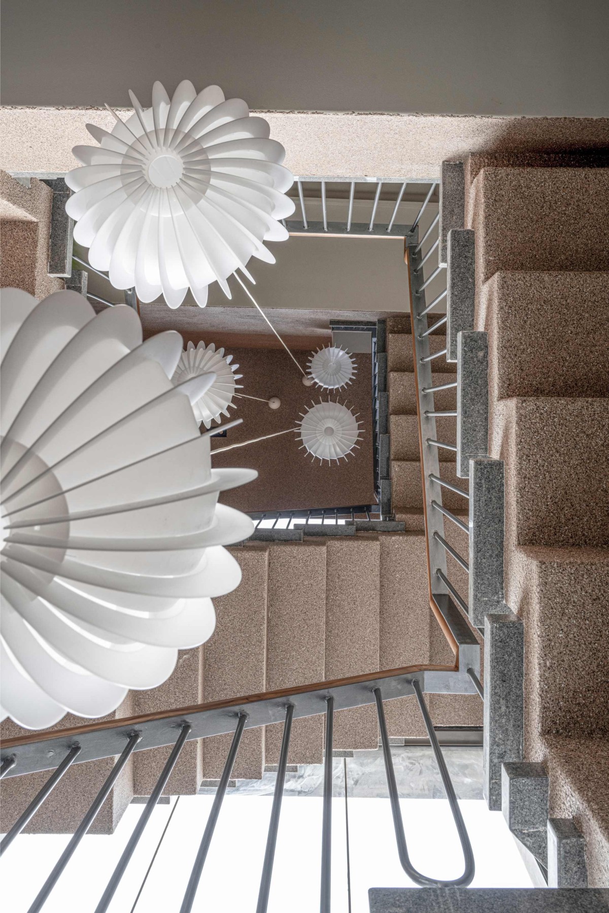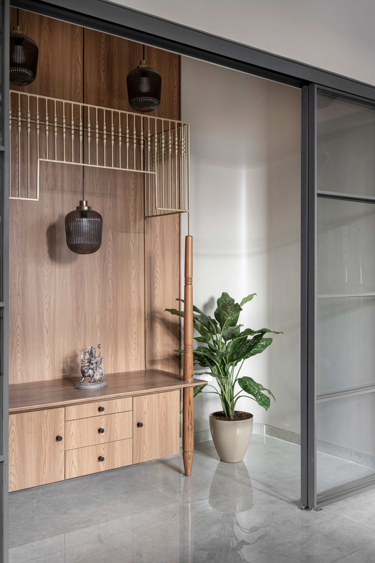 Ascending the staircase, adorned with a contemporary light chandelier that adds a touch of grandeur, one is greeted by a temple space that seamlessly blends tradition and modernism. Sleek sliders with black frames provide glimpses of the sacred space within, where columns echo the design language of the entrance handle, culminating in a unique interpretation of the traditional "shikhara" motif, resplendent in golden polish, exuding a sense of reverence and positivity.