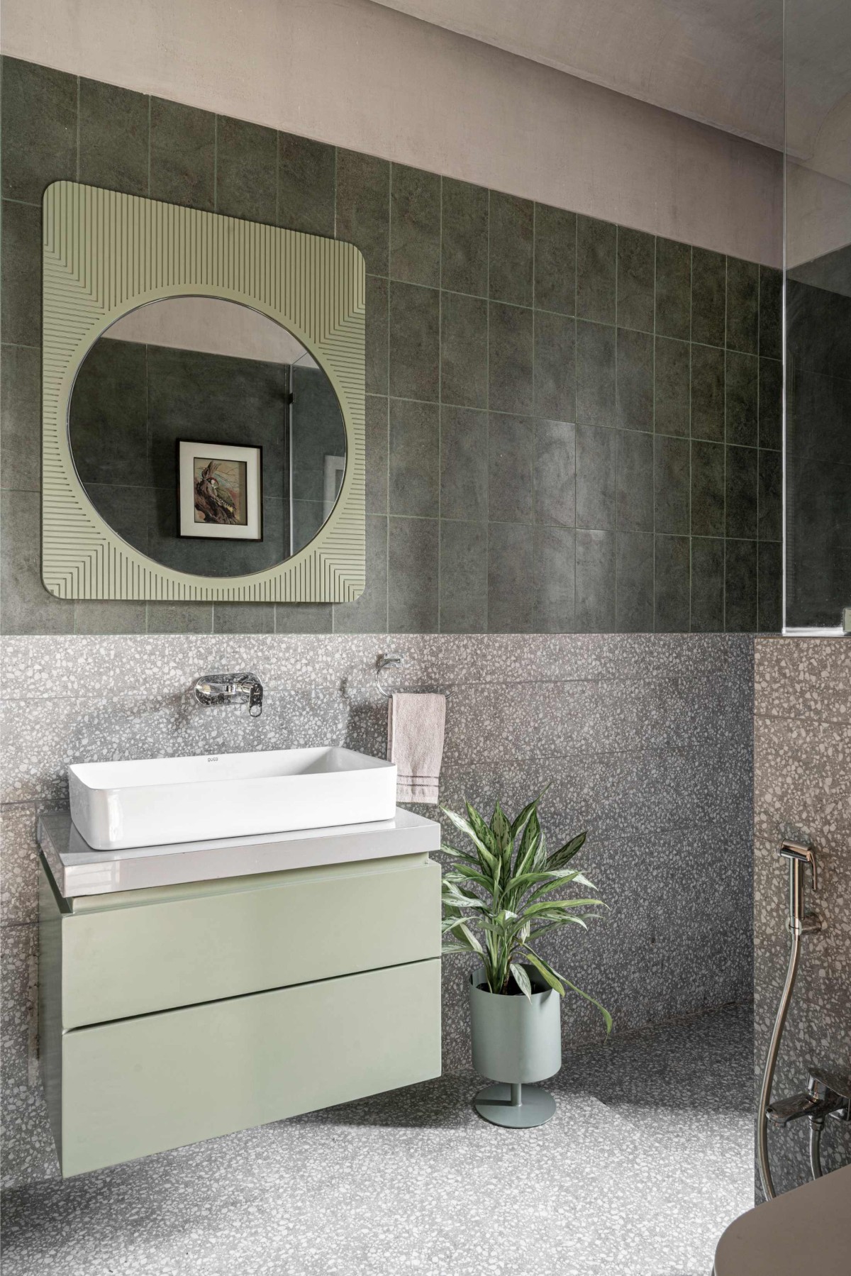 The bathroom, following the same olive green color palette, exudes a sense of tranquility and harmony, while the master bedroom on the first floor offers a warm and luxurious retreat. The unique marquetry of the wooden texture, combined with embossed thin wooden paneling, adds depth and dimension to the space, while the balcony provides an intimate connection to the outdoors.