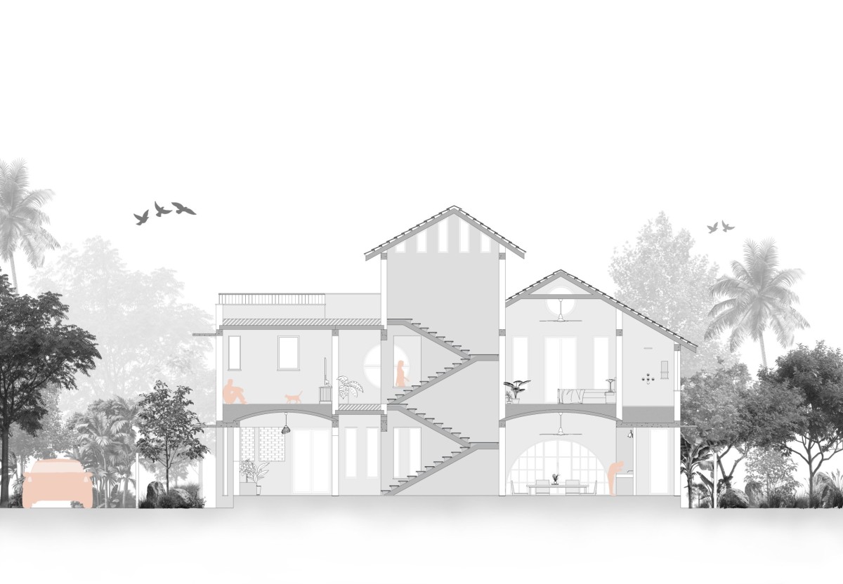 Children’s bedrooms are curated in a way that engages with varied roof volumes a vaulted ceiling, and an angular cross-ventilated louvered window that penetrates diffused light into the room, creating a dynamic interplay of light and shadow.