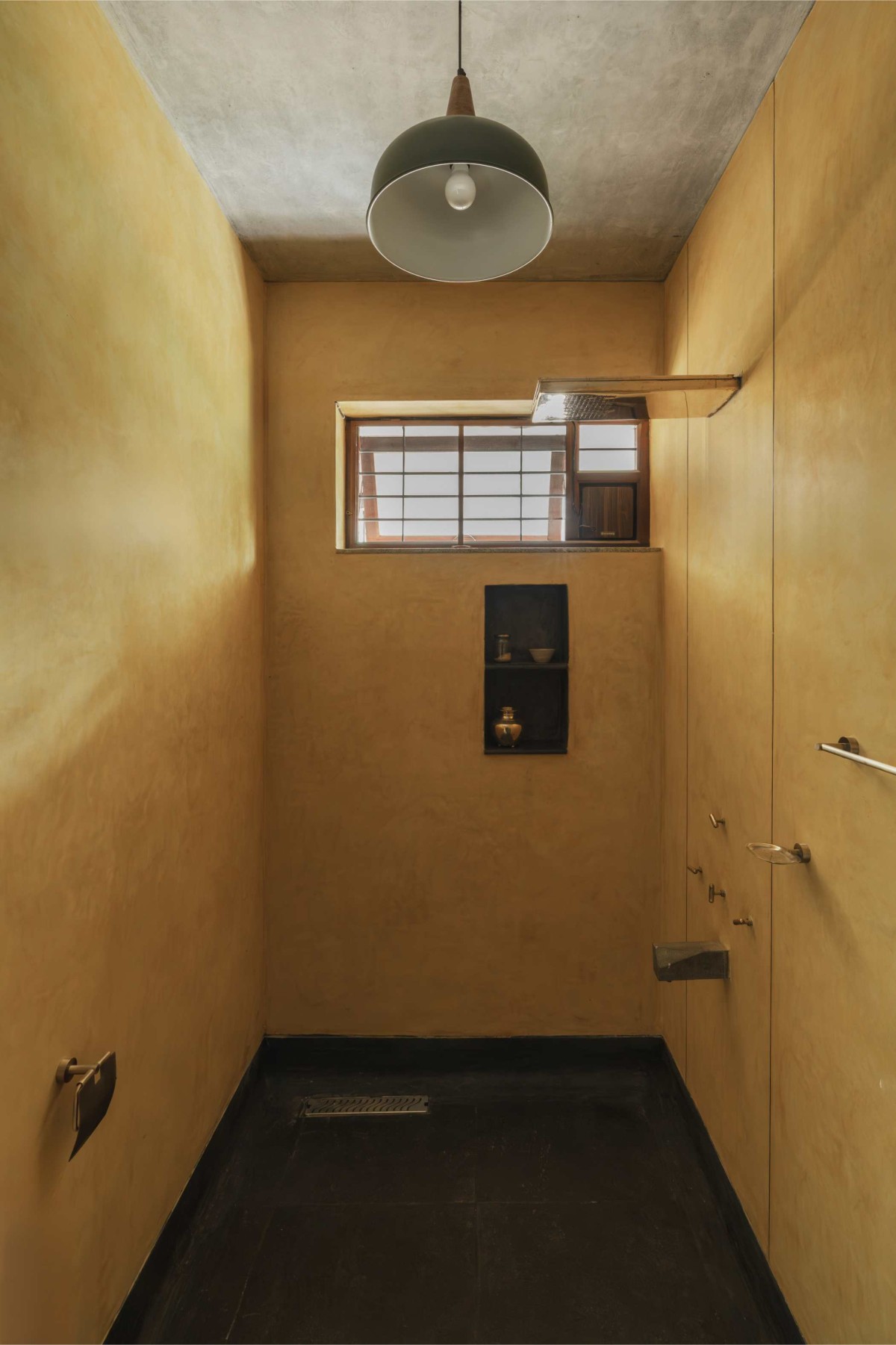 The toilets go beyond a purely functional purpose, featuring a custom-designed stone washbasin and brass fixtures. The shower area, framed by serene emerald-green plaster walls, brings a sense of natural tranquility. This curated mix of textures and materials fosters a revitalizing ambiance, offering users a space crafted for both visual appeal and sensory relaxation.