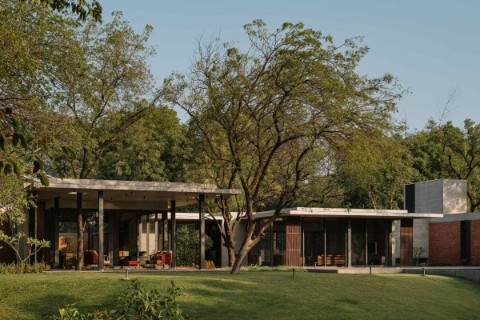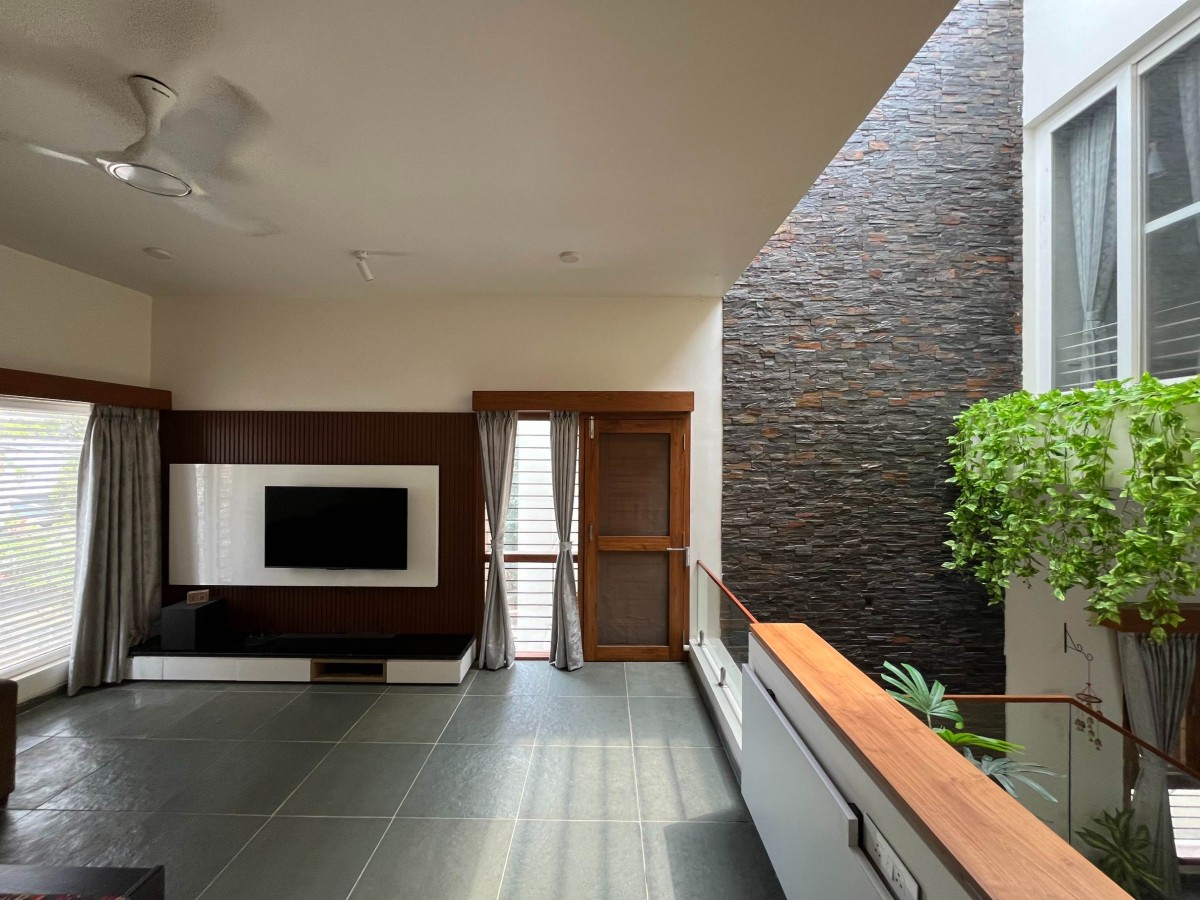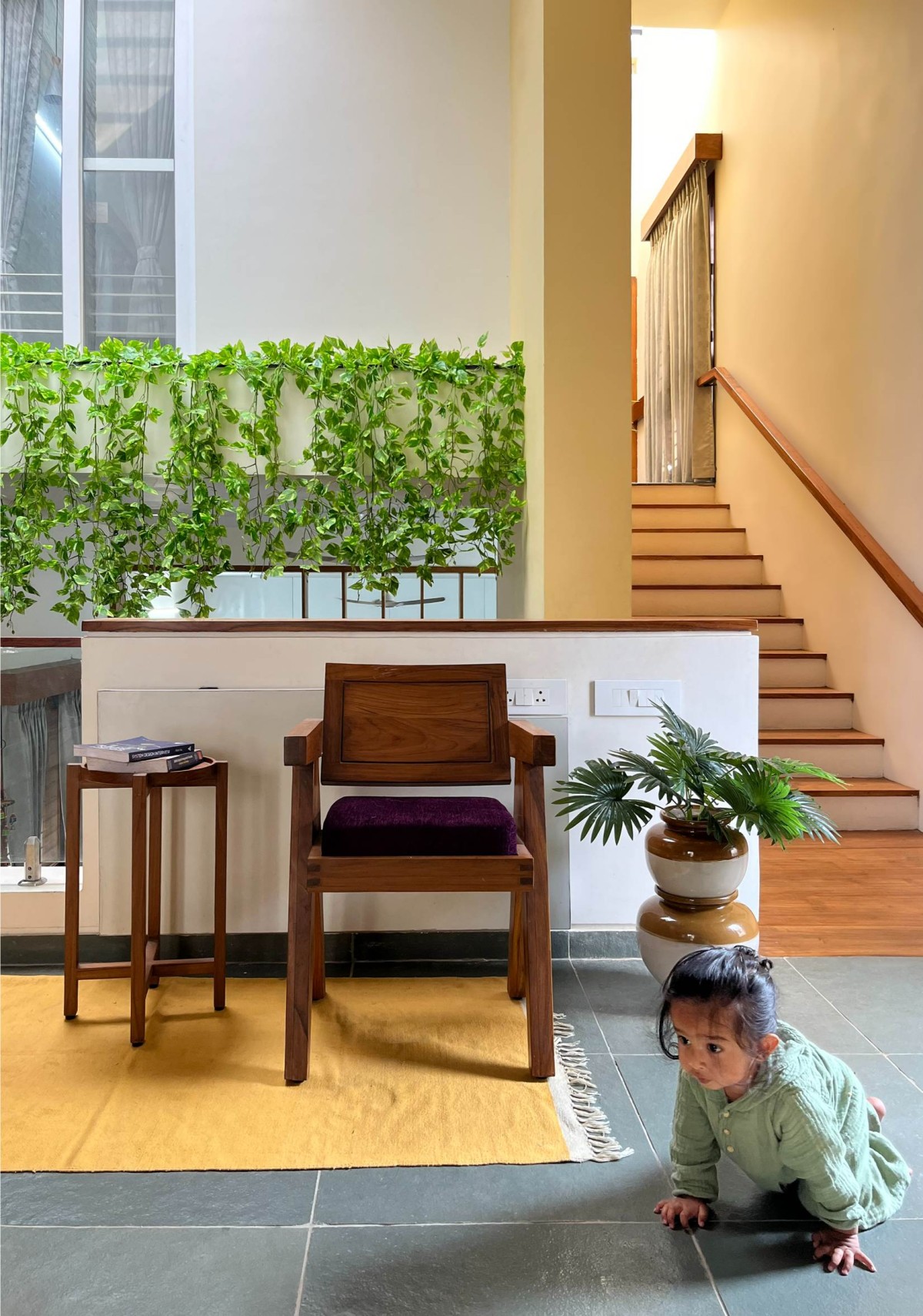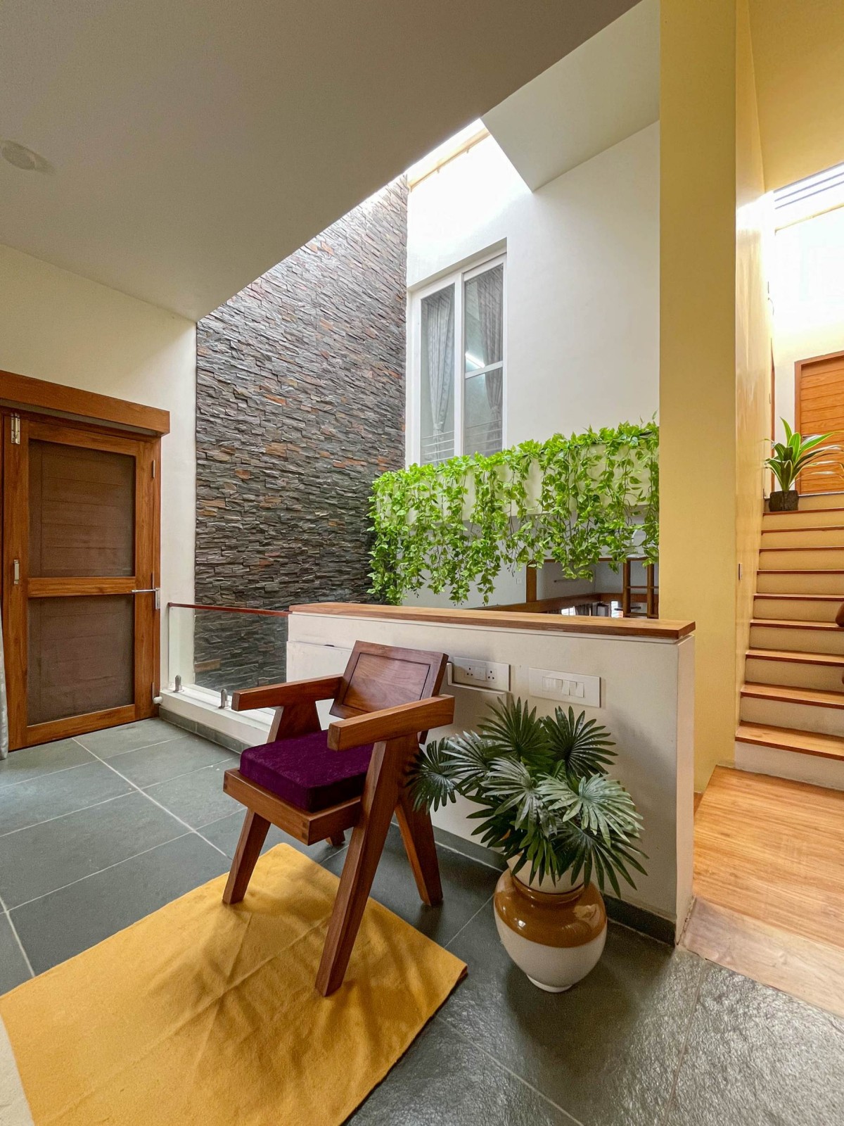 Material decisions reinforce this conceptual clarity. A restrained palette emphasizes thermal performance and tactile comfort. Kota stone flooring moderates interior temperature, while exposed surfaces allow light to articulate depth and proportion. Natural stone cladding is introduced along the core of the double-height skylight, grounding the vertical volume and providing visual weight that anchors its scale. This material articulation prevents the central void from reading as a narrow shaft, instead establishing it as a defined spatial element within the house. Cascading vegetation is integrated into the void, softening vertical scale and introducing seasonal change into the interior atmosphere.