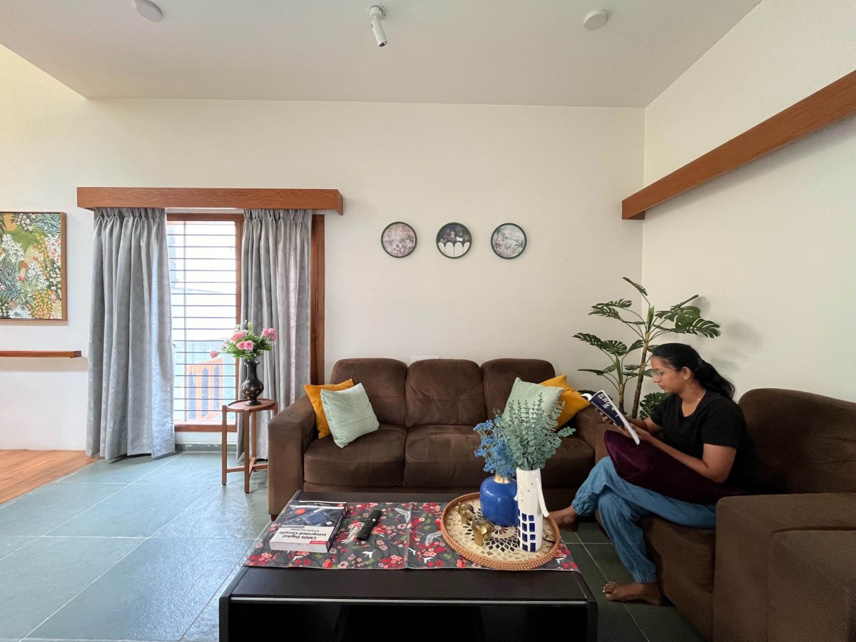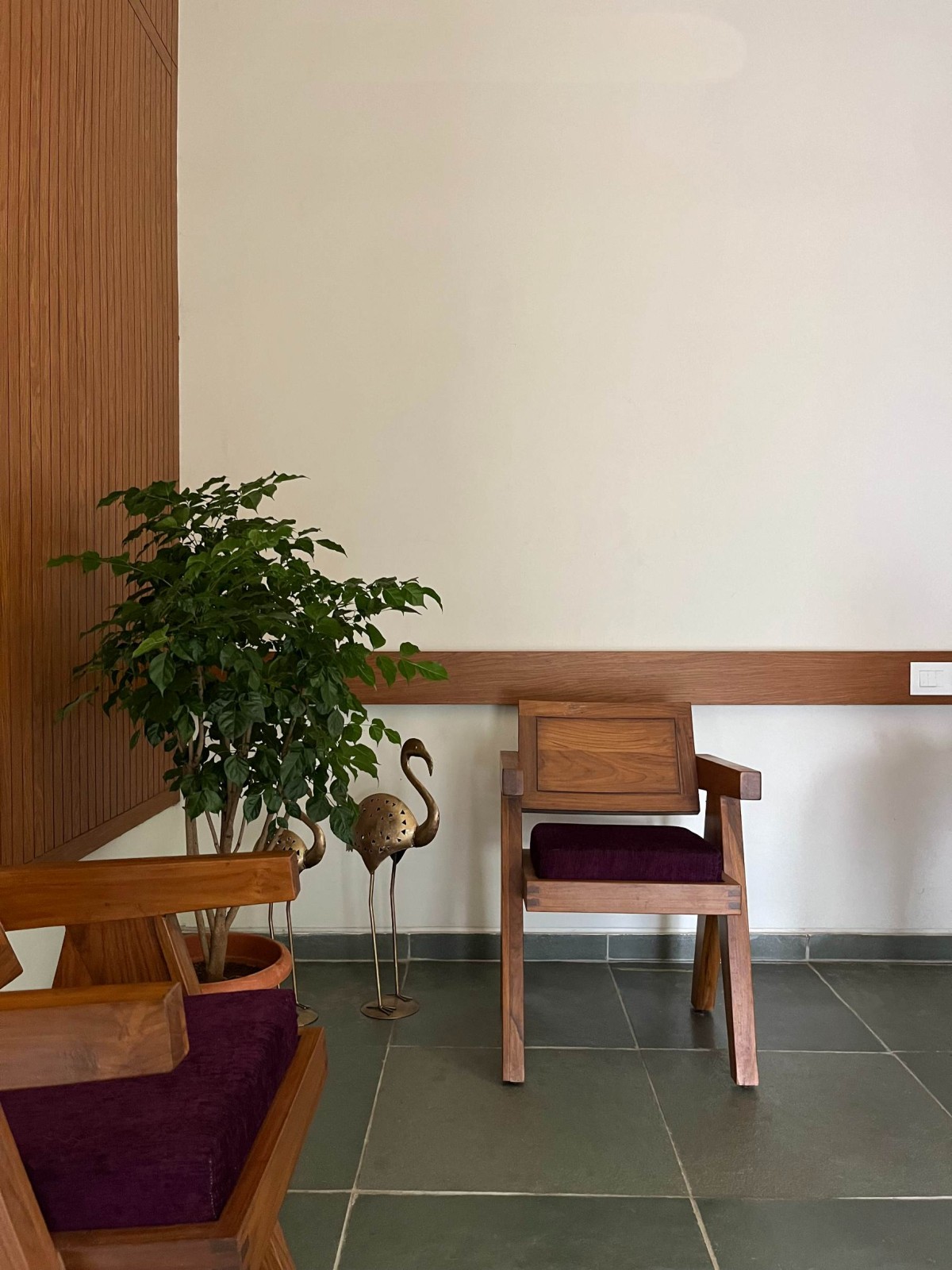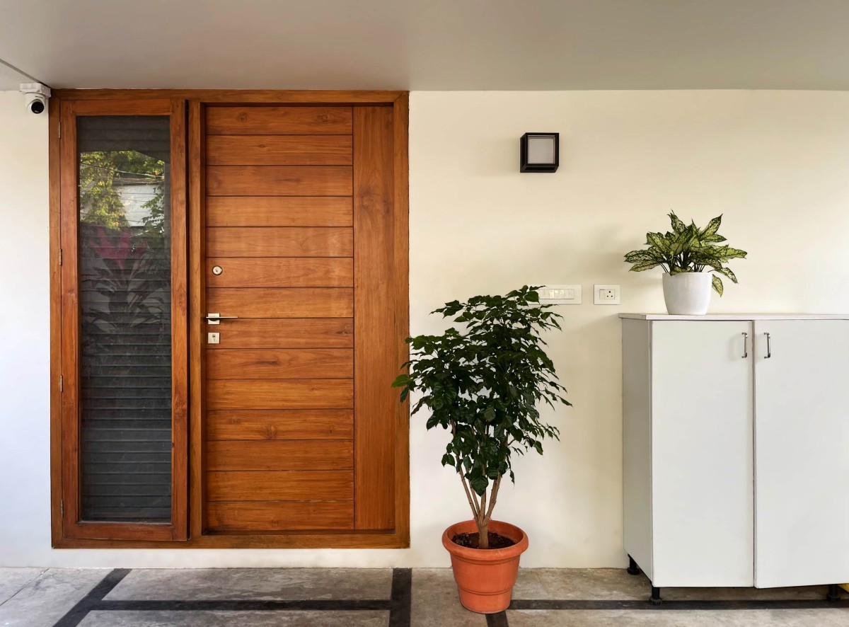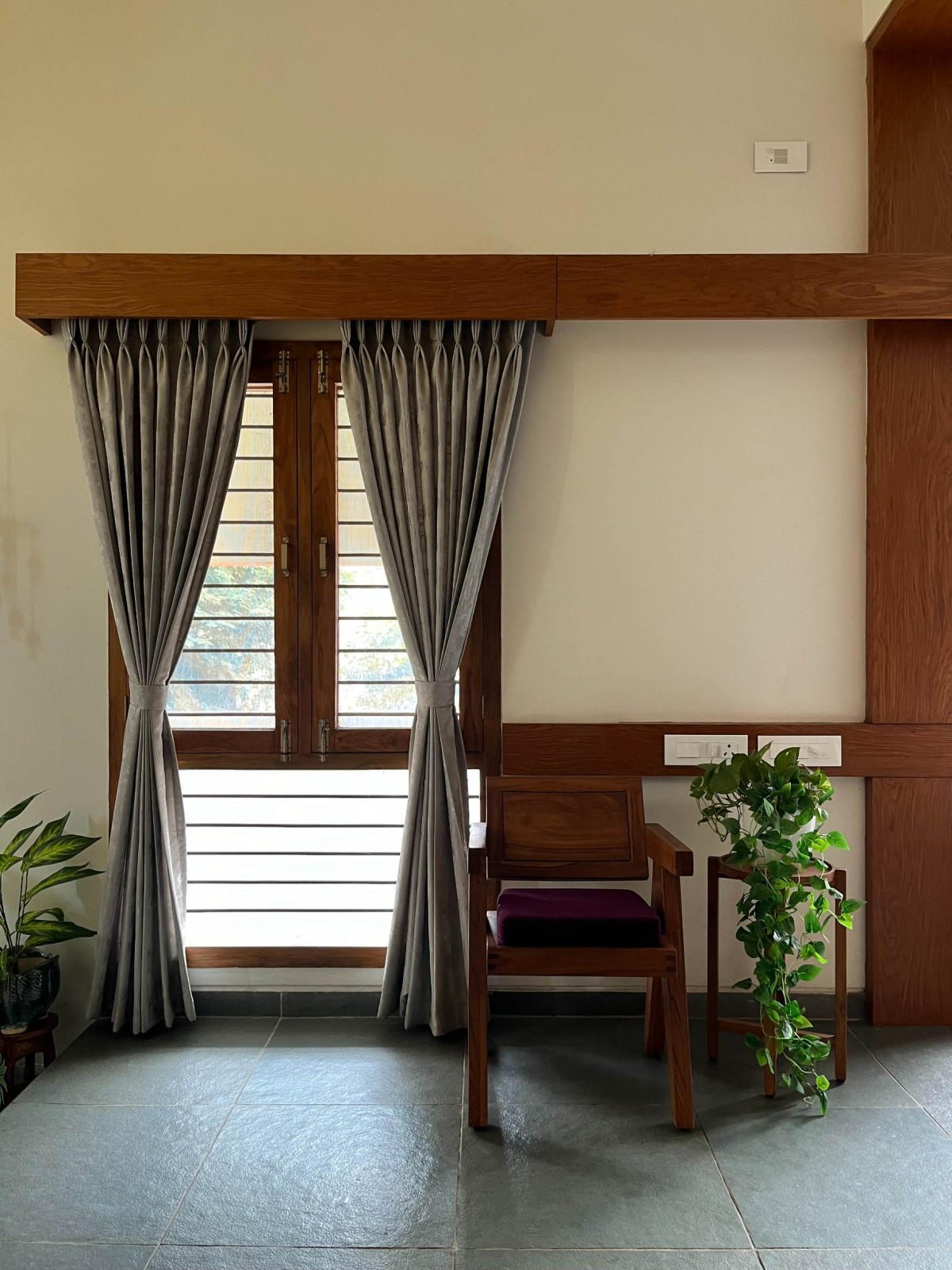 Material decisions reinforce this conceptual clarity. A restrained palette emphasizes thermal performance and tactile comfort. Kota stone flooring moderates interior temperature, while exposed surfaces allow light to articulate depth and proportion. Natural stone cladding is introduced along the core of the double-height skylight, grounding the vertical volume and providing visual weight that anchors its scale. This material articulation prevents the central void from reading as a narrow shaft, instead establishing it as a defined spatial element within the house. Cascading vegetation is integrated into the void, softening vertical scale and introducing seasonal change into the interior atmosphere.