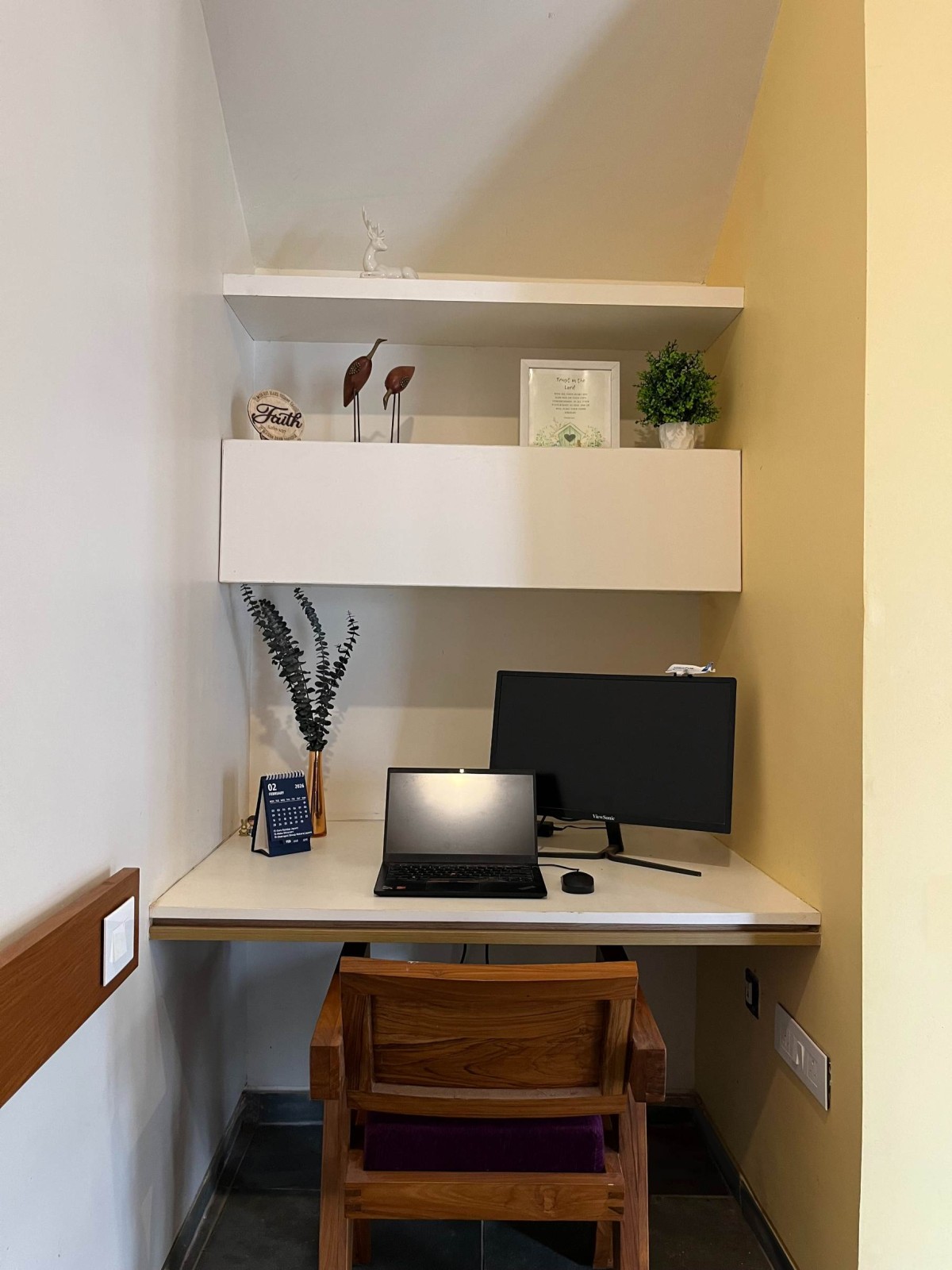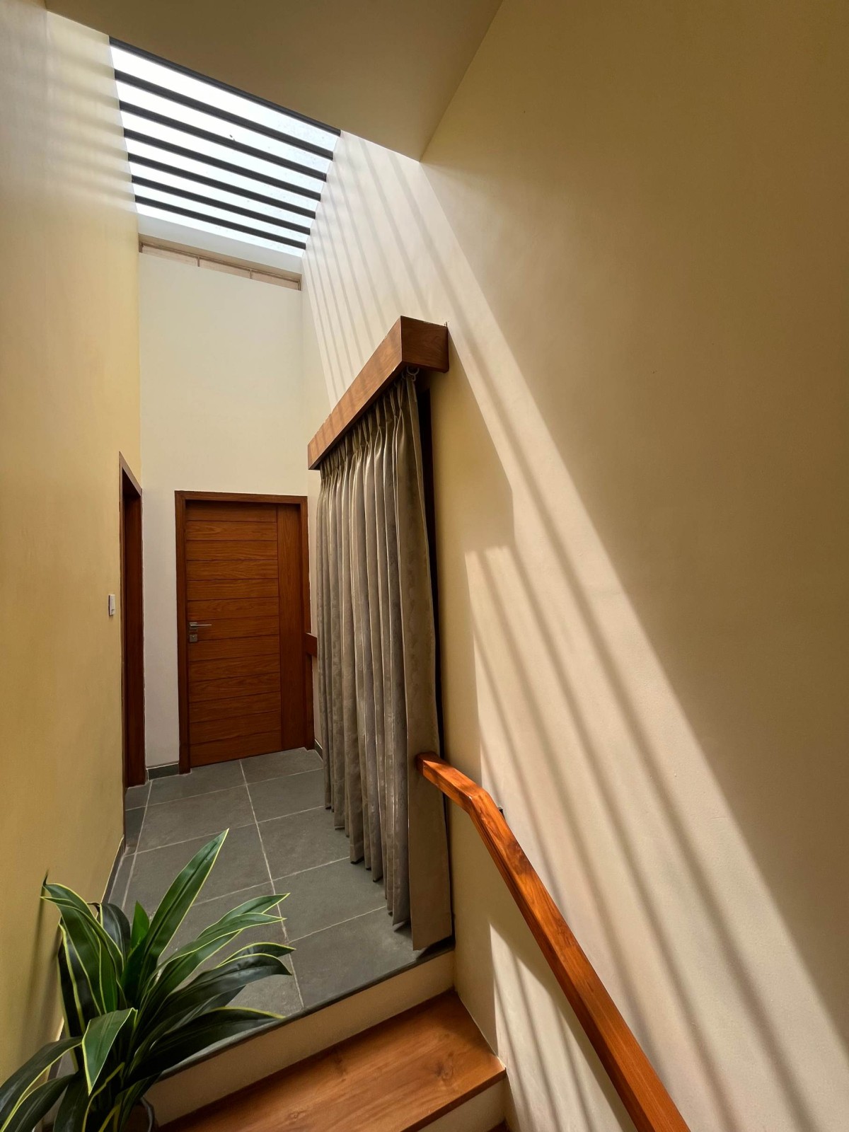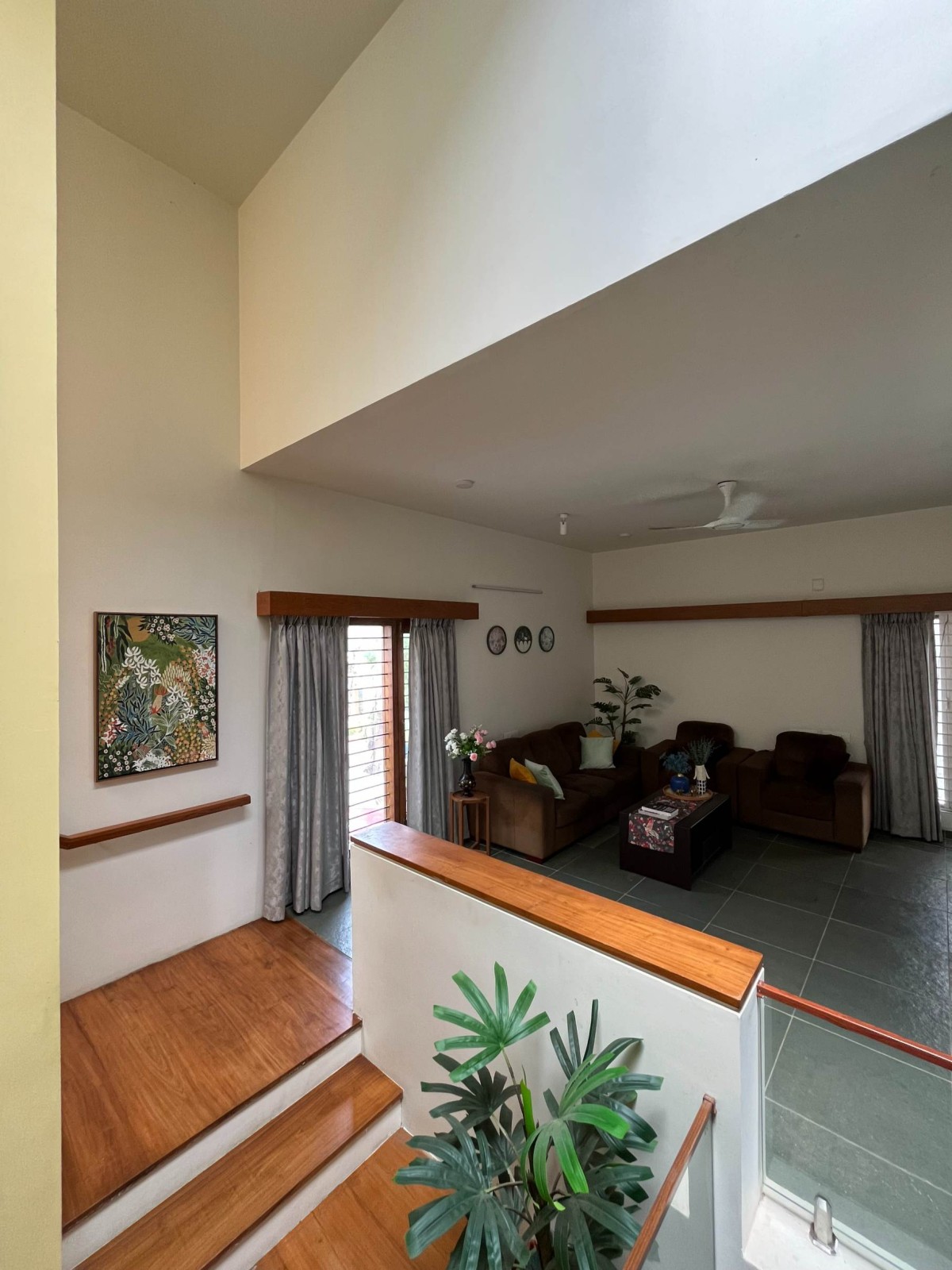 Circulation unfolds along the perimeter of this vertical volume, ensuring that movement remains engaged with the central space. Instead of corridors isolating rooms, transitions occur along edges that maintain sightlines across levels. An intermediate mezzanine is inserted within the height of the void, allowing occupation within the vertical field itself. This strategy transforms section into lived space, where inhabitation occurs in dialogue with light, air, and shared activity. The staircase to the terrace is positioned externally, accessed from the mezzanine level, to preserve the spatial clarity of the interior core.
