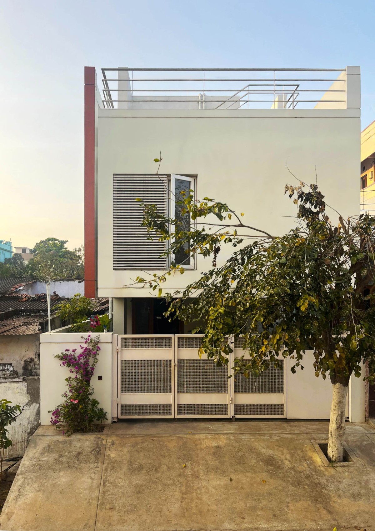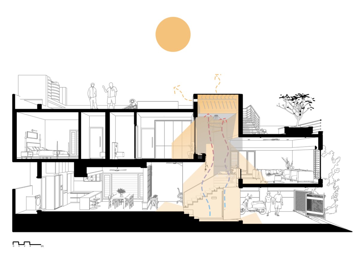 The design reconceives the house not as a stack of enclosed rooms, but as a vertically continuous spatial field structured around a central void. In response to restricted side openings and climatic intensity, the section becomes the primary architectural instrument. Height replaces width as the generator of openness, and the interior volume operates simultaneously as an environmental device and collective living space.