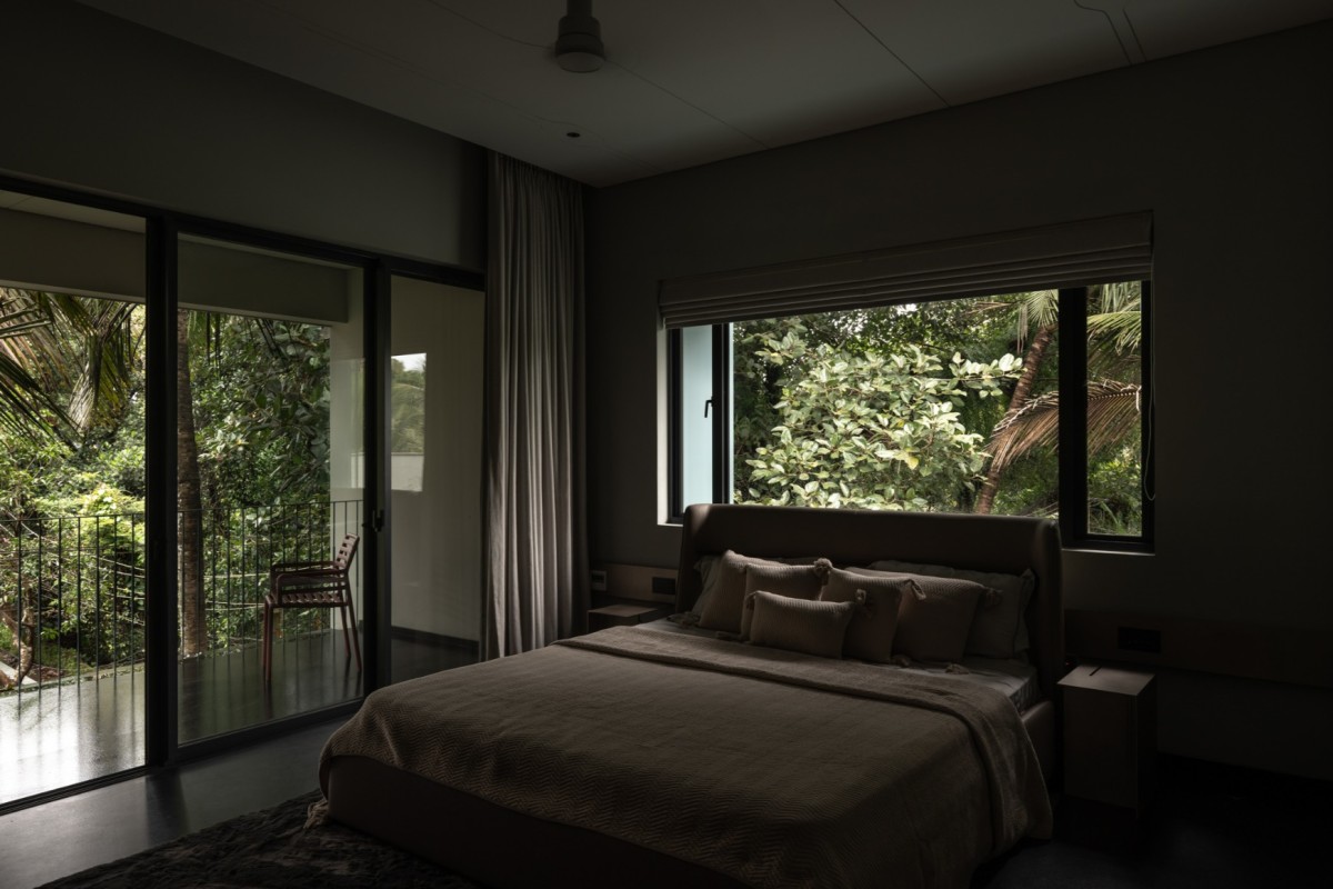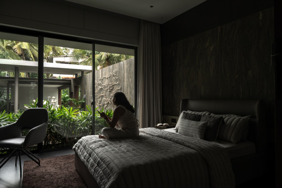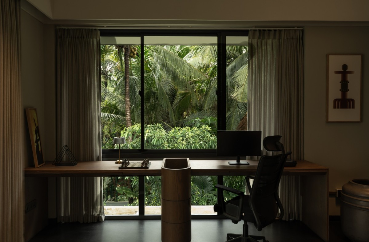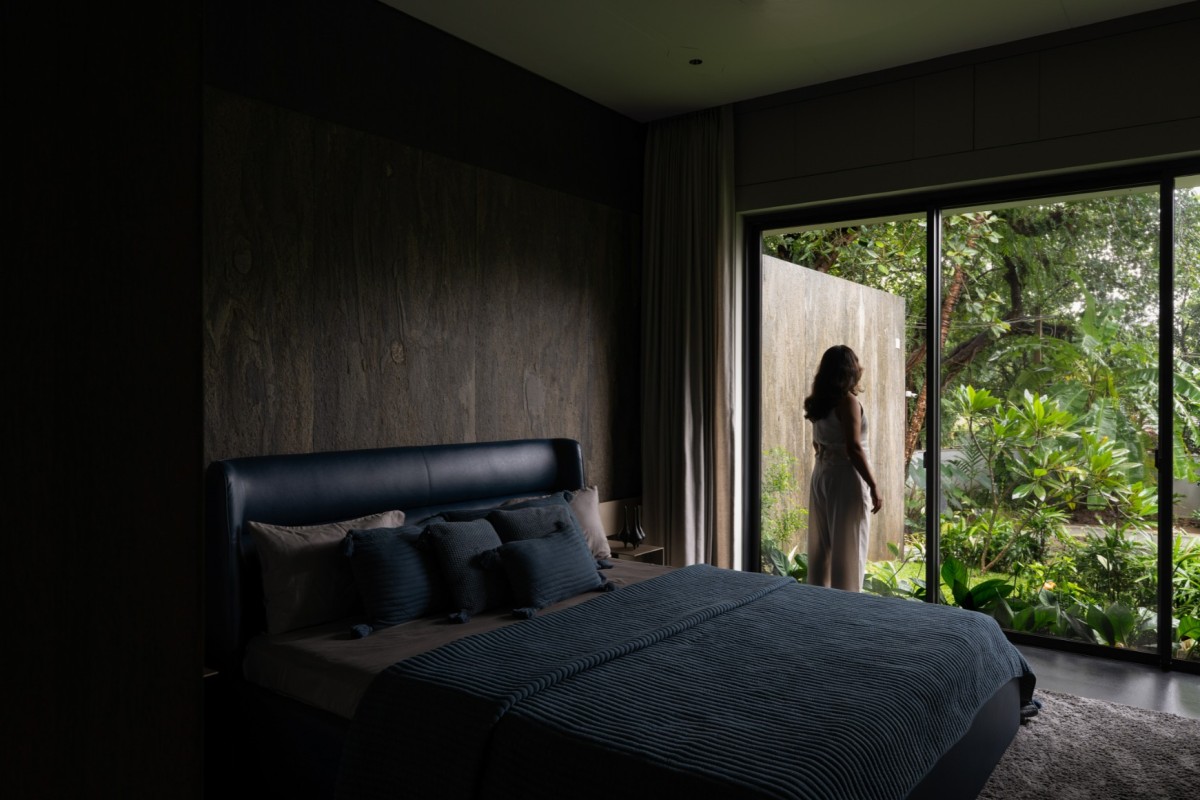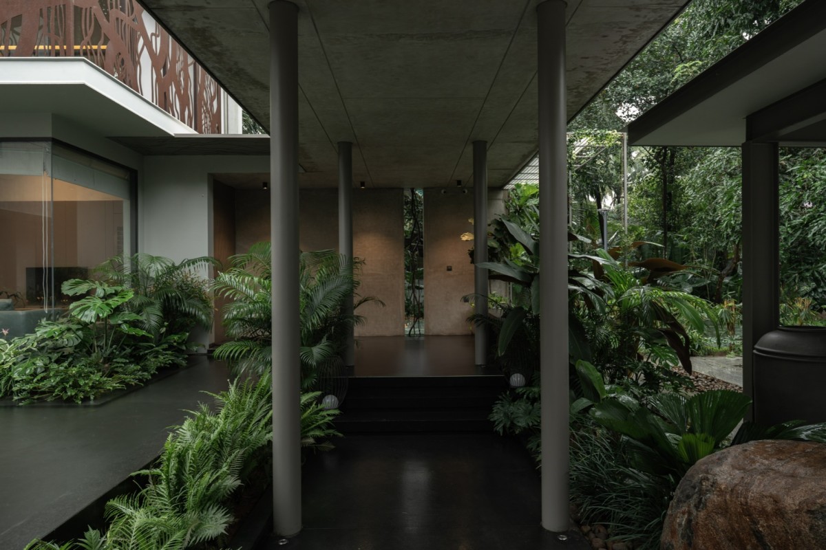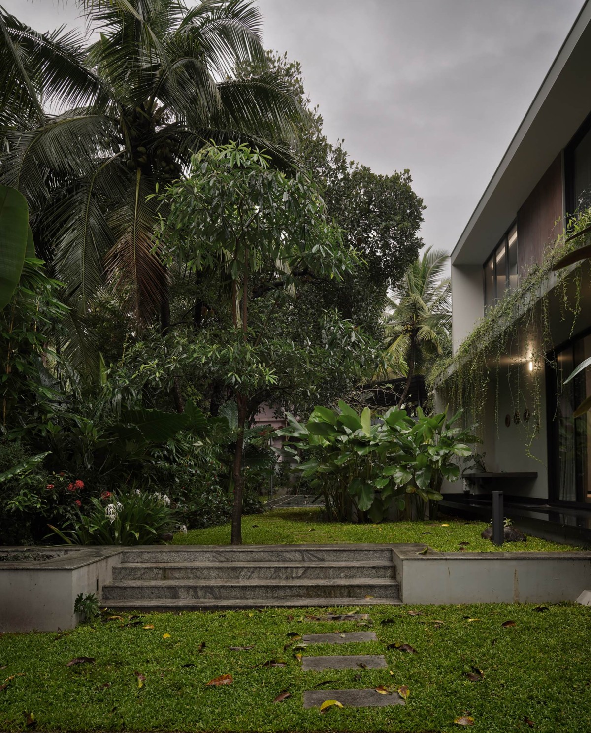 The southern block follows the site’s natural contours, allowing gentle level shifts instead of flattening the terrain. This creates spatial continuity on the upper floor, most notably in the study, which enjoys an uninterrupted view through the deck to the pool. The placement of the pool on the first floor, west side, accomplished 2 things: privacy, owing to the adjacent temple - which restricts vertical development on that edge - and freeing up the ground floor for landscaping.