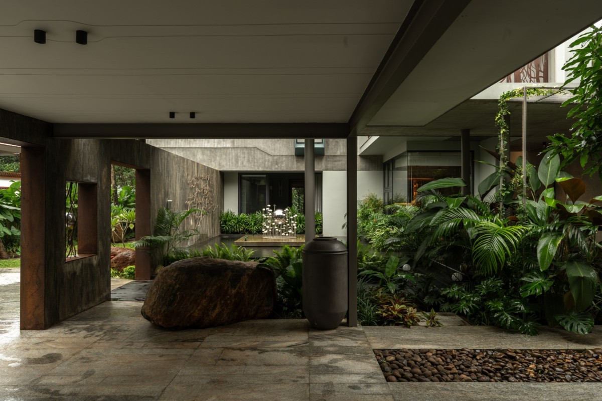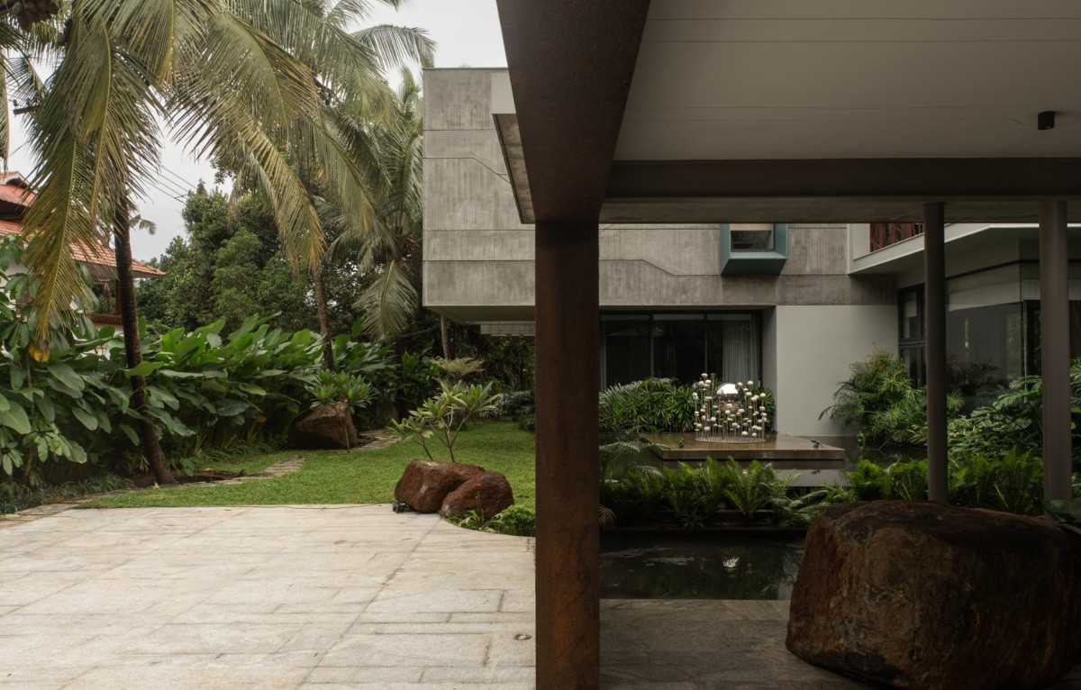 The built mass sits at the center of the site, allowing a generous backyard, a welcoming front lawn and optimal shade from the banyan. The form is a composition of 2 parallelly placed blocks, staggered with respect to each other. The masses were split to allow airflow into the main structure by inducing a buffer area in between where the openings were strategically placed to facilitate air movement. The staggered nature of the blocks produces a more dynamic form and creates nooks and niches which allow opportunities for elements of interest.