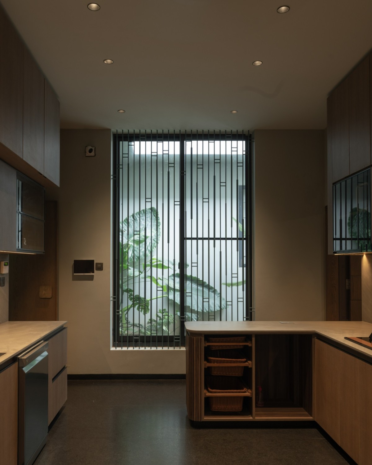 Internally, the house is separated into 2 zones. The northern block houses common areas (living, dining, kitchen) and encourages interaction, and southern block houses private areas (bedrooms, bathrooms) and ensures seclusion, separated by the buffer zone, housing the staircase and the wash area.