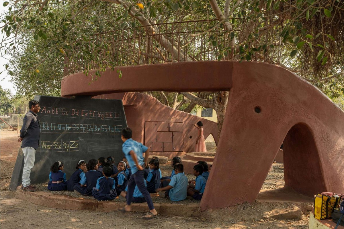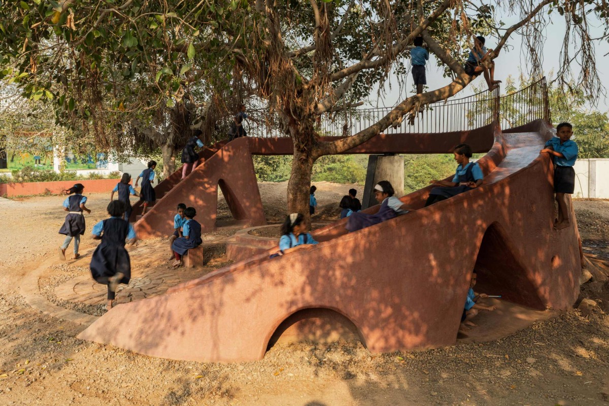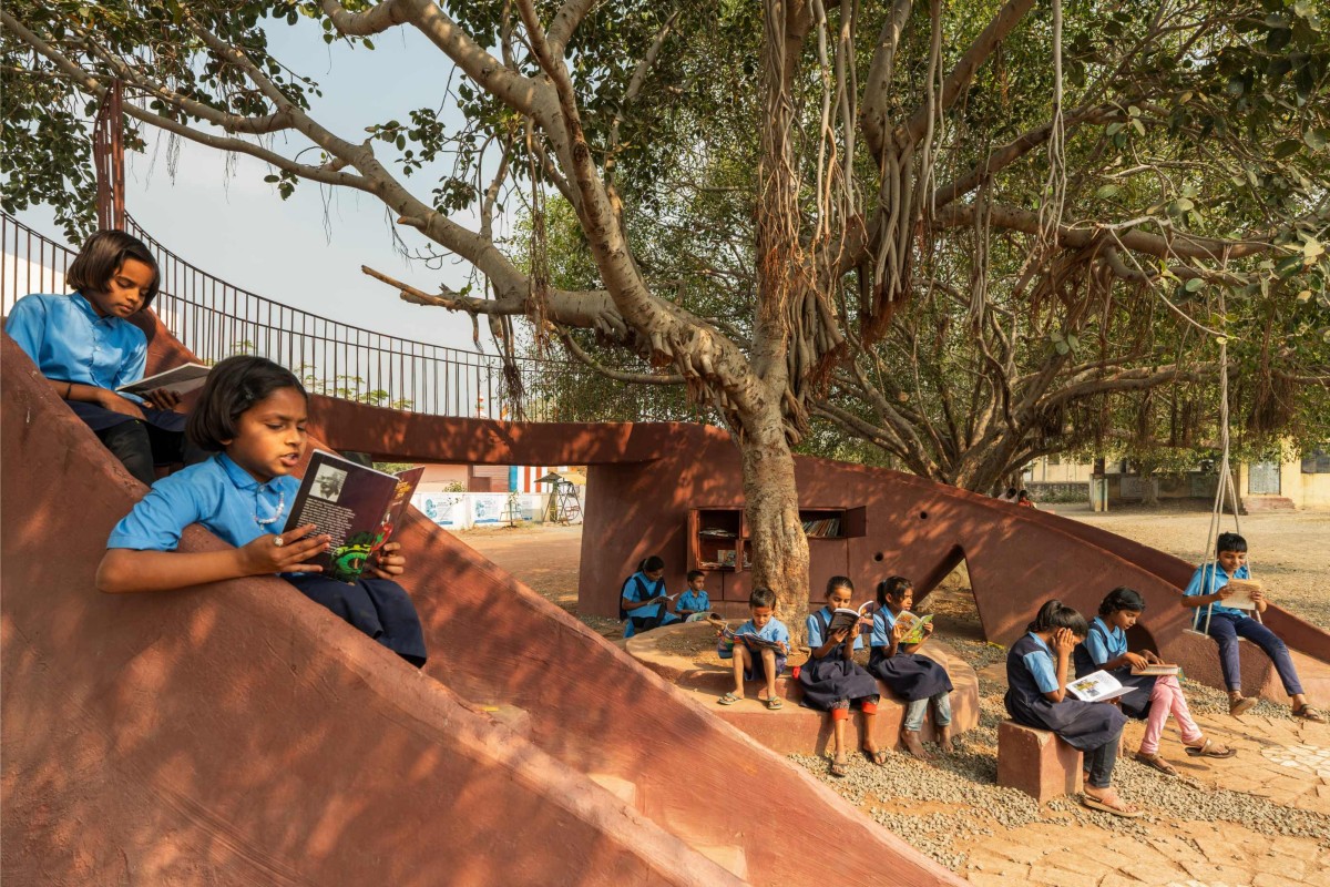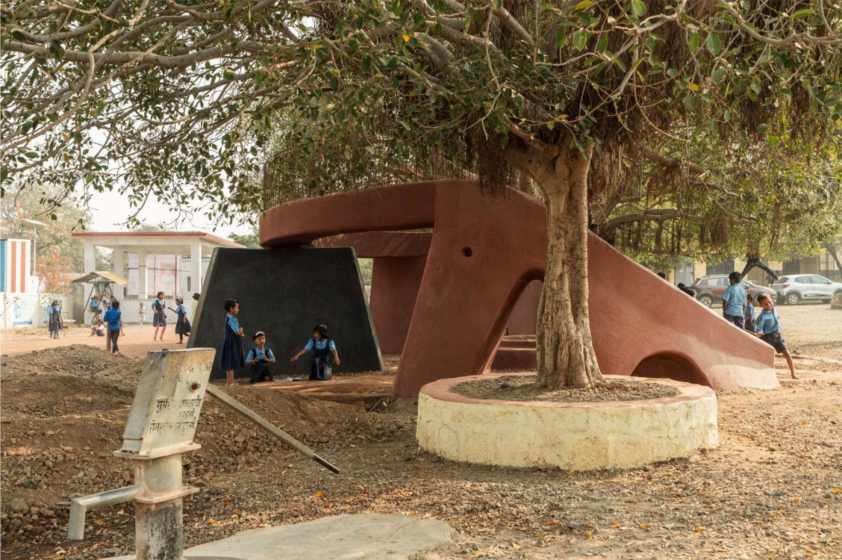 We’re happy and honestly satisfied that, with a small footprint and limited funds, we could bring happiness to the faces of the children who use the POD. They have embraced it as if it had always been there, naturally blending with the banyan tree. The POD, constructed using the ferrocement technique and finished with traditional red oxide color plaster, also incorporates waste and leftover