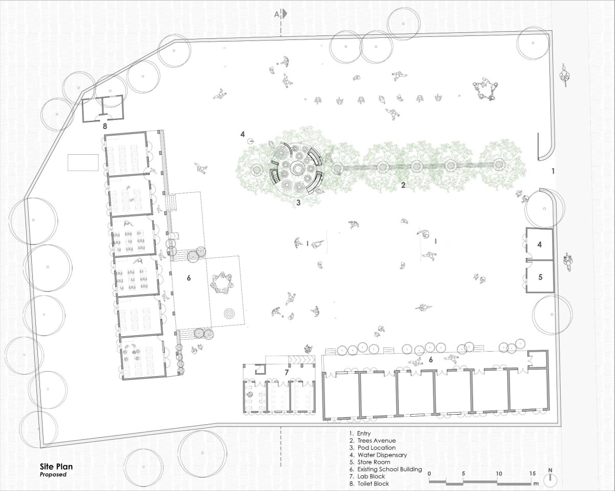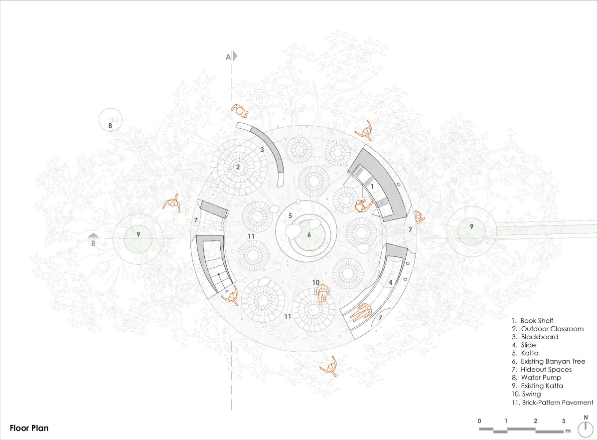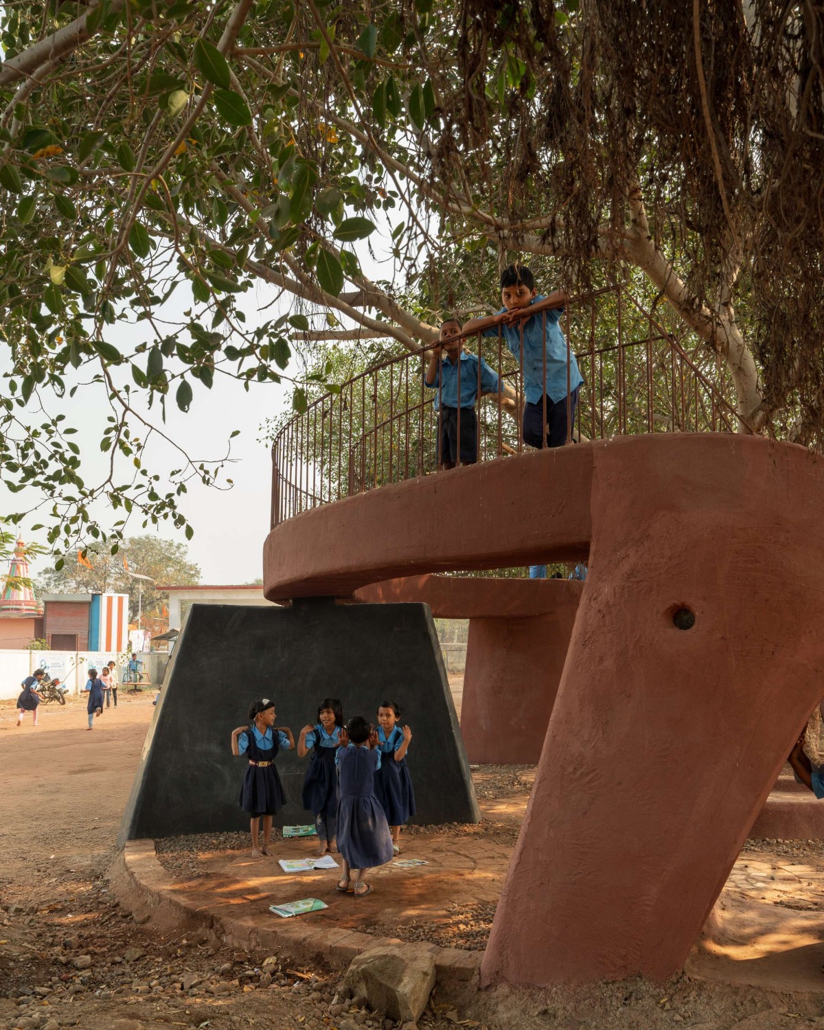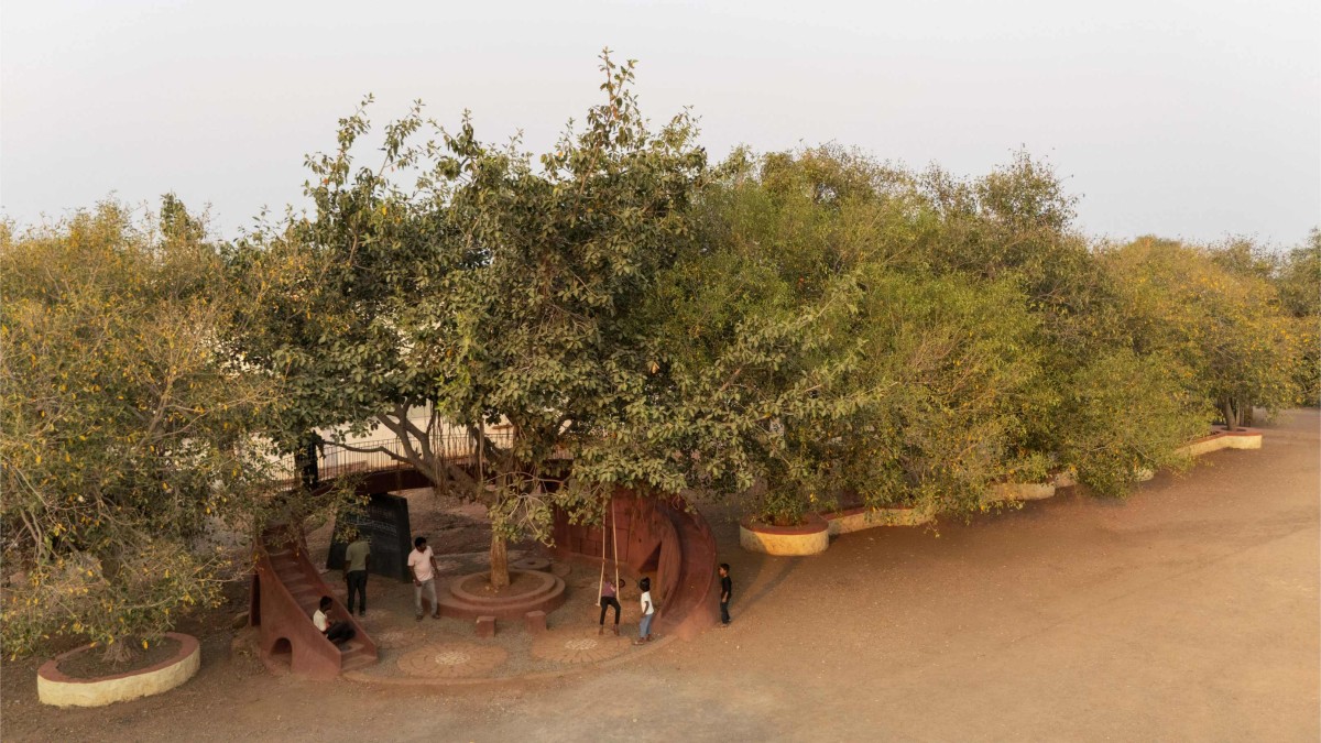 We’re happy and honestly satisfied that, with a small footprint and limited funds, we could bring happiness to the faces of the children who use the POD. They have embraced it as if it had always been there, naturally blending with the banyan tree. The POD, constructed using the ferrocement technique and finished with traditional red oxide color plaster, also incorporates waste and leftover