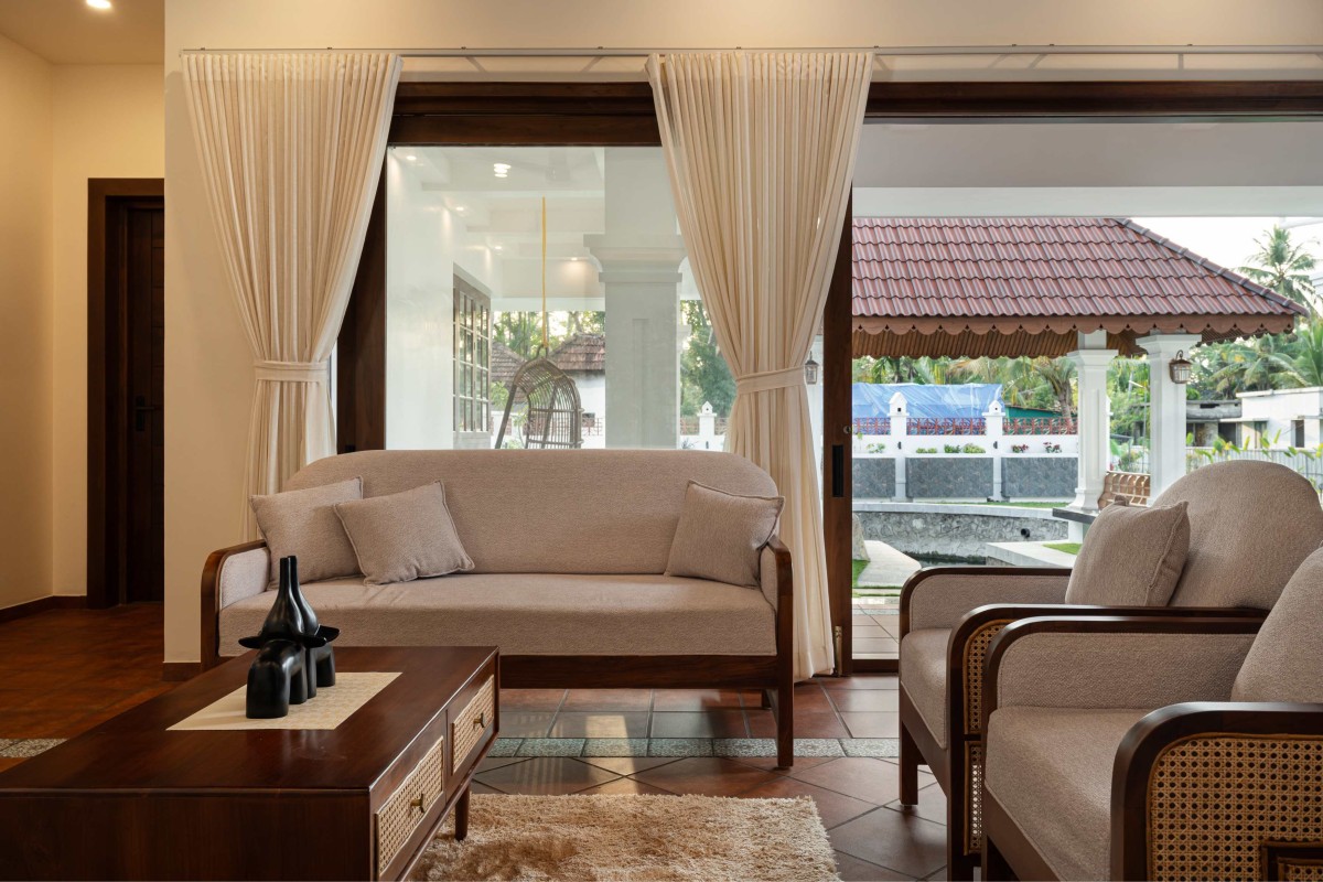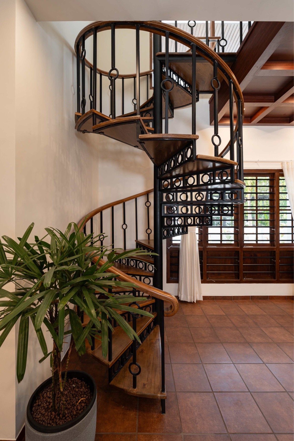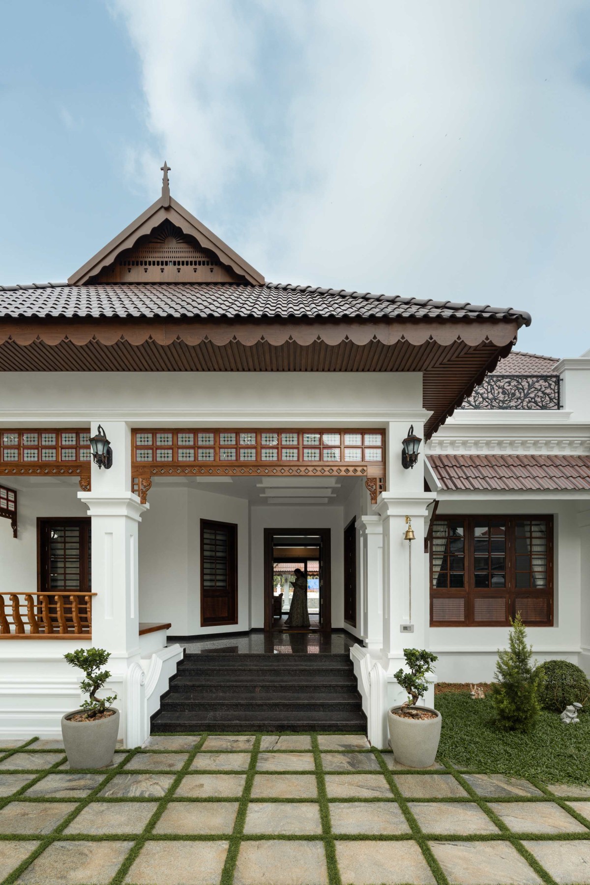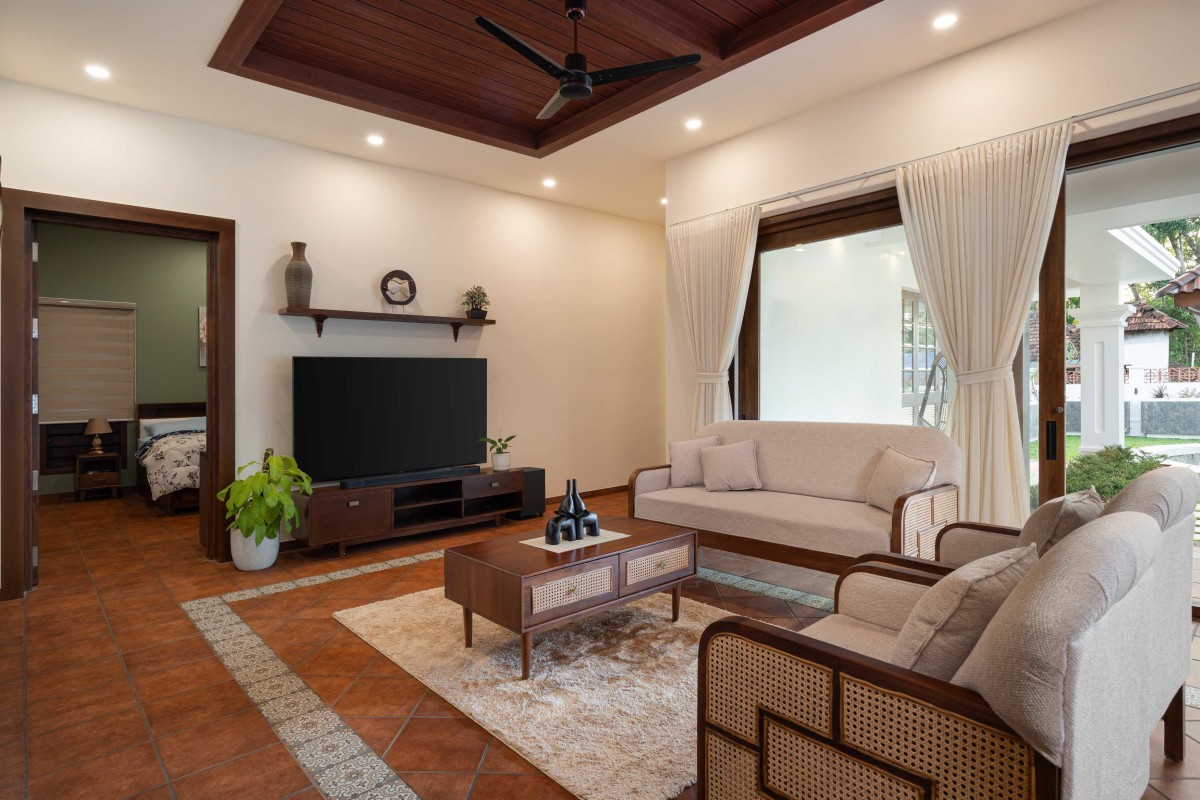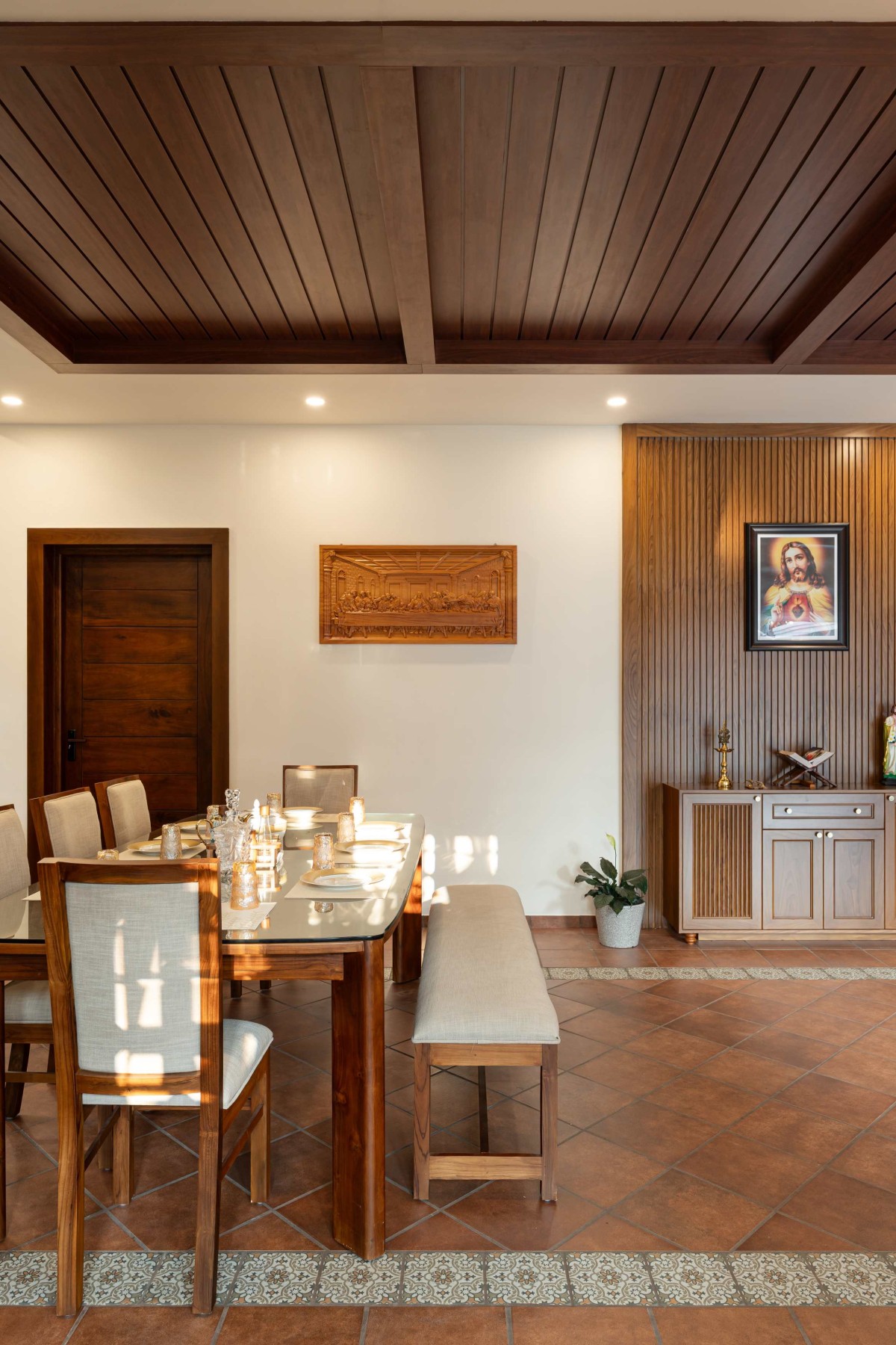 This single-storey sustainable home in Ezhupunna, Alappuzha blends traditional Kerala architecture with tropical design. Inspired by the “kulakkadavu” concept, a central pond encourages family interaction while enhancing the landscape. Despite being near lakes and beaches, adding a pond improves year-round moisture and cooling, especially during hot months. With wide openings, the home benefits from natural ventilation and sunlight, creating a bright, airy space. The perennial water supply makes the pond both a practical and aesthetic feature in this eco-friendly design.
