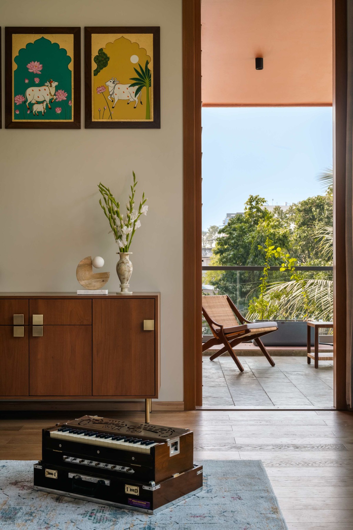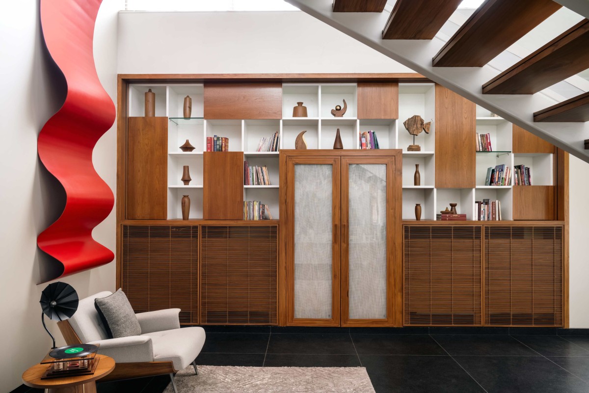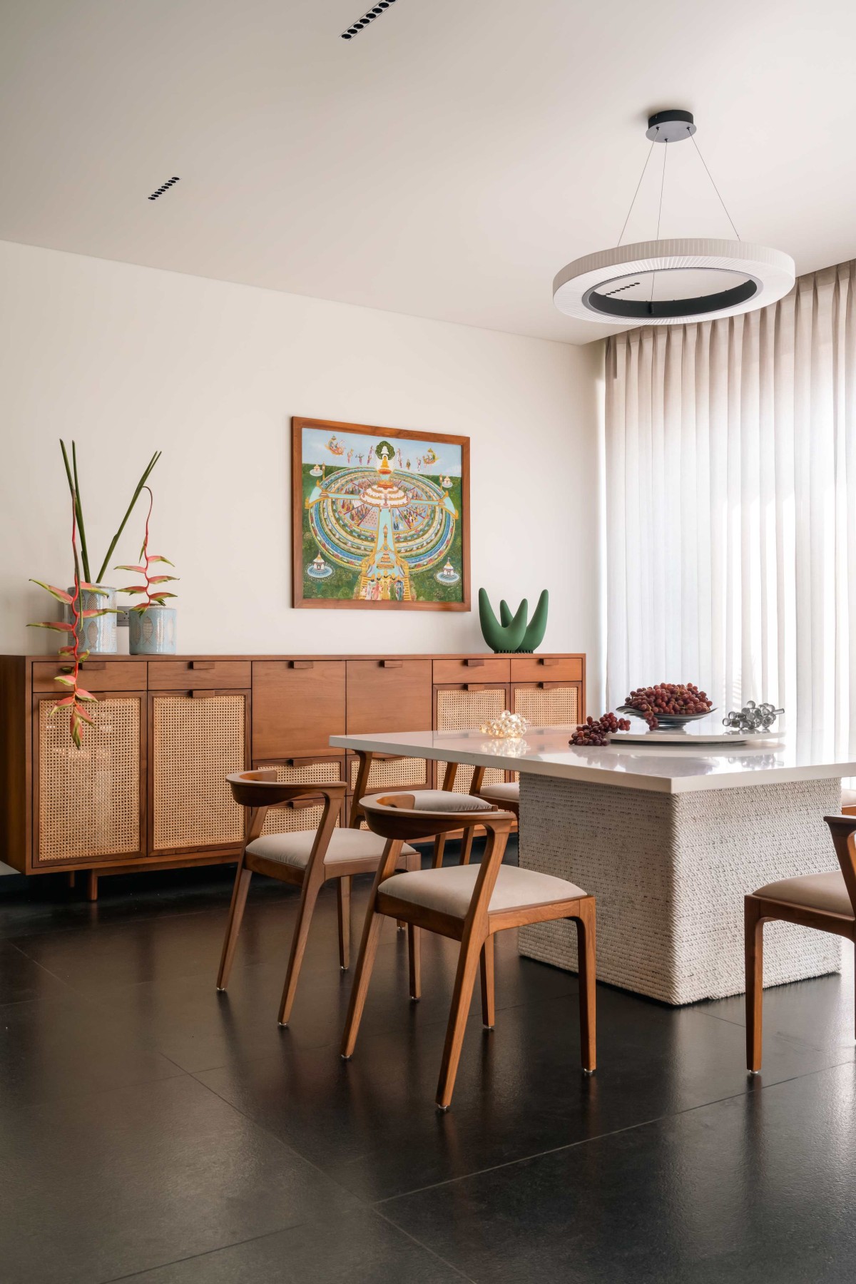 The lower ground floor features riverwash kota stone flooring in the parking, utility areas and verandahs. The flooring transitions into polished kota stone in the interior spaces of the lower ground floor. Art plays a very important role in this house and can also be perceived as a material for the dimensionality, texture and warmth that it adds to the space. The entrance features a wall art over the console, backed by wooden posts and a cane mesh that functions as a screen.