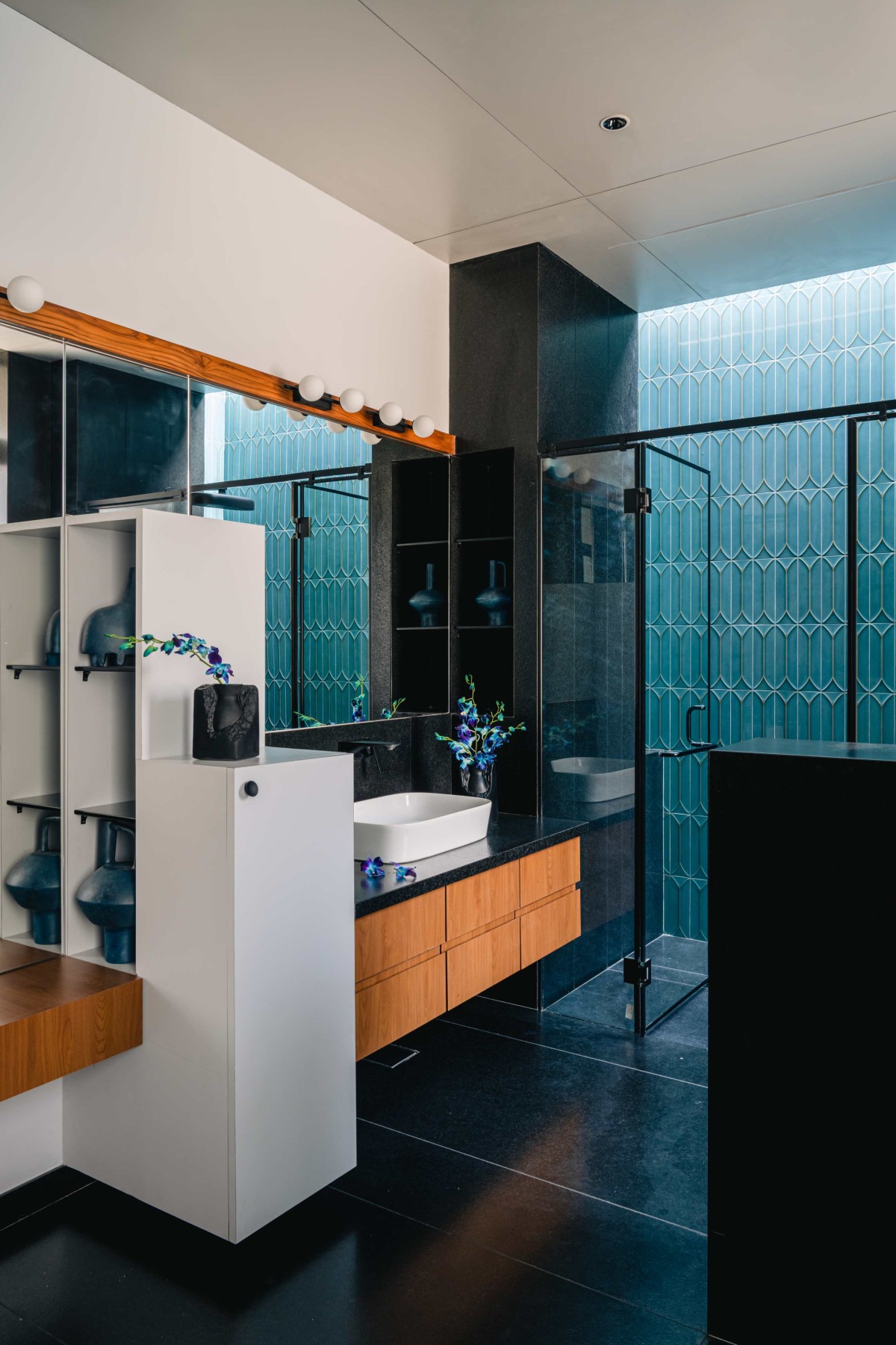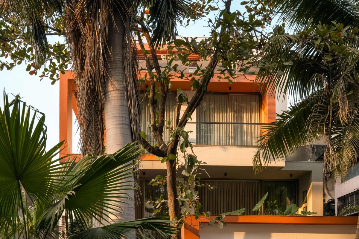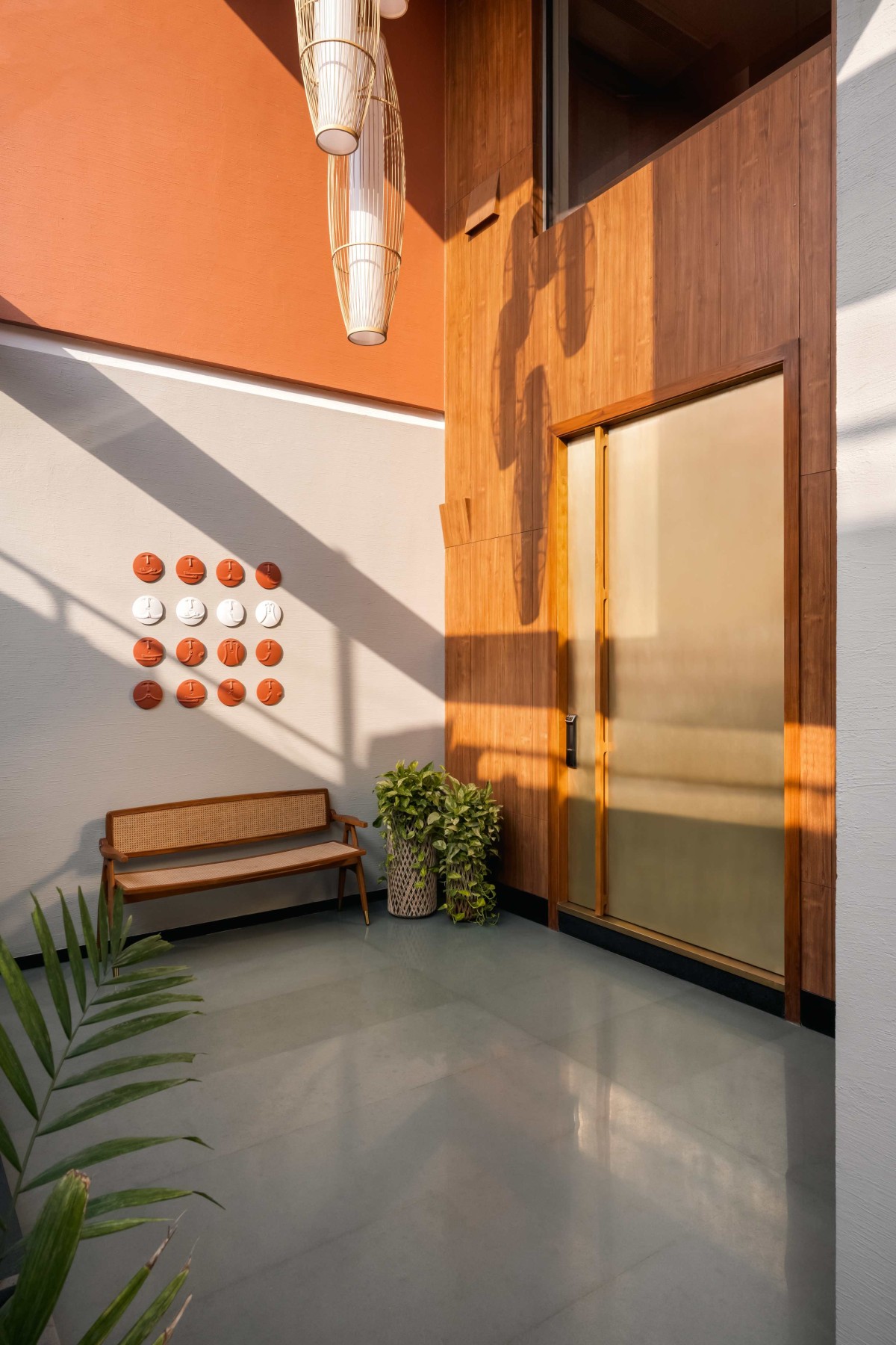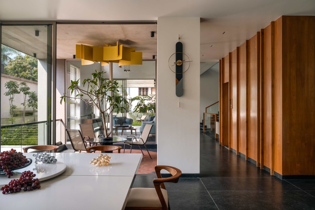 The residence is structured with a concrete framework and traditional brick masonry. A terracotta-hued exterior defines the built form, with each floor stepping back to create setbacks, framing levels as the building rises. This rhythmic layering not only shapes the façade but also allows light and ventilation to flow through the spaces. At the entrance, a brass door introduces a sense of warmth, contrasting with the otherwise muted material palette. Inside, the flooring choice makes a striking impact. Leather finish black granite runs through the house, an unconventional selection in Indian households where lighter tones are often preferred due to maintenance and cleaning being an important factor. However, given the sheer amount of natural light streaming in, the dark floors ground the space without making it feel heavy. The surfaces react to changing light conditions throughout the day, adding another dimension to the interiors.