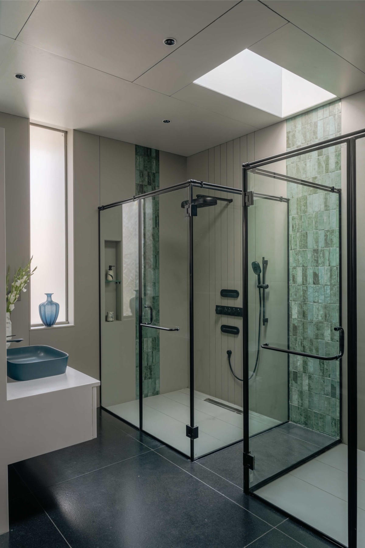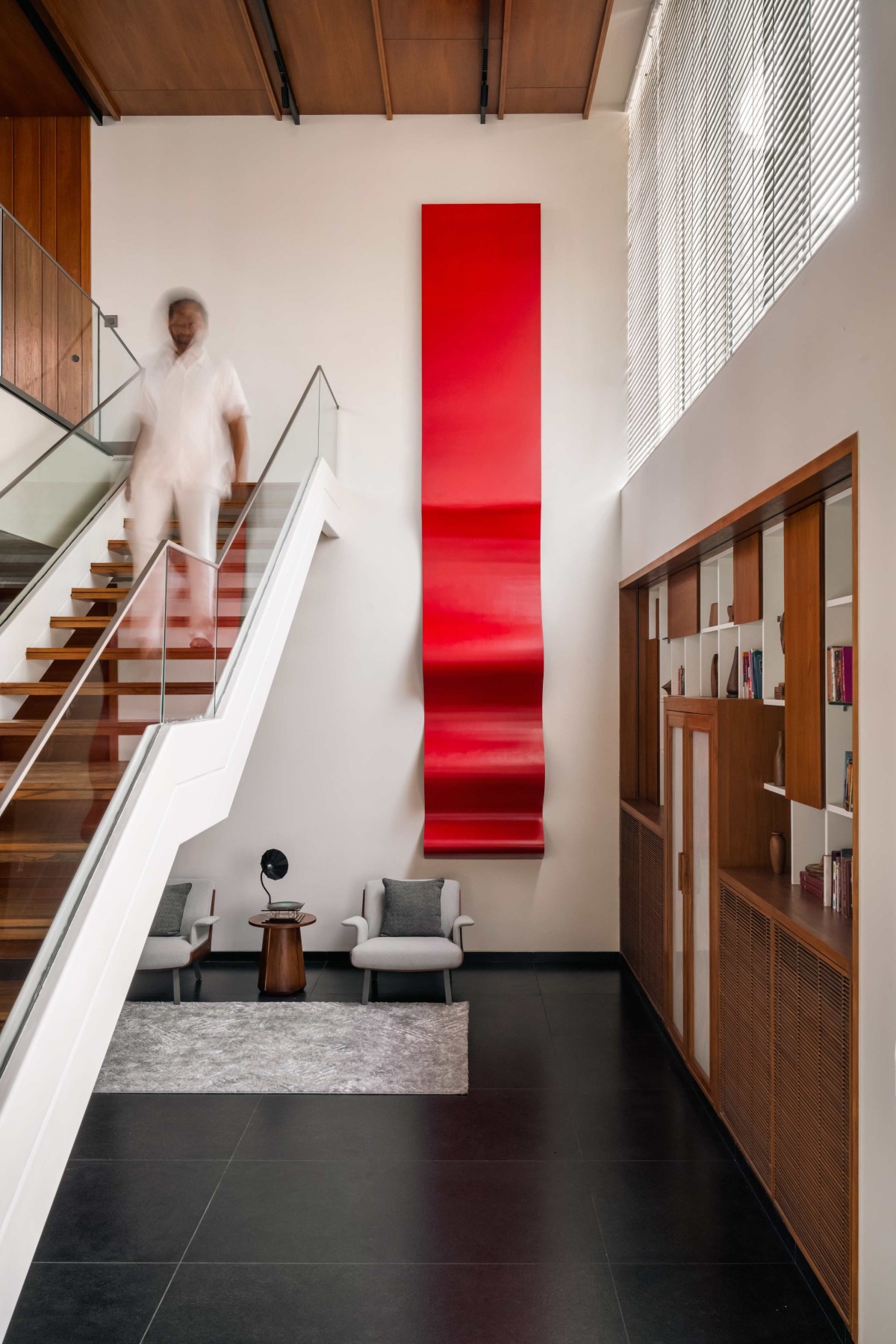 The double-height reading lounge is a key spatial moment, defined by an 18-foot-tall red artwork that anchors the space. Across the house, colors have been carefully selected to influence the atmosphere—some inducing calm, others adding vibrancy, all coming together to shape the experience of the home. Few projects come with the rare opportunity to be designed twice, two decades apart, for the same family and on the same land. Having understood how the family lived in their previous home, the architects were able to respond to both past and present in this new iteration that meant to cater the future of this family. The result is a house that is deeply personal yet adaptable, one that embraces change while staying connected to its origins.
