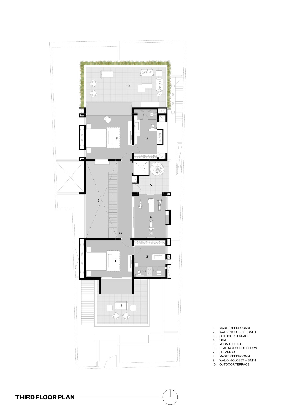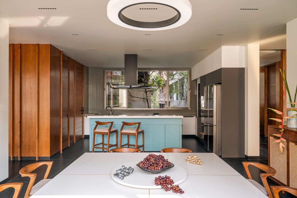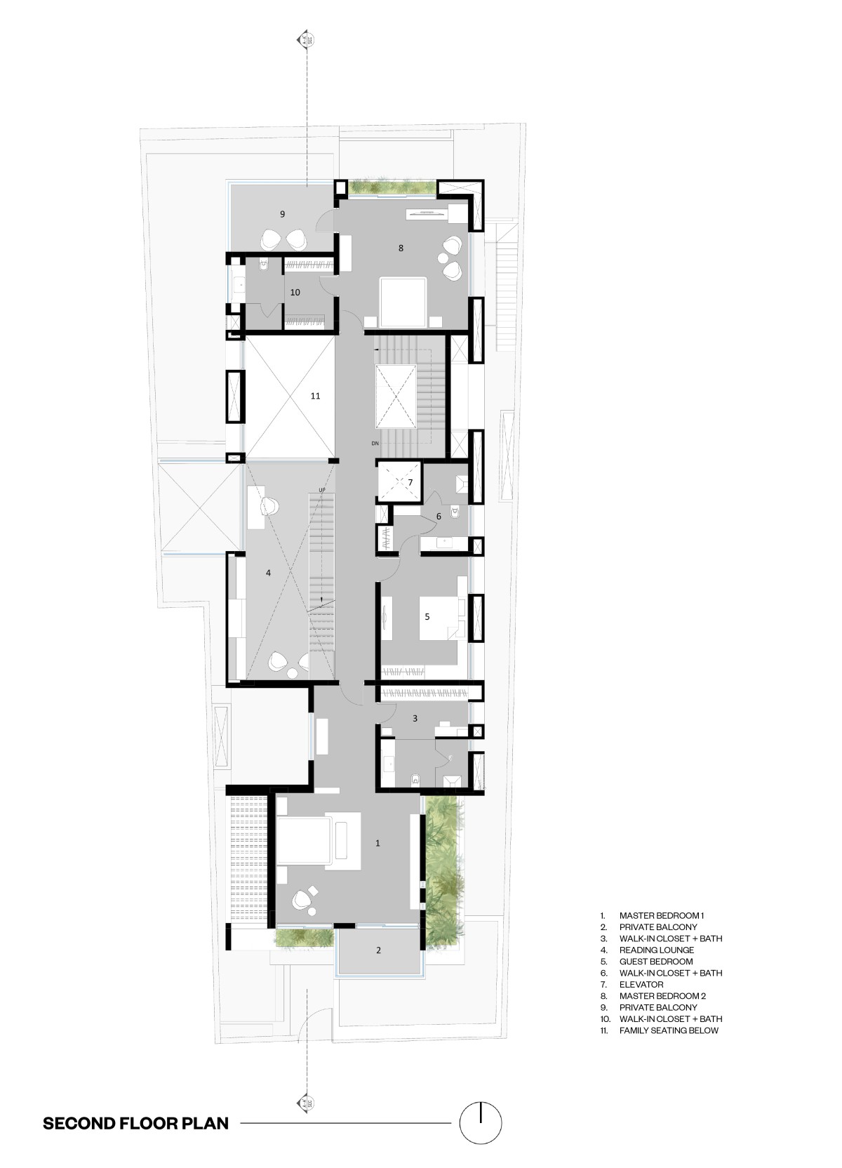 At AAPL, the design team decided to challenge the site constraints and ensure maximum visual and physical connections between each space. At the center of it all is a staggered double-height volume flowing through the family room and the reading lounge, carving out a sense of openness while maintaining a hierarchy of privacy. This core allows for uninterrupted sightlines between floors, reinforcing a sense of togetherness within the multi-generational household.