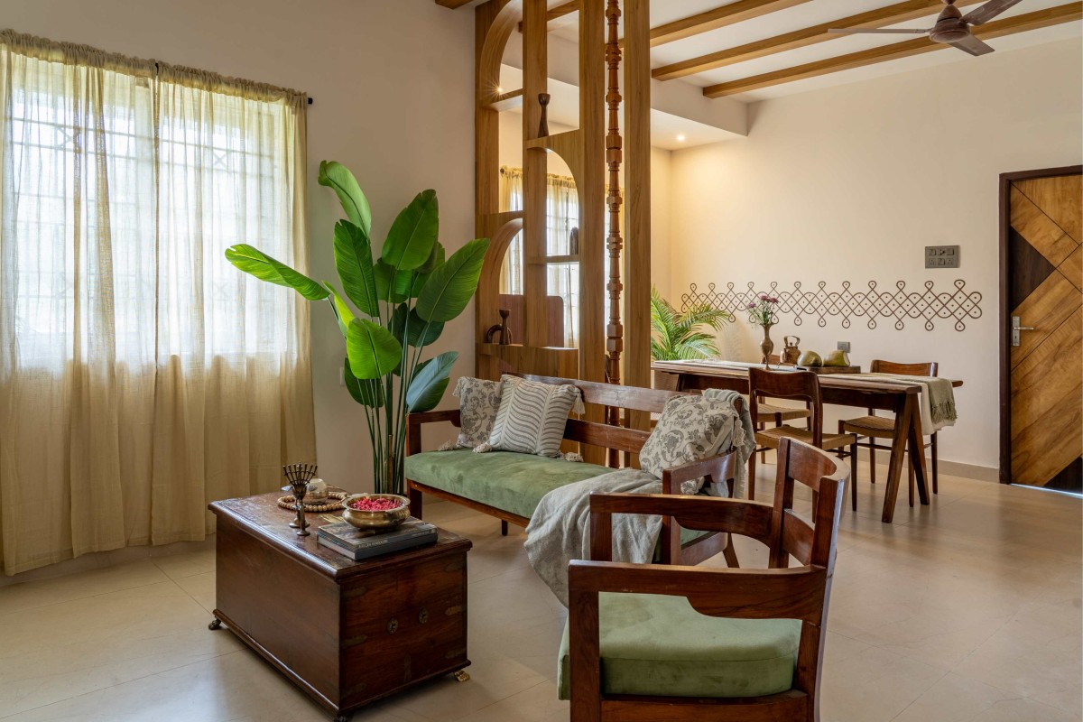 Detailed shot of wooden partition between living & dining of Project Ādya by Concept-D Architects