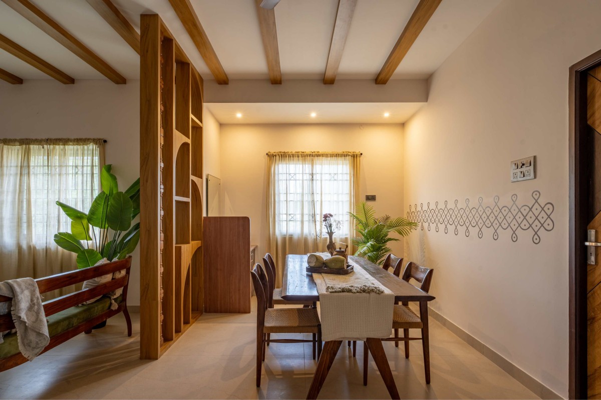 The planning ensures that the interiors flow intuitively while maintaining a balance of openness and subtle zoning. The living room sets the tone with its warm furniture, wooden accents, and cozy atmosphere. A carefully crafted partition introduces definition without blocking connectivity, creating a sense of separation while retaining visual continuity.