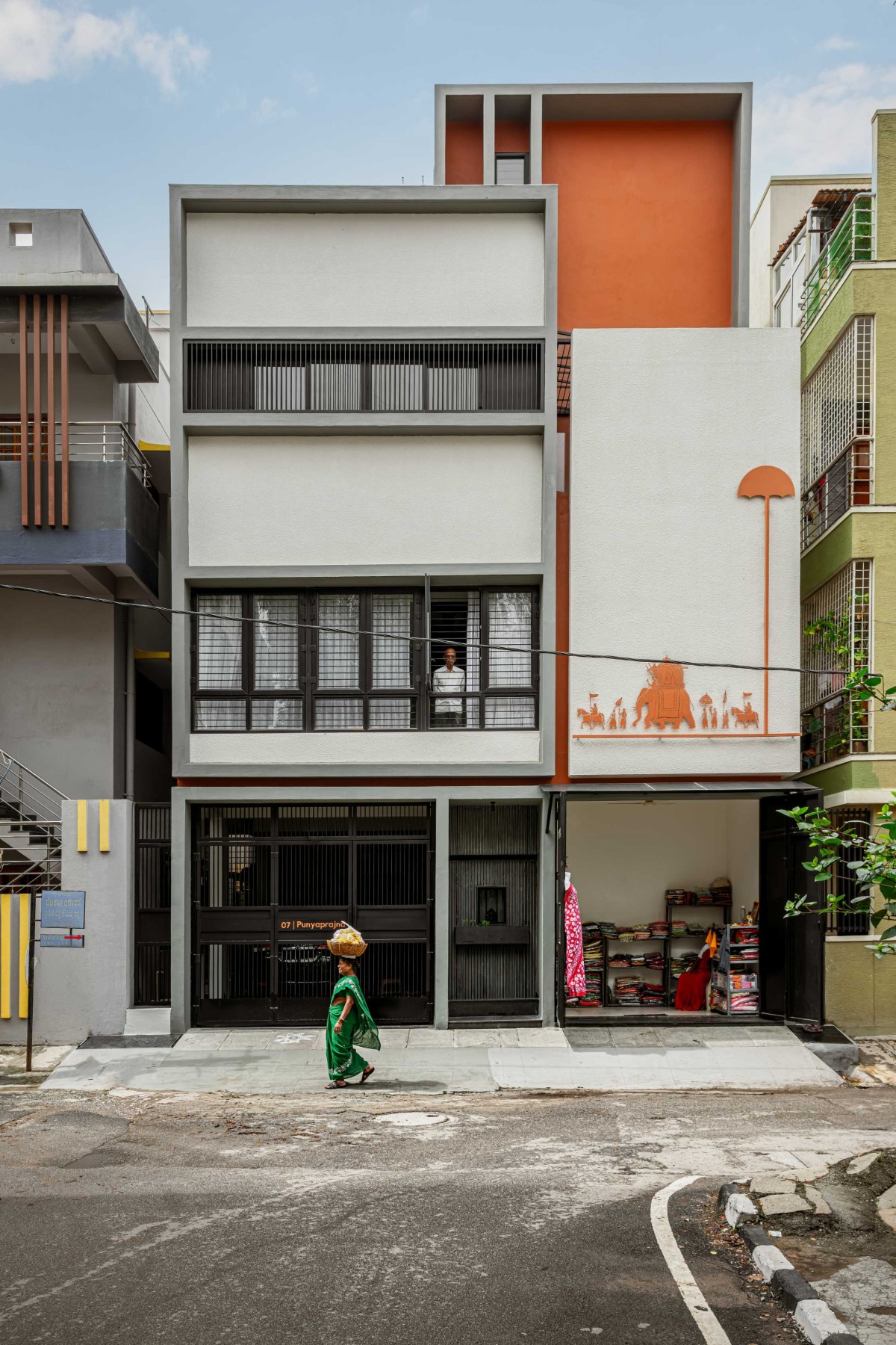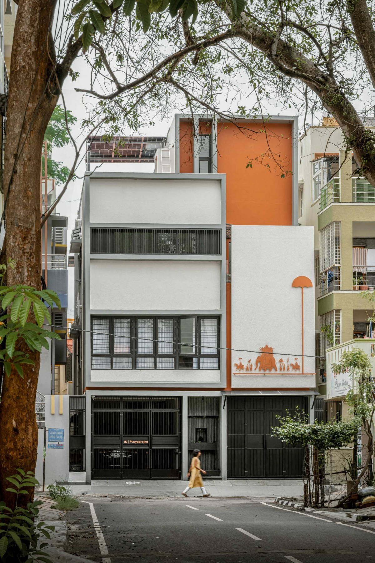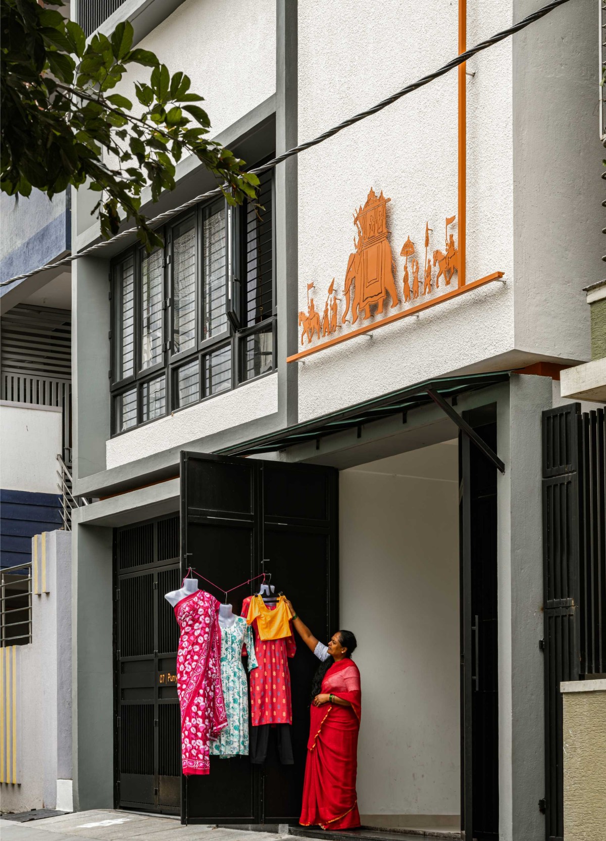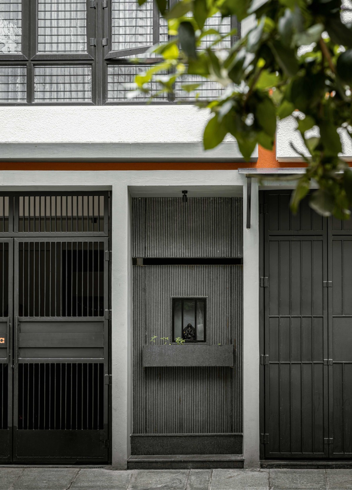 At the ground floor, the functional elements - the parking gate and the shop shutter are unified in a singular black, monolithic design. The use of different finishes creates textural depth within the single color palette. This dark, grounded base allows the Ganesha and planter to stand out just enough, thoughtfully setting the stage for the dramatic Dasara cutout above, ensuring the cultural iconography remains the primary focal point.