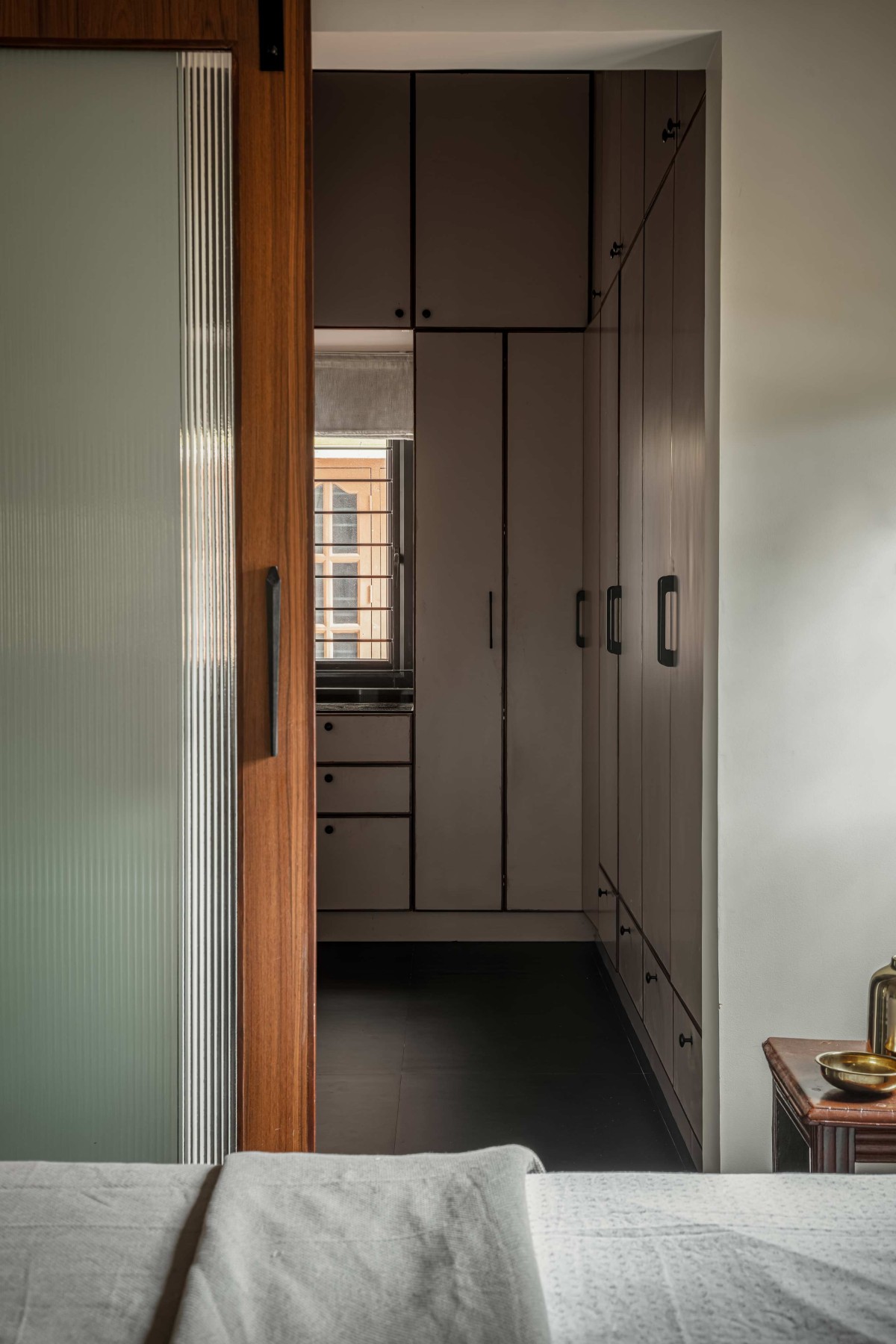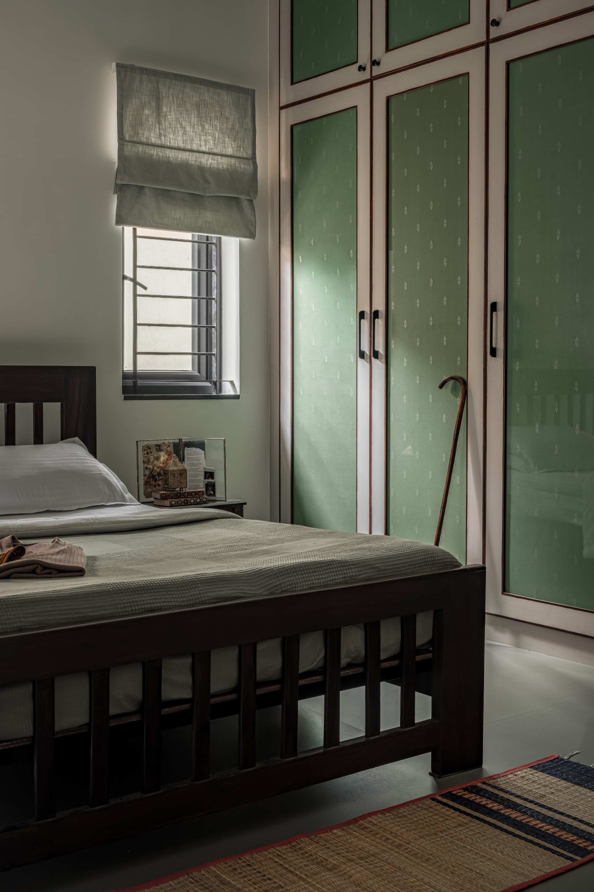 The grandparents' bedroom is conveniently located on this floor. The bed frame was custom-built from old rosewood rafters the client already owned, ensuring minimal waste. To counter any visual flatness, the wardrobe shutters were finished with fabric, introducing essential texture and breaking up the room's monochromatic nature.