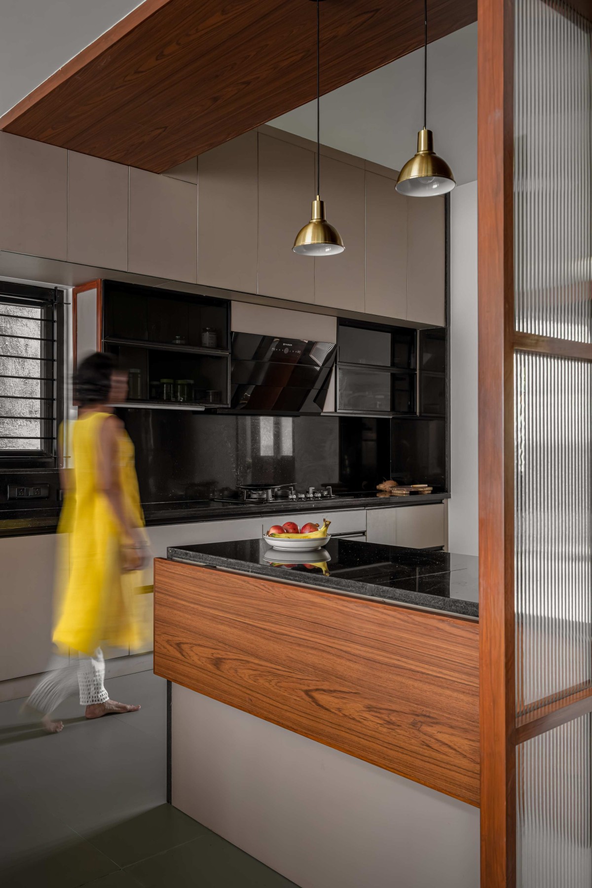 Across from this is a fully black pooja room, designed to evoke the serenity and solemnity of a garbha griha (sanctum sanctorum). The space is completed by a remarkable 100-year-old, 500 kg metal chest, which required the use of a crane for installation, a testament to the family's commitment to honoring their legacy pieces.