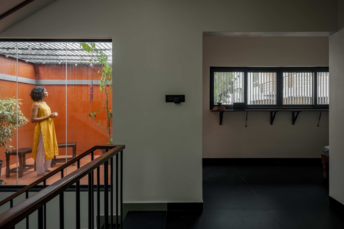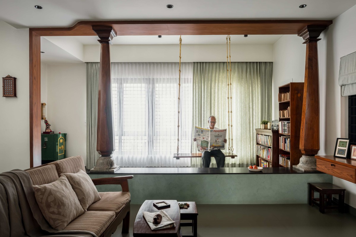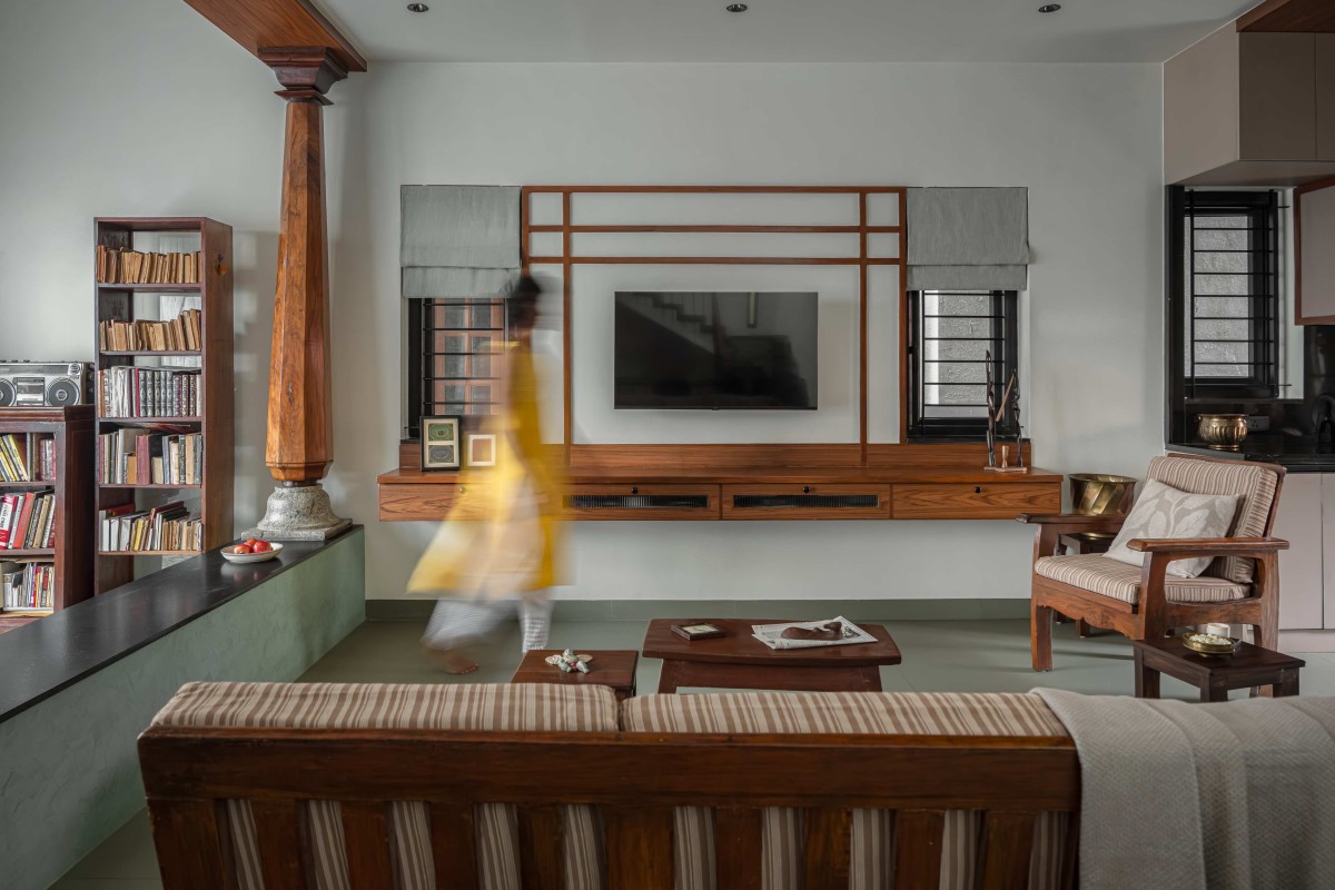 The first floor is the primary shared living space, designed as an elegant and multi-functional core. The living room is brightly lit by immense windows that open onto an ingenious internal interpretation of a traditional verandah, complete with an old wooden column on a locally sourced stone base, and a reused swing. This transitional area is visually differentiated with patterned tiles and black granite; and serves as a quiet reading space, housing the family's collection in reused old wooden bookshelves. Yet, the true anchor of this space is the old stereo; positioned on the shelf, its daily use for listening to old Kannada songs ensures the past resonates vividly in the present.