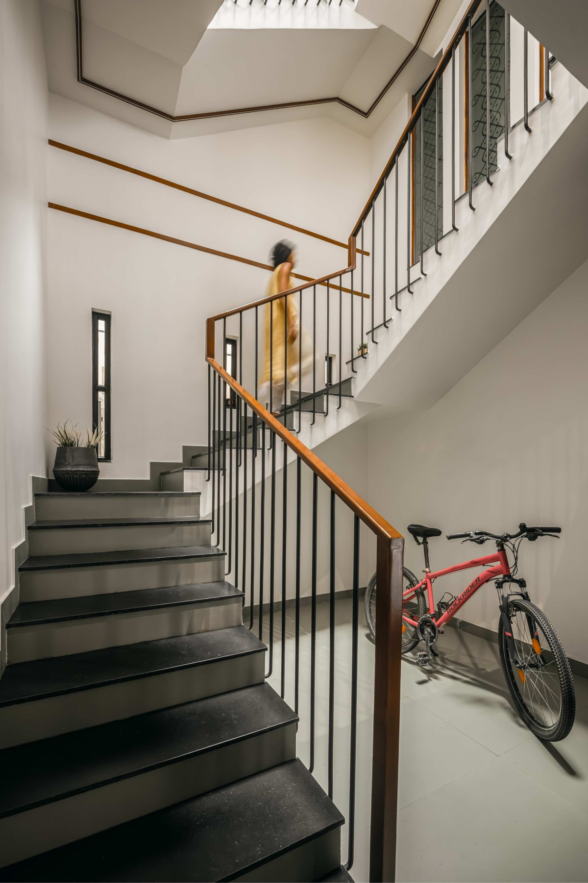 The journey between floors is itself a design feature. A skylight above the staircase transforms the ascent, casting beautiful, ever-changing light patterns onto the walls below.