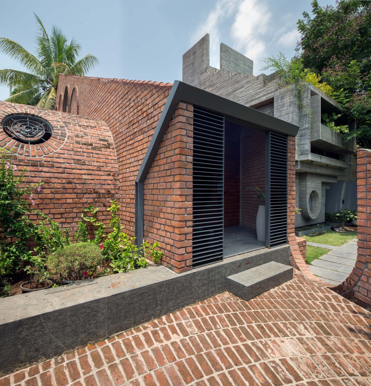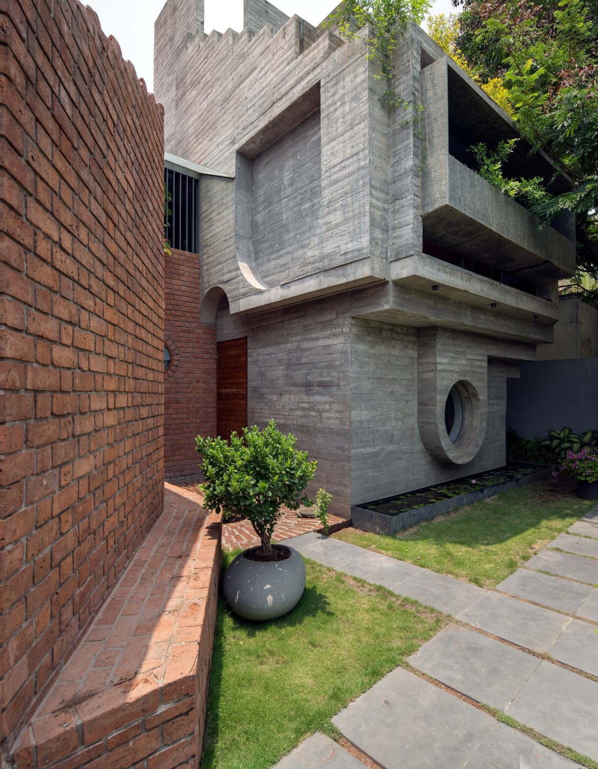 The L-shaped block recalls these traditional sensibilities with its exposed brick walls and a sloping roof that nearly touches the ground. Built with locally sourced brick and crafted by local artisans, it reinterprets vernacular values in a contemporary way. In contrast, the adjoining cuboidal volume draws from the architectural language of the colonial and post-colonial eras. Its 200mm exposed concrete walls reinterpret stone as poured concrete, with layered surfaces and subtle offsets, forming an Indo-brutalist identity. The block concludes with a modest planted terrace offering a quiet pause within the composition.