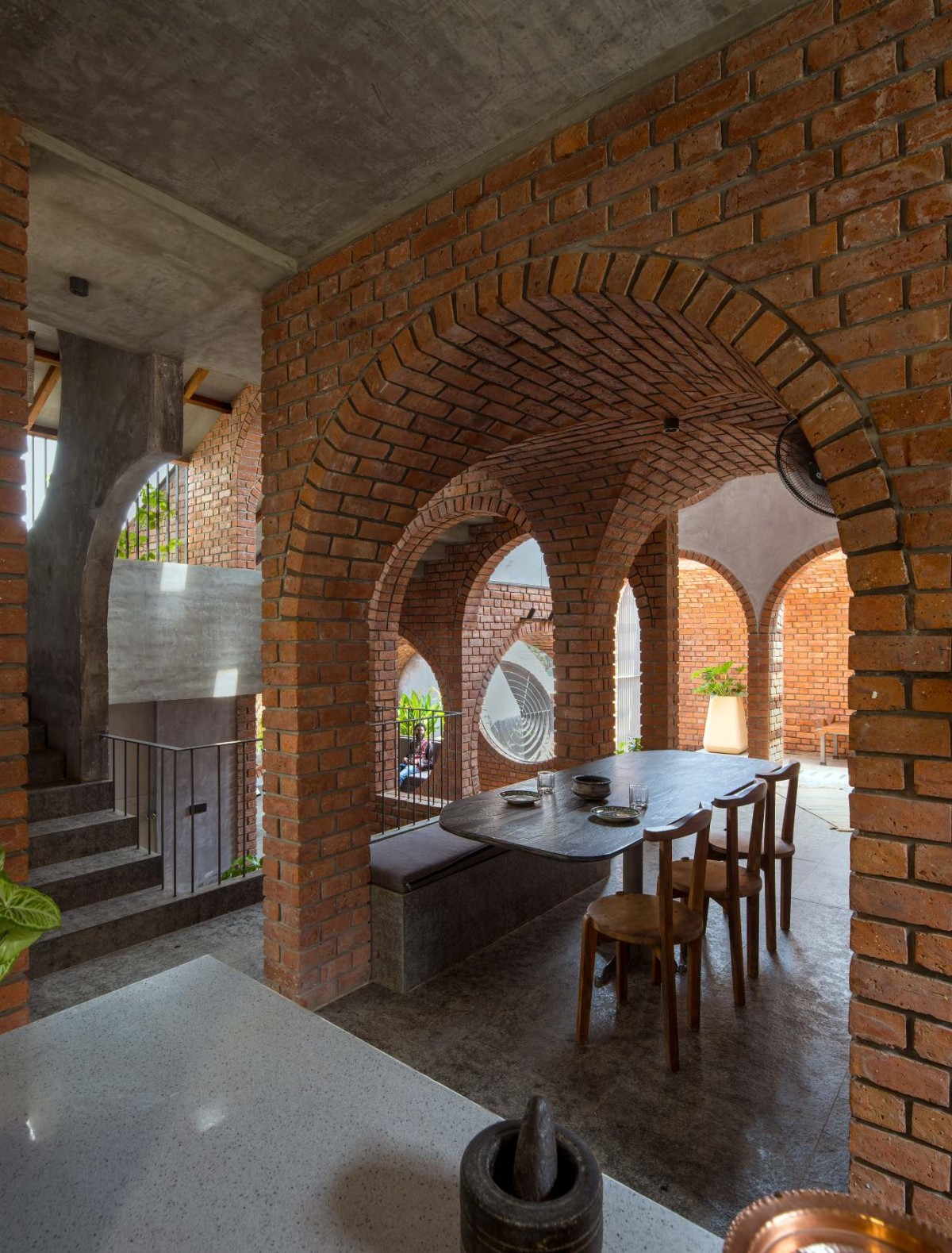 Although internal spaces follow a common grid, each expresses a distinct architectural language. The L-block reveals itself through circular openings, arches, vaults, and niches, lending softness, rhythm, and spatial richness. As this block meets the concrete cuboid, the geometry of openings shifts - arches become straight lines, and curves become planes, marking a subtle transition. The material palette reinforces this contrast: brick brings warmth, tactility, and curvature, while concrete introduces order and stillness. Despite their differences, the two blocks are unified by light, movement, and visual continuity, with the courtyard and staircase mediating between intimacy and openness to form a seamless whole.