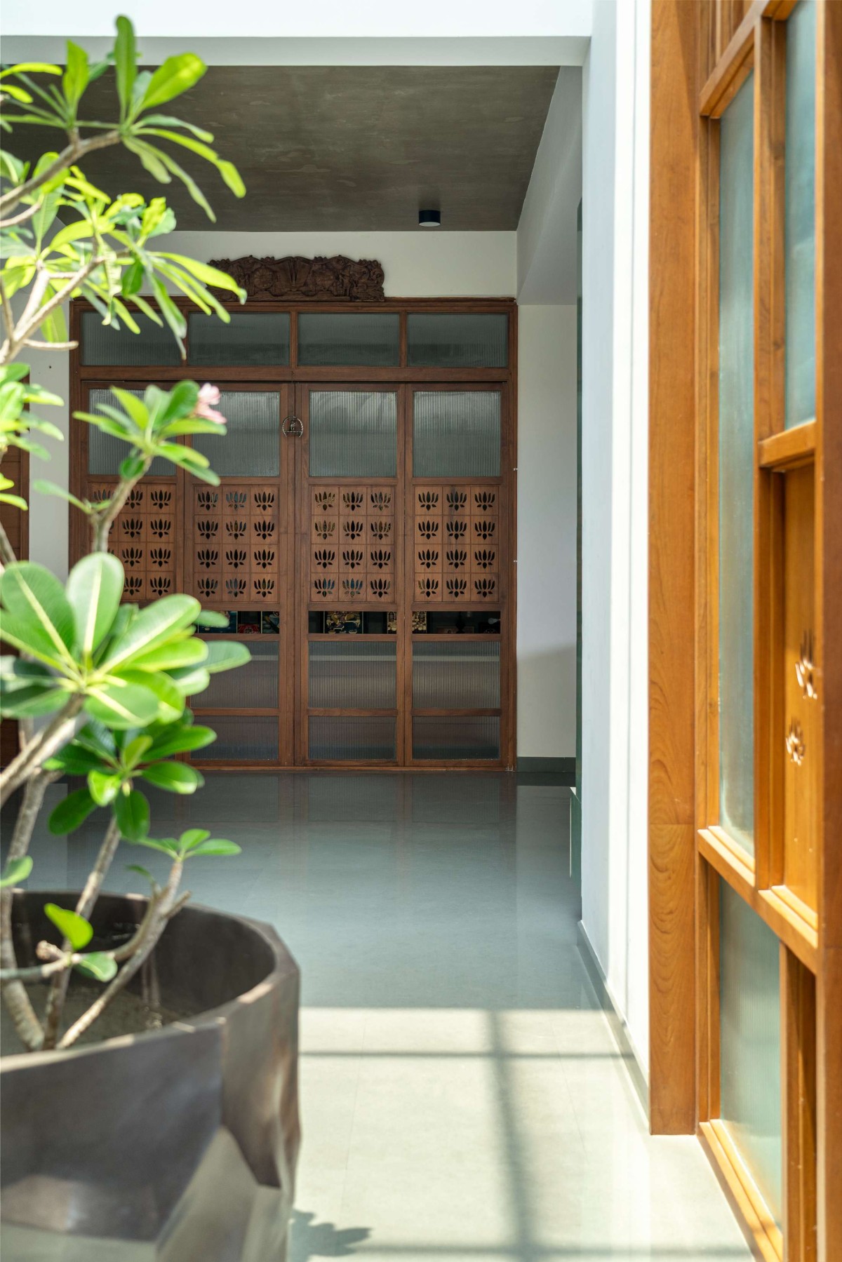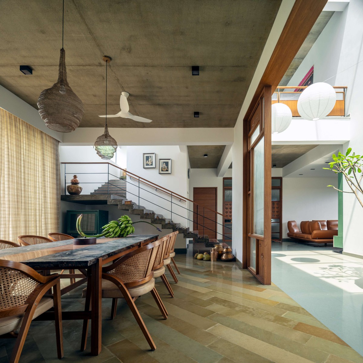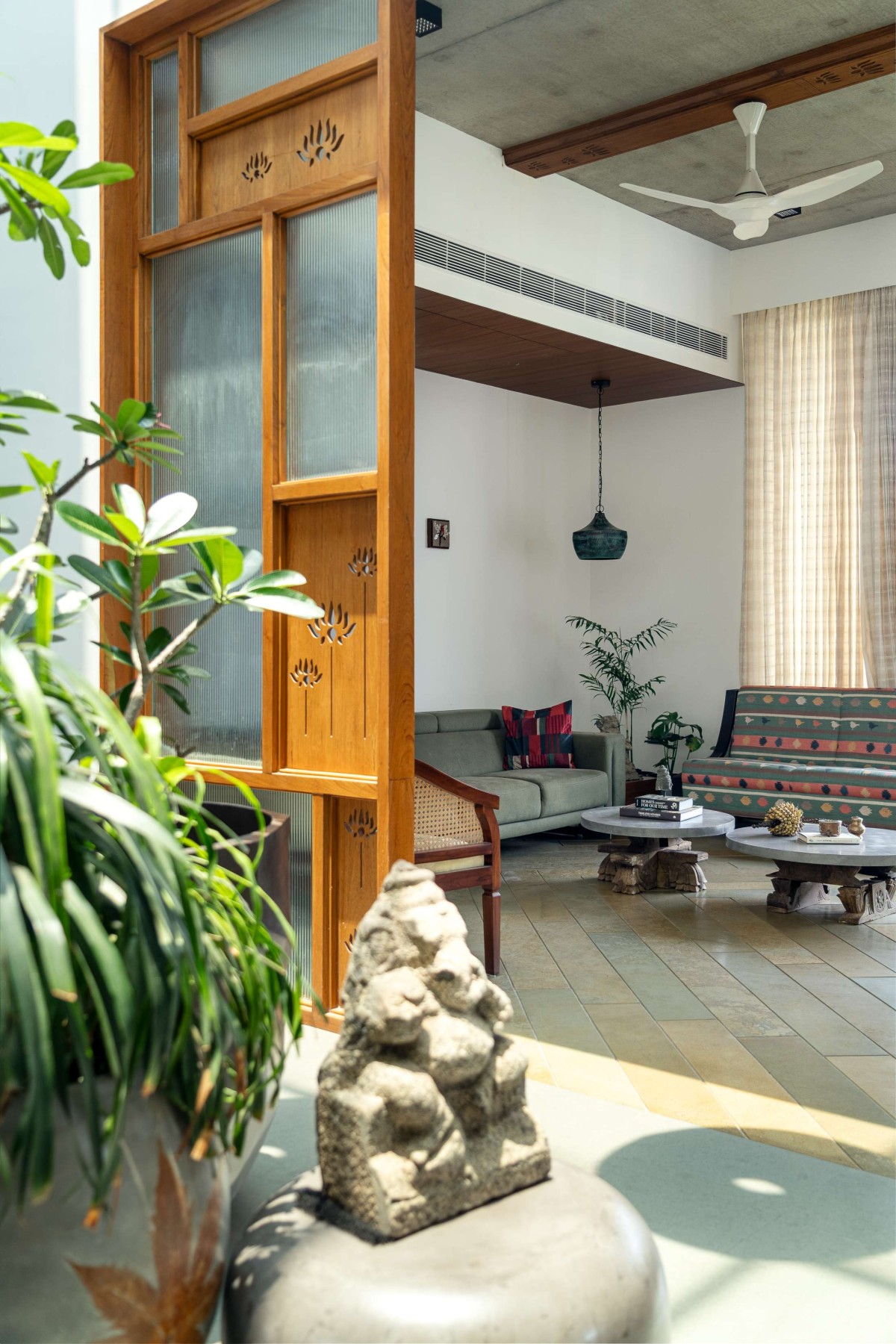 The material palette is kept deliberately neutral and grounded. Various patterns and inlays of Kota stone define the flooring across the home, providing both durability and thermal comfort. Ceilings in select areas are left exposed, revealing the natural texture of concrete, while teak wood accents in doors, trims, and screens add a tactile warmth and a sense of crafted elegance.