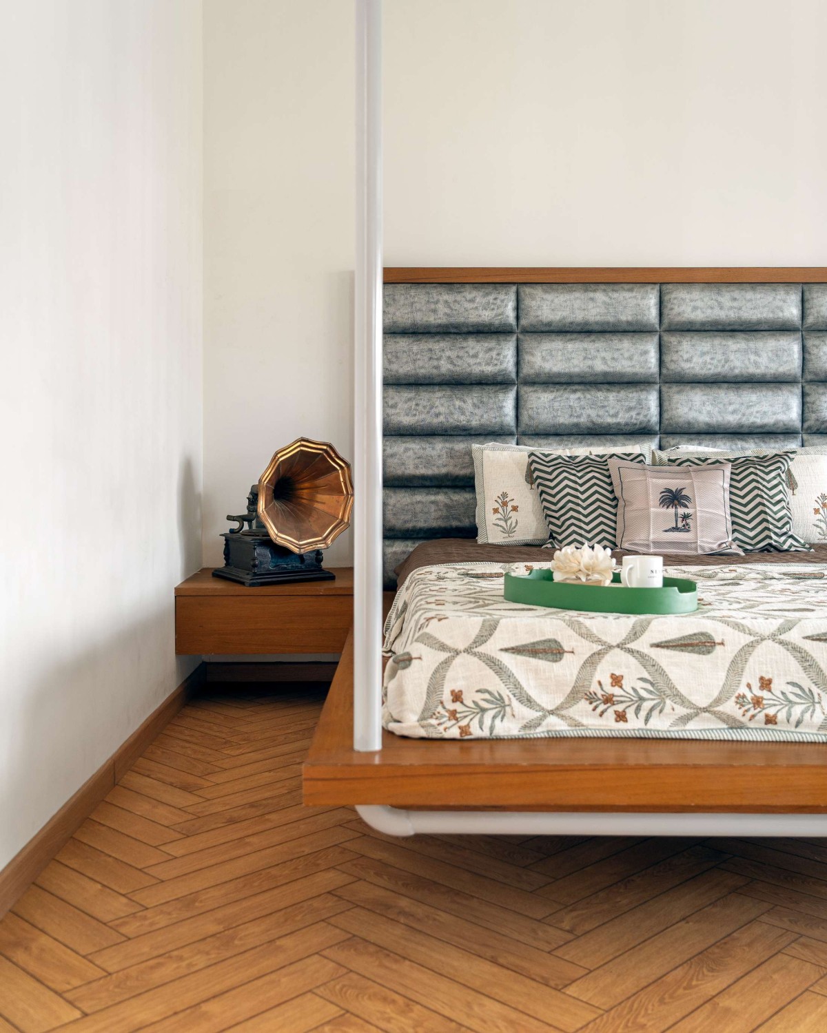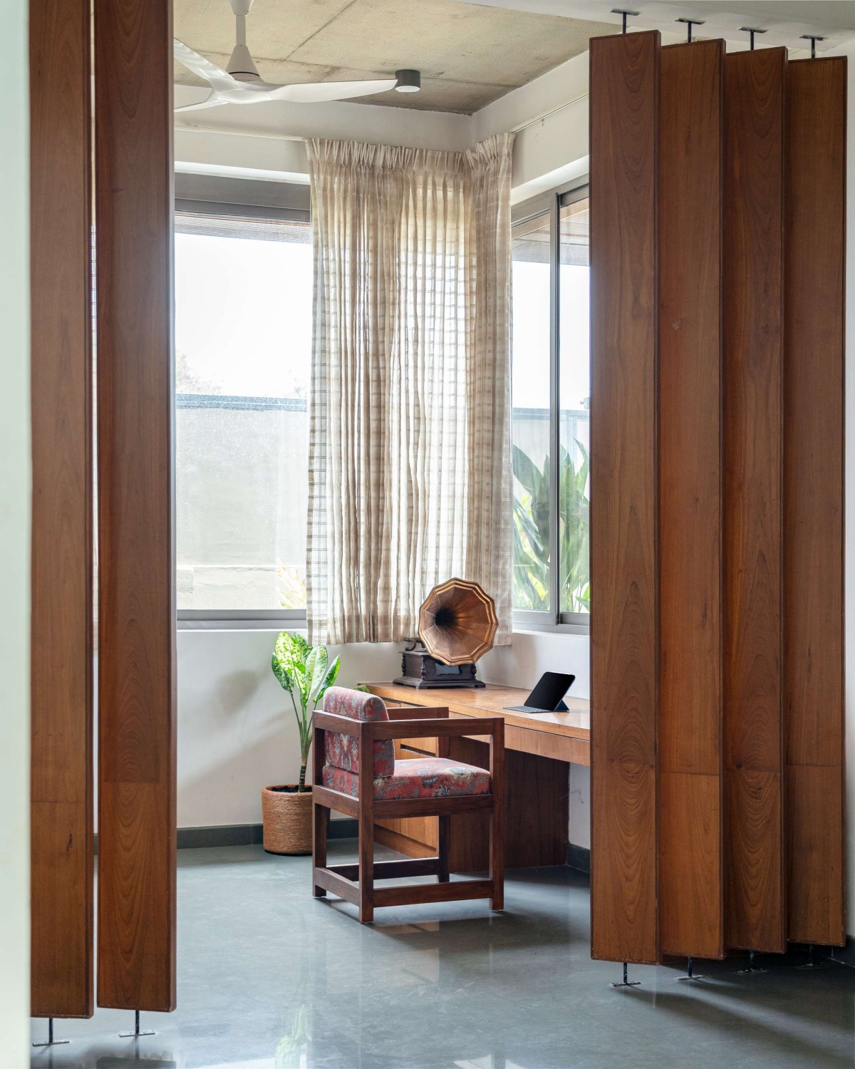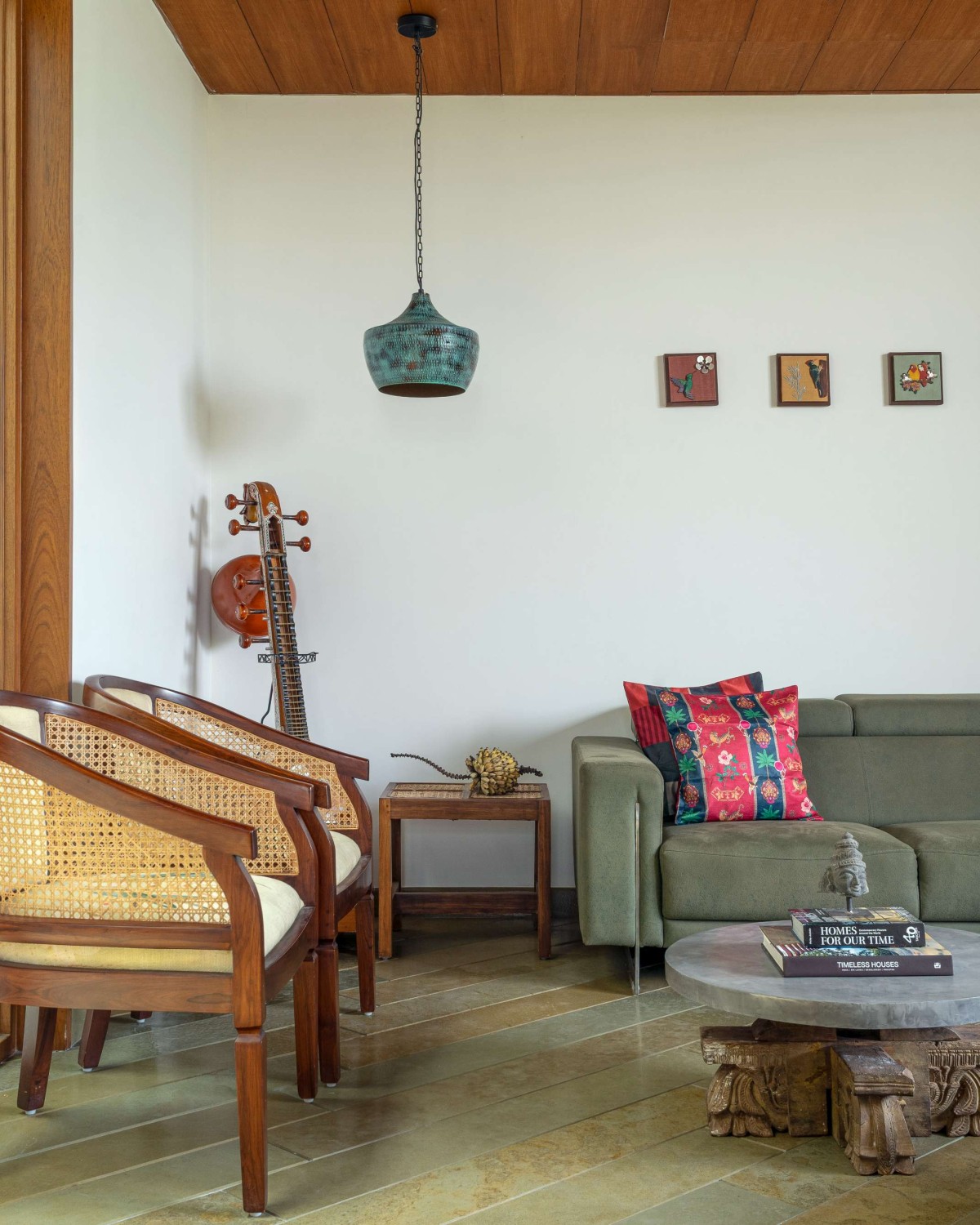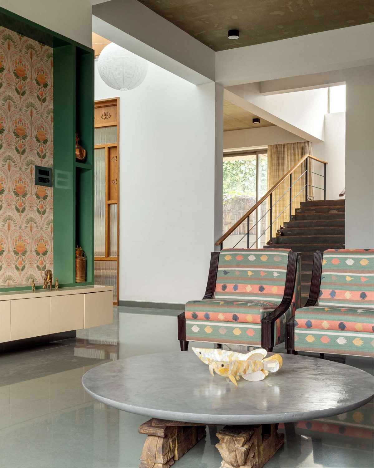 The material palette is kept deliberately neutral and grounded. Various patterns and inlays of Kota stone define the flooring across the home, providing both durability and thermal comfort. Ceilings in select areas are left exposed, revealing the natural texture of concrete, while teak wood accents in doors, trims, and screens add a tactile warmth and a sense of crafted elegance.