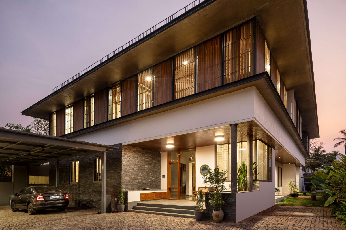 Wooden louvres line sections of the outer envelope, evoking the slatted construction of a traditional ranthal. At night, as warm light spills out through these screens, the house transforms — casting a patterned glow outward, illuminating its surroundings softly while preserving the sense of enclosure and privacy. It becomes a lantern in the urban fabric, glowing gently from within.
