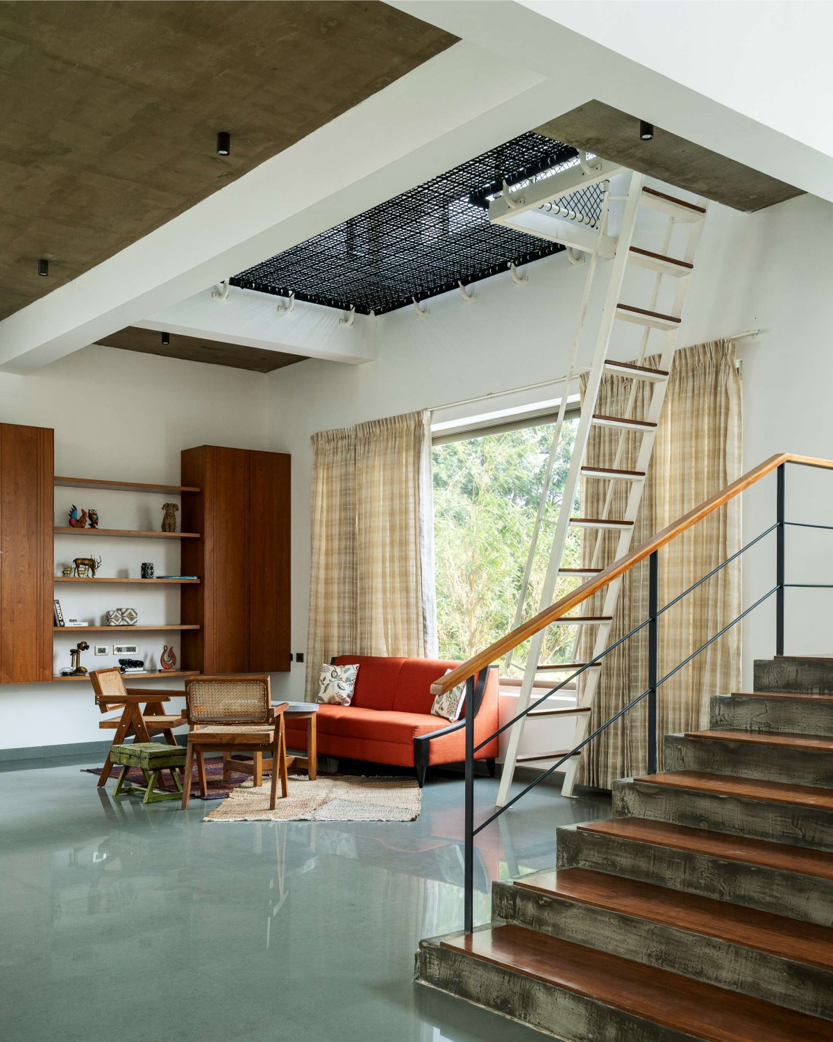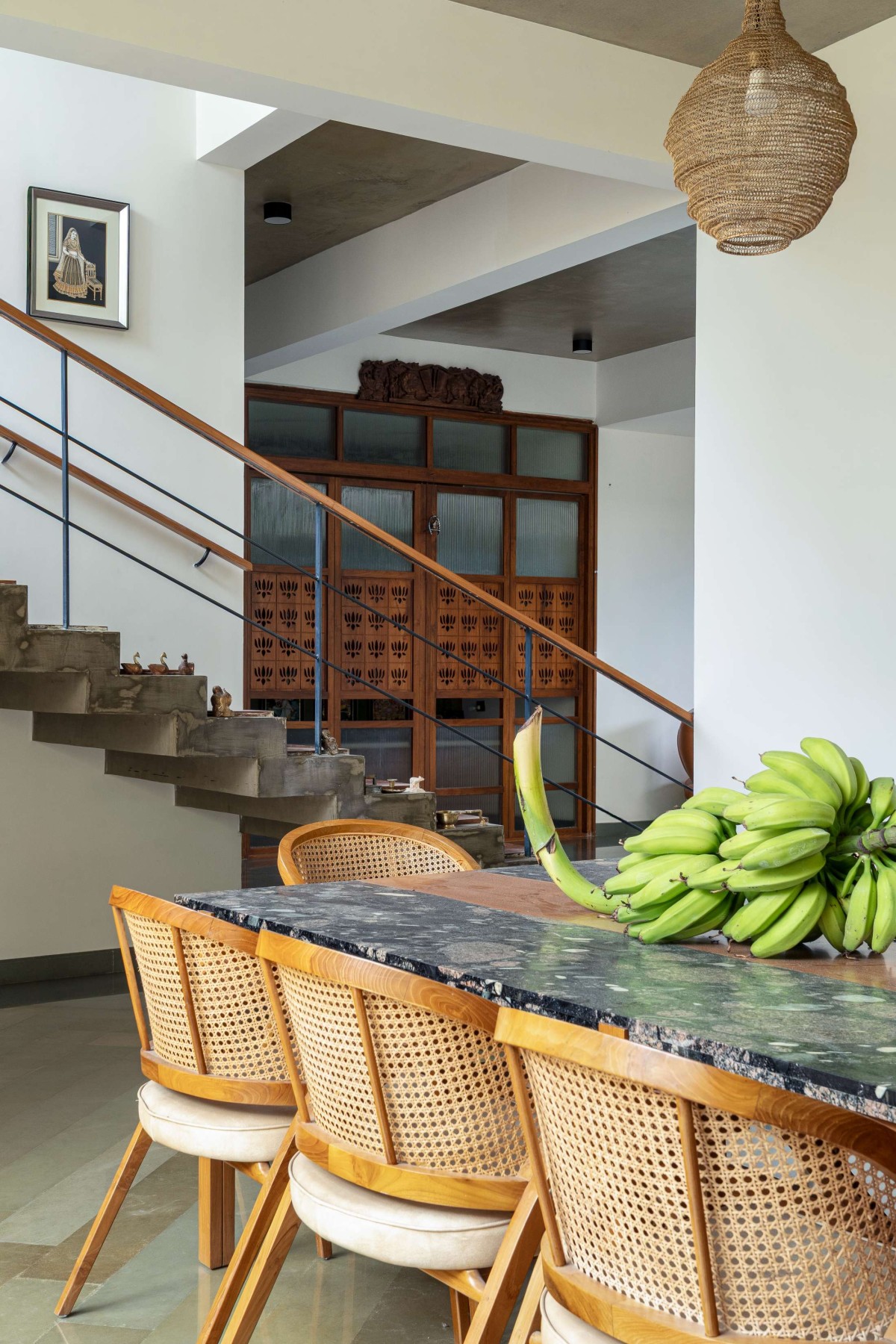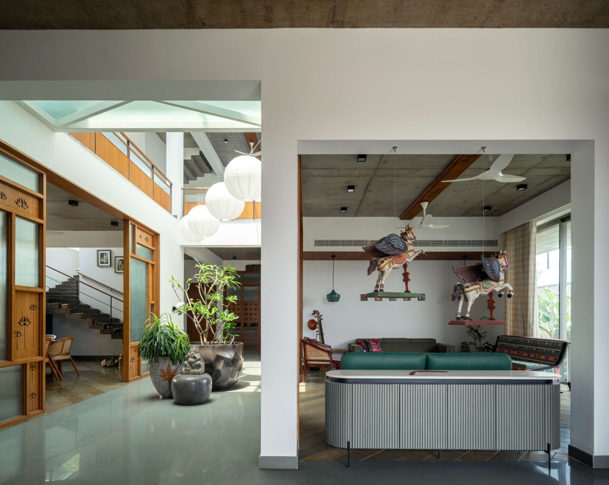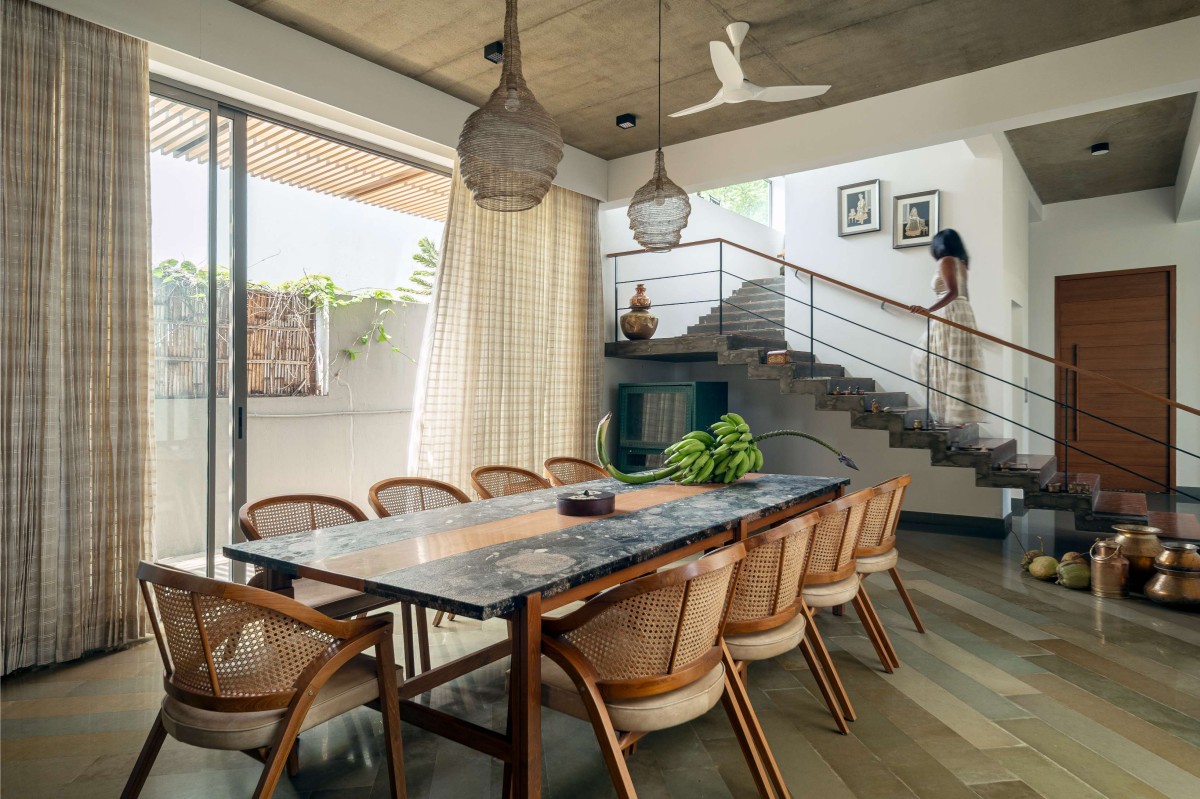 Entry into the home is marked by a modest foyer that opens into a double-height courtyard — the heart of the residence — aligned with a pooja room at its far end. This courtyard subtly divides the formal living area from the dining space while visually and spatially connecting the entire ground floor. A sculptural folded staircase in exposed concrete rises alongside the dining area, offering glimpses across levels and reinforcing the openness of the layout.