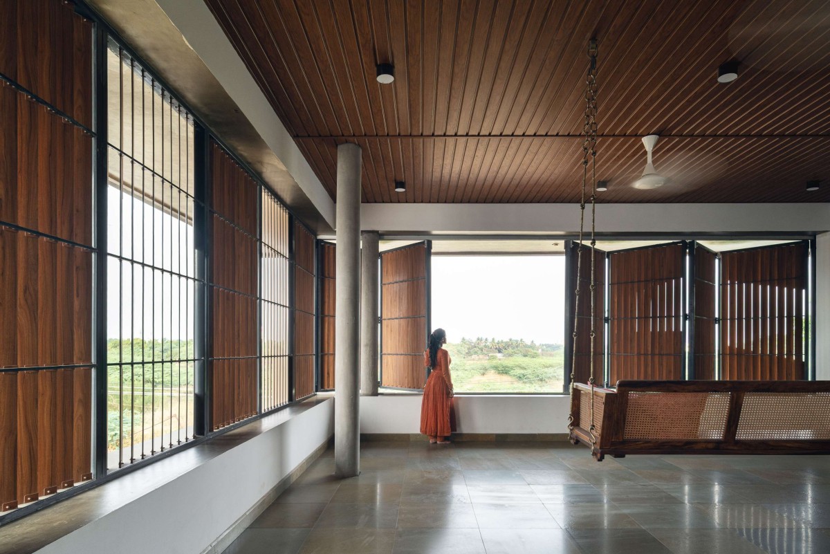 The ground floor houses two bedrooms positioned in the southwest and northwest corners, offering privacy and seclusion. The upper-level hosts three additional bedrooms. The rooms on the northern side open to balconies fitted with vertical wooden screens, which offer privacy while reducing direct solar gain. These shaded transitional spaces act as buffers, protecting the interiors from Coimbatore’s harsh sun while creating outdoor extensions of the bedrooms.